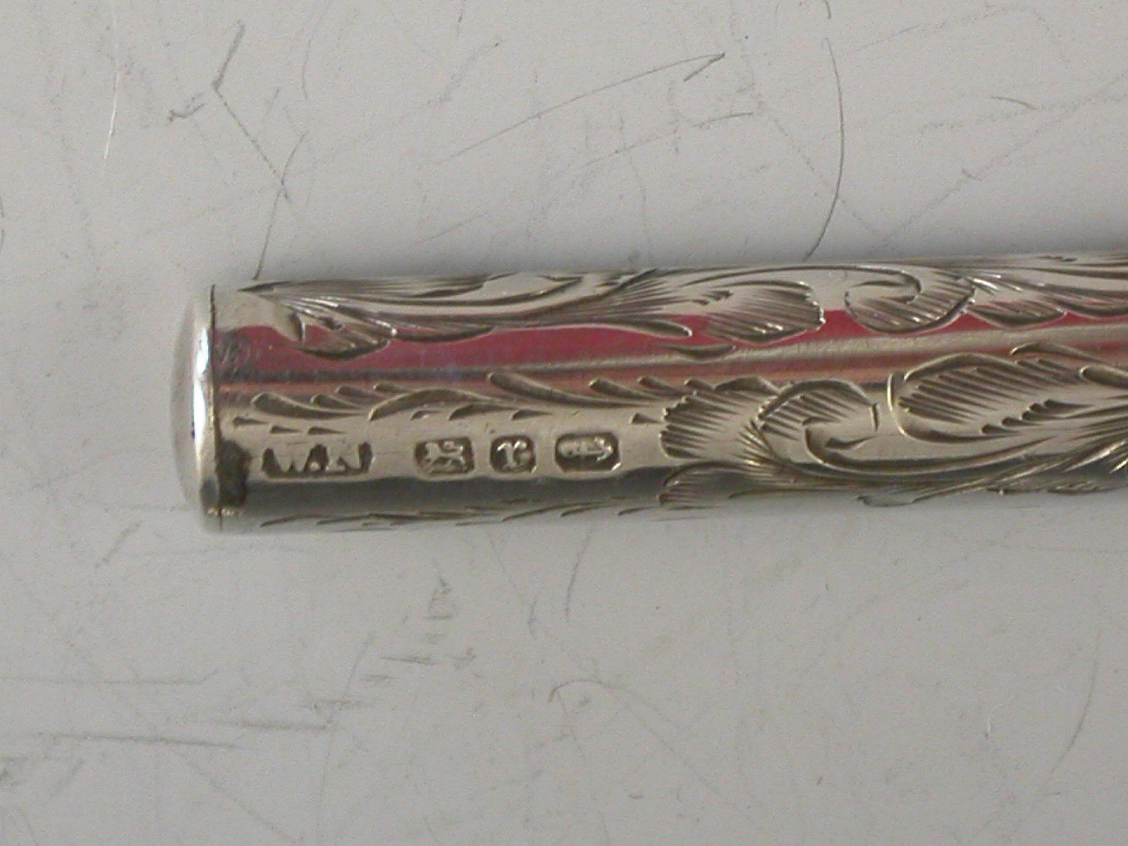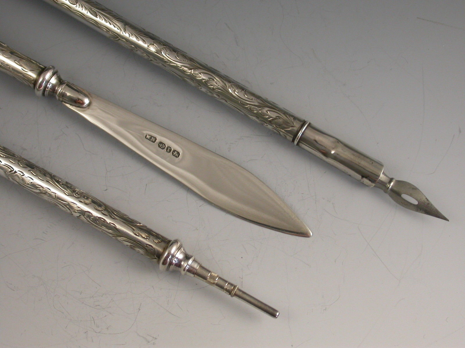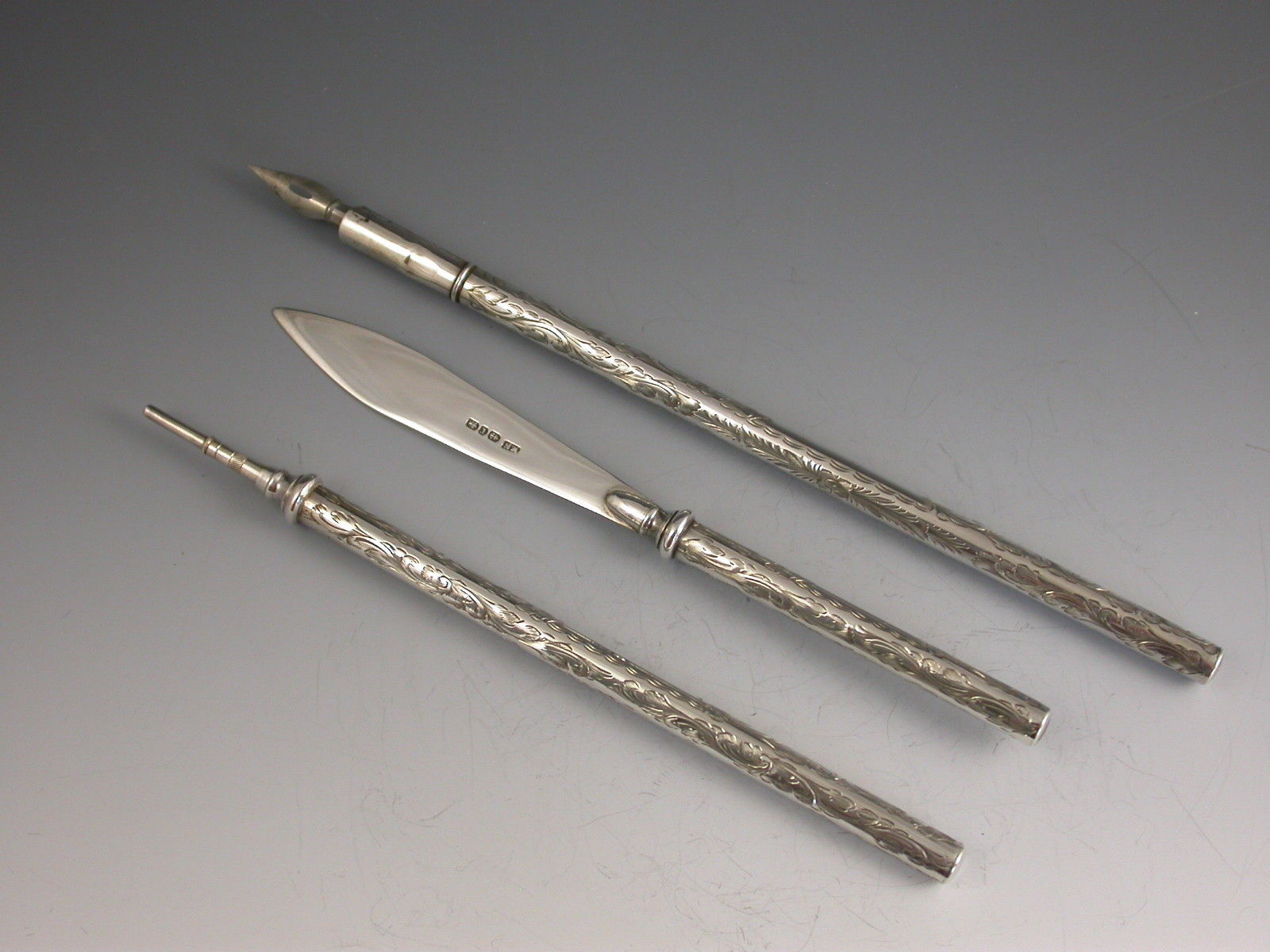 A good quality Victorian silver three piece Writing Set consisting of Dip Pen, Propelling Pencil and Paper Knife, the cylindrical barrels engraved with foliate decoration. Complete with original red silk and velvet lined leather case.