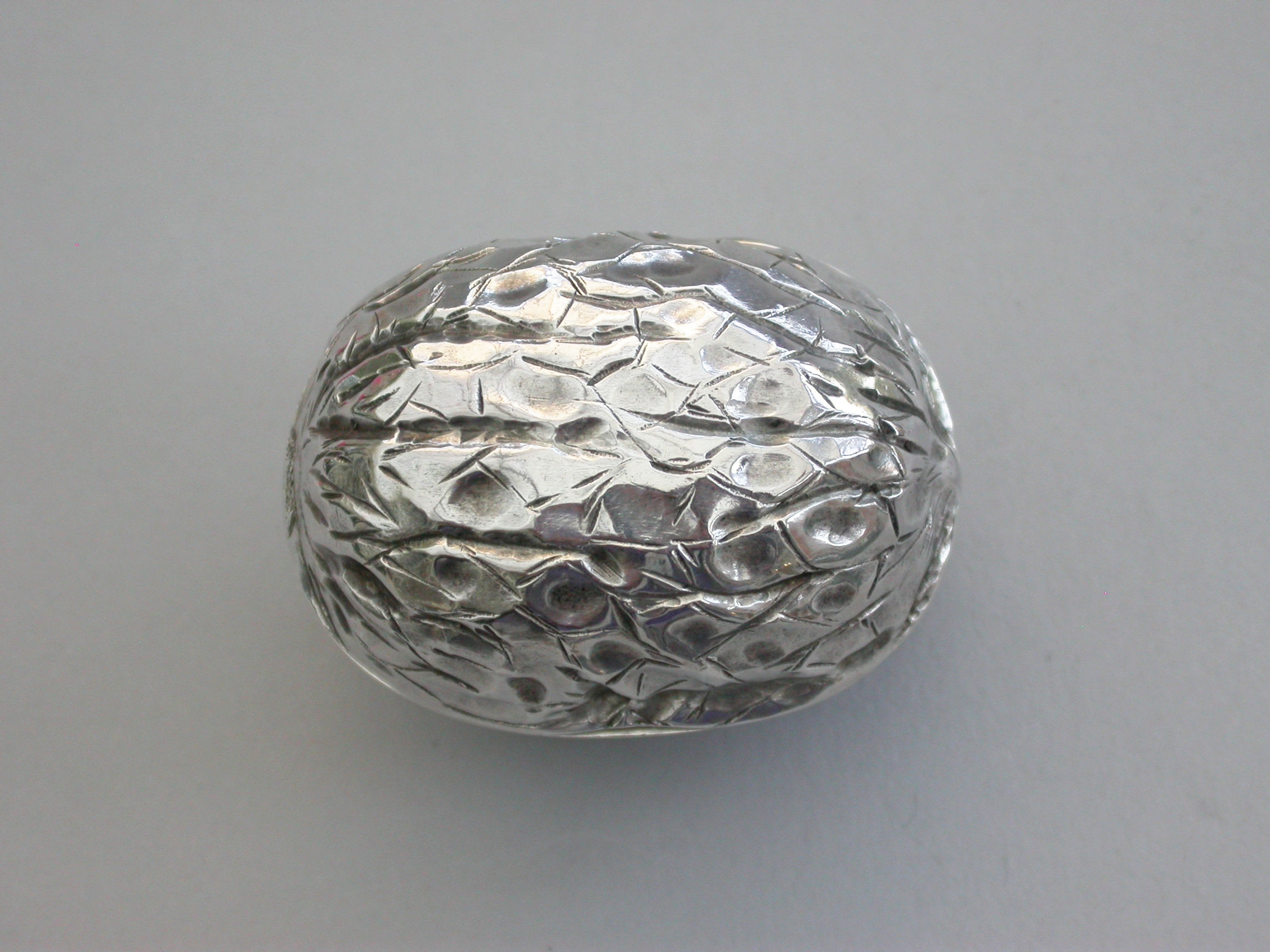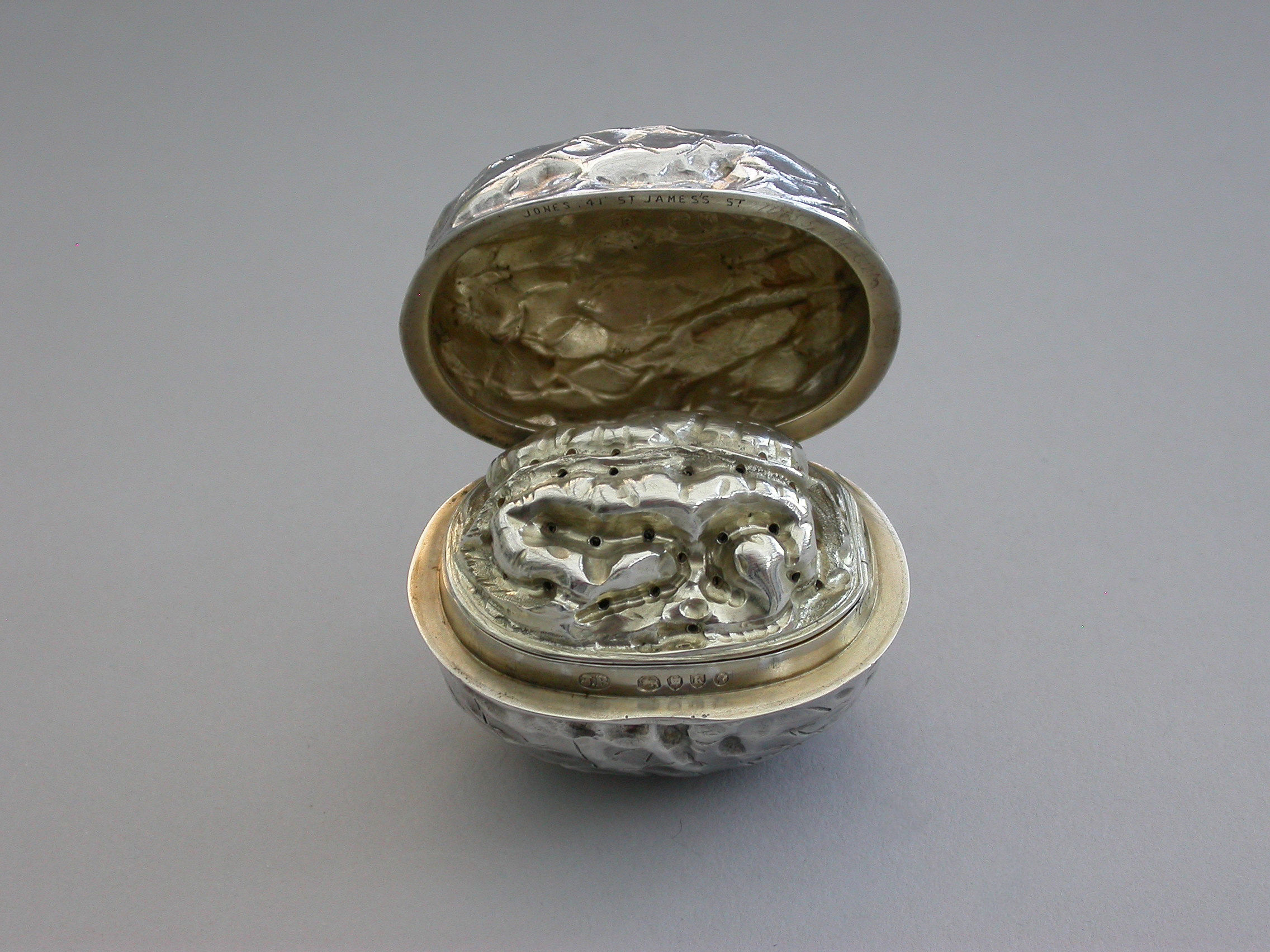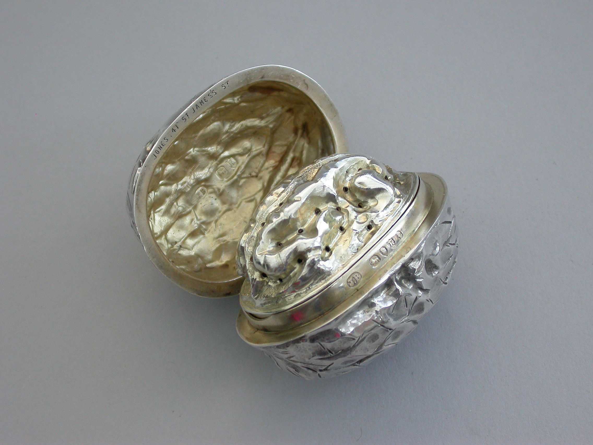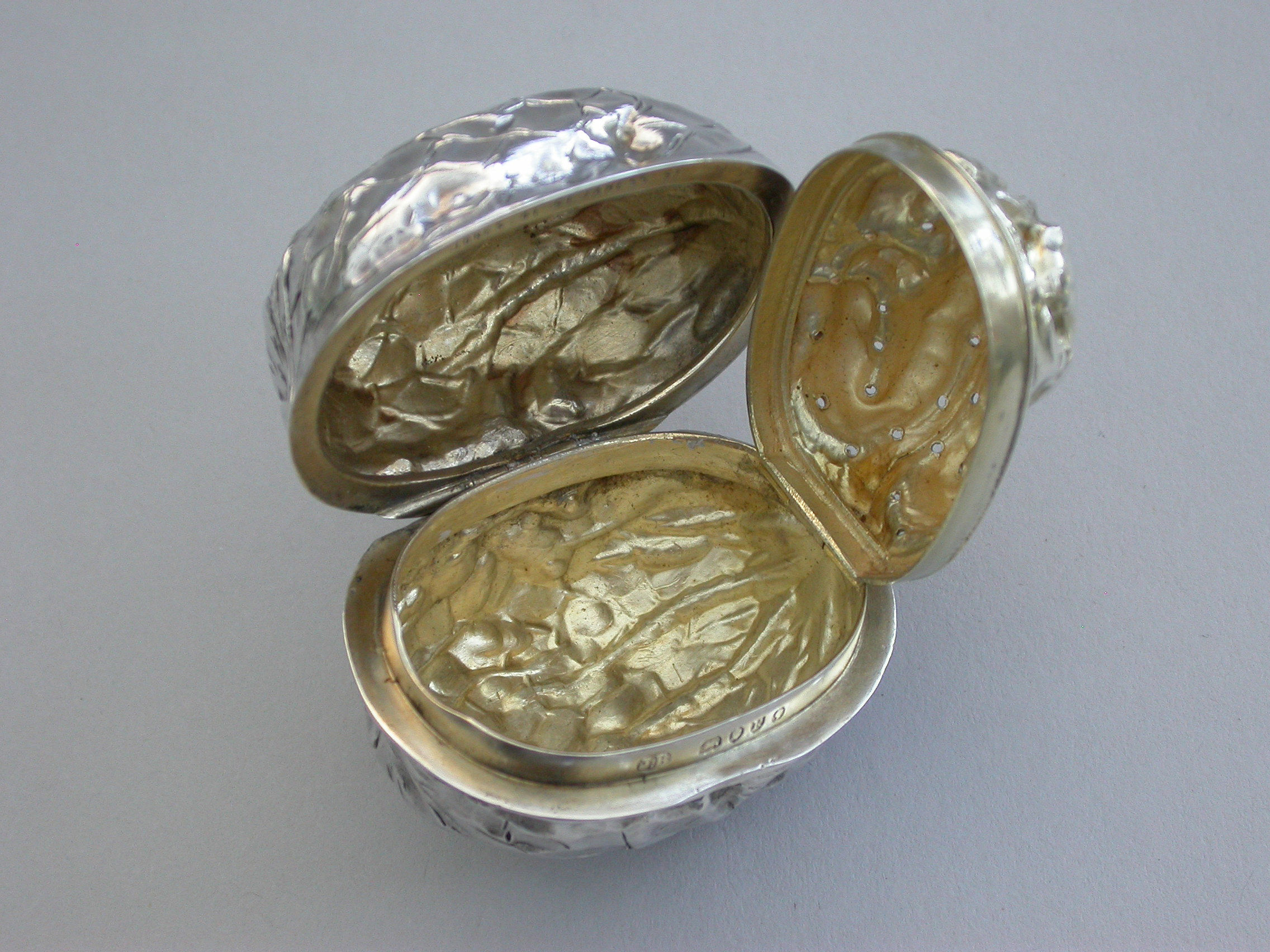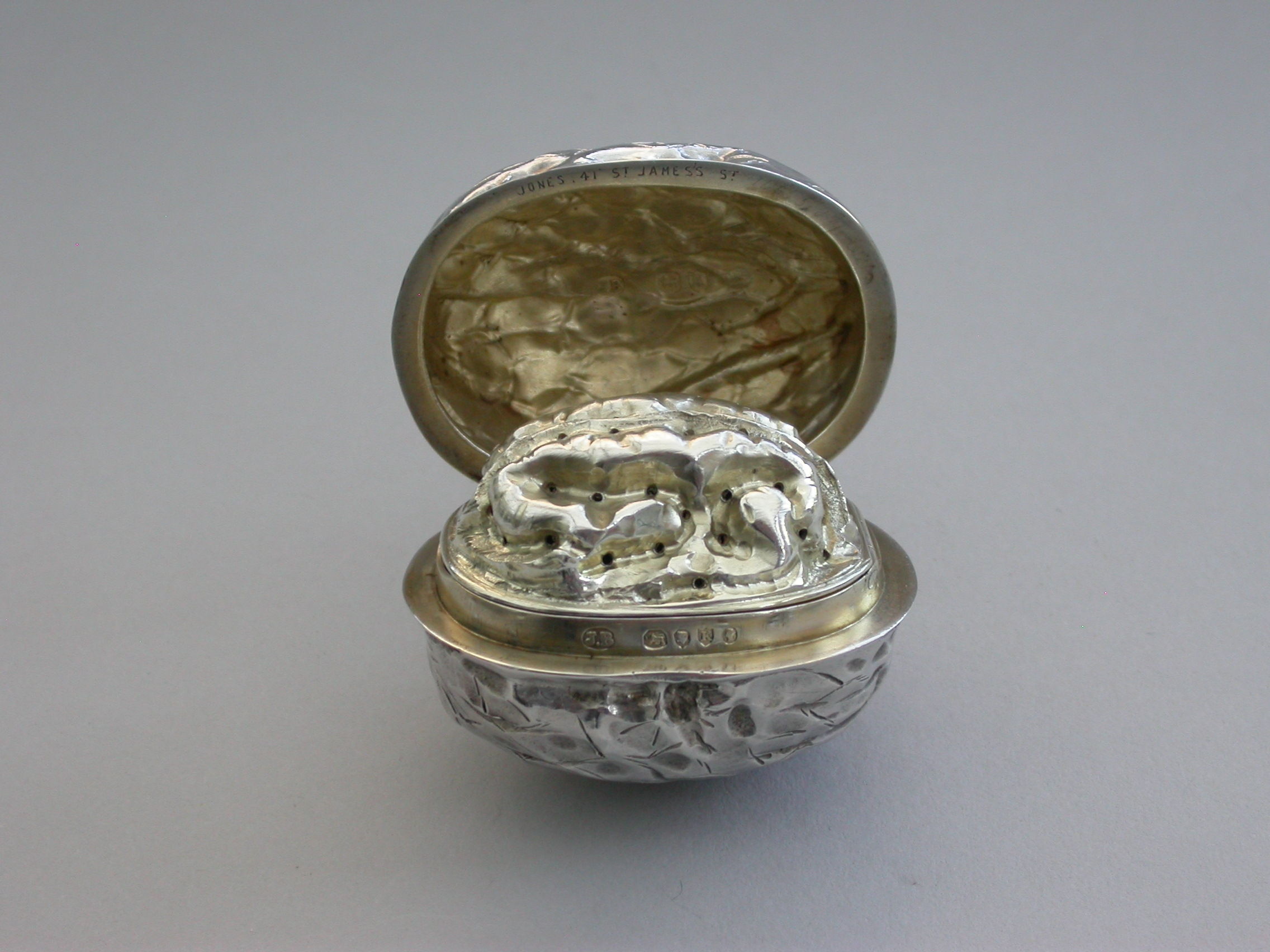 An extremely rare and fine quality Victorian novelty silver Vinaigrette naturalistically formed as a walnut, the lid and base as the shell and the grille as the nut, with randomly pierced holes.