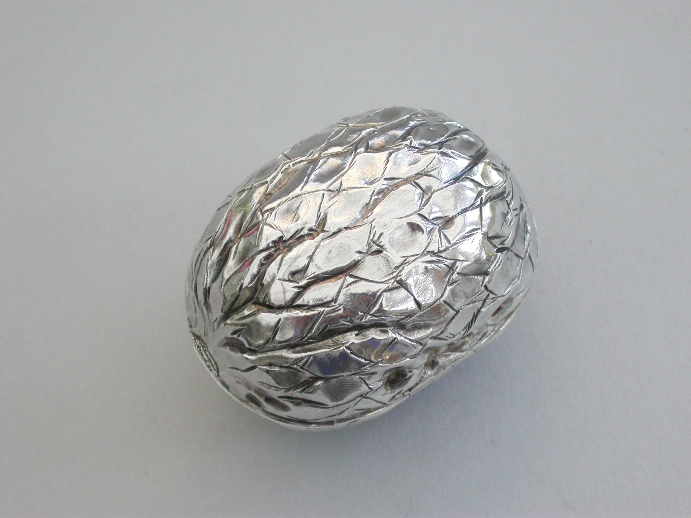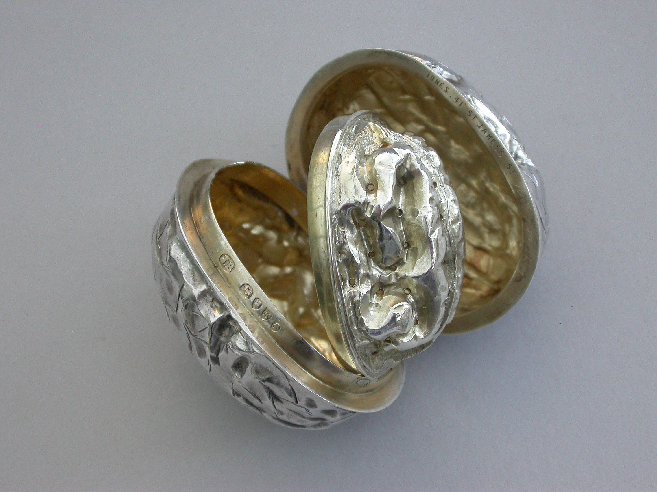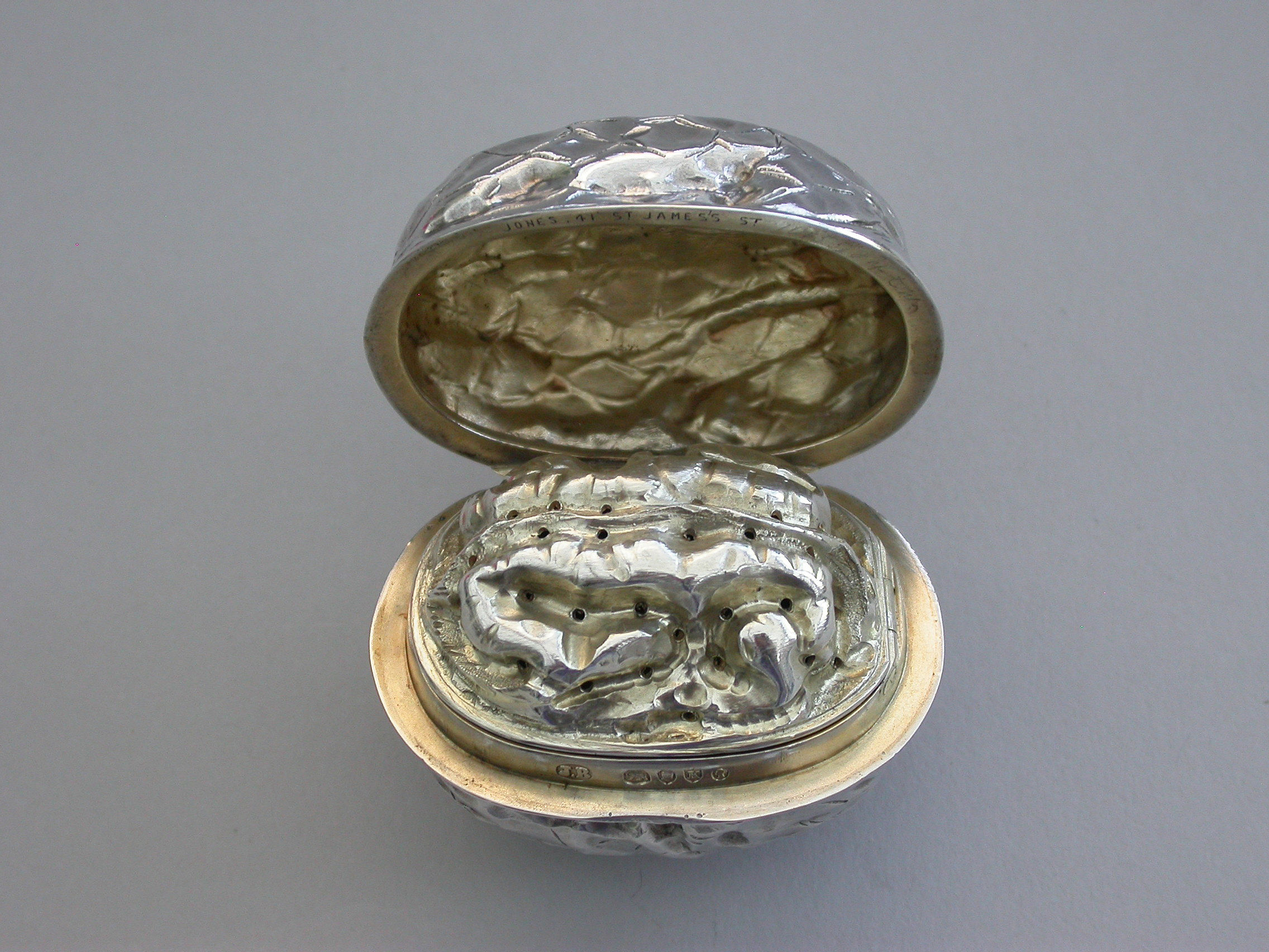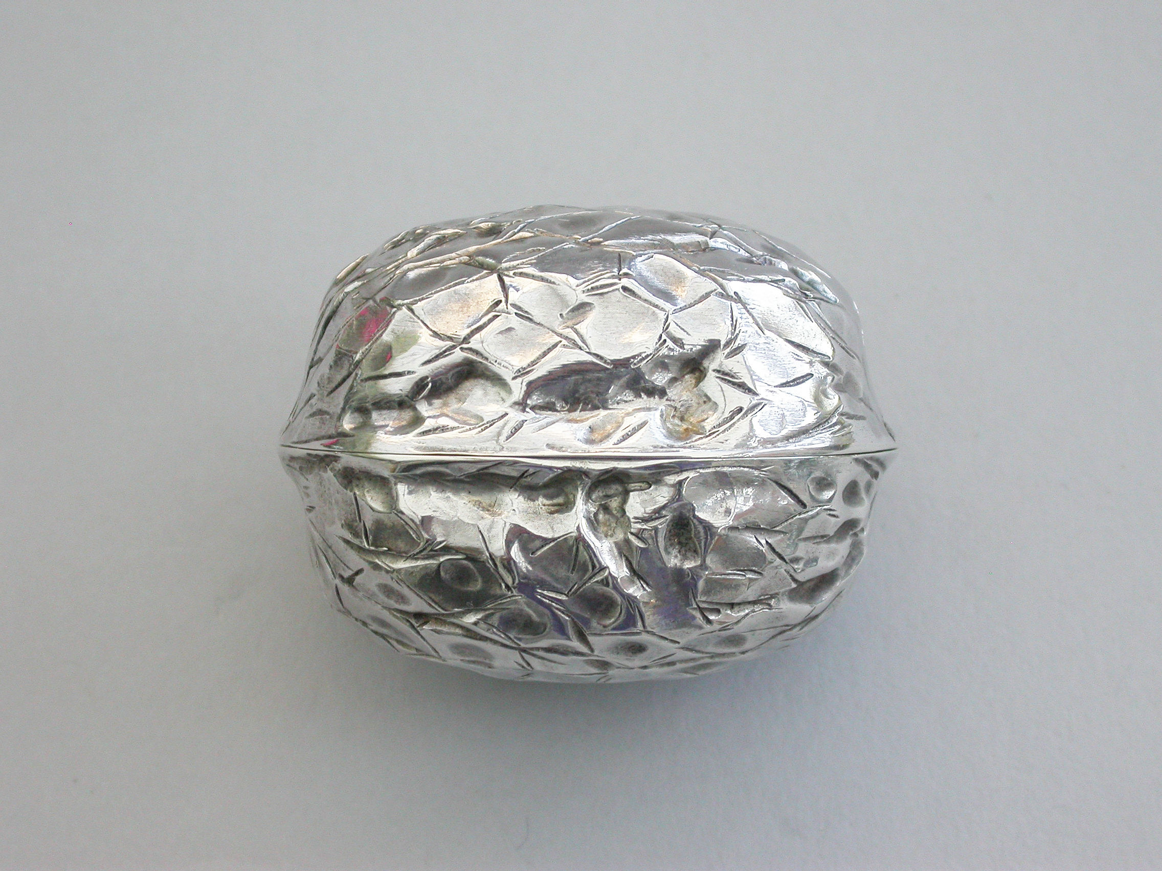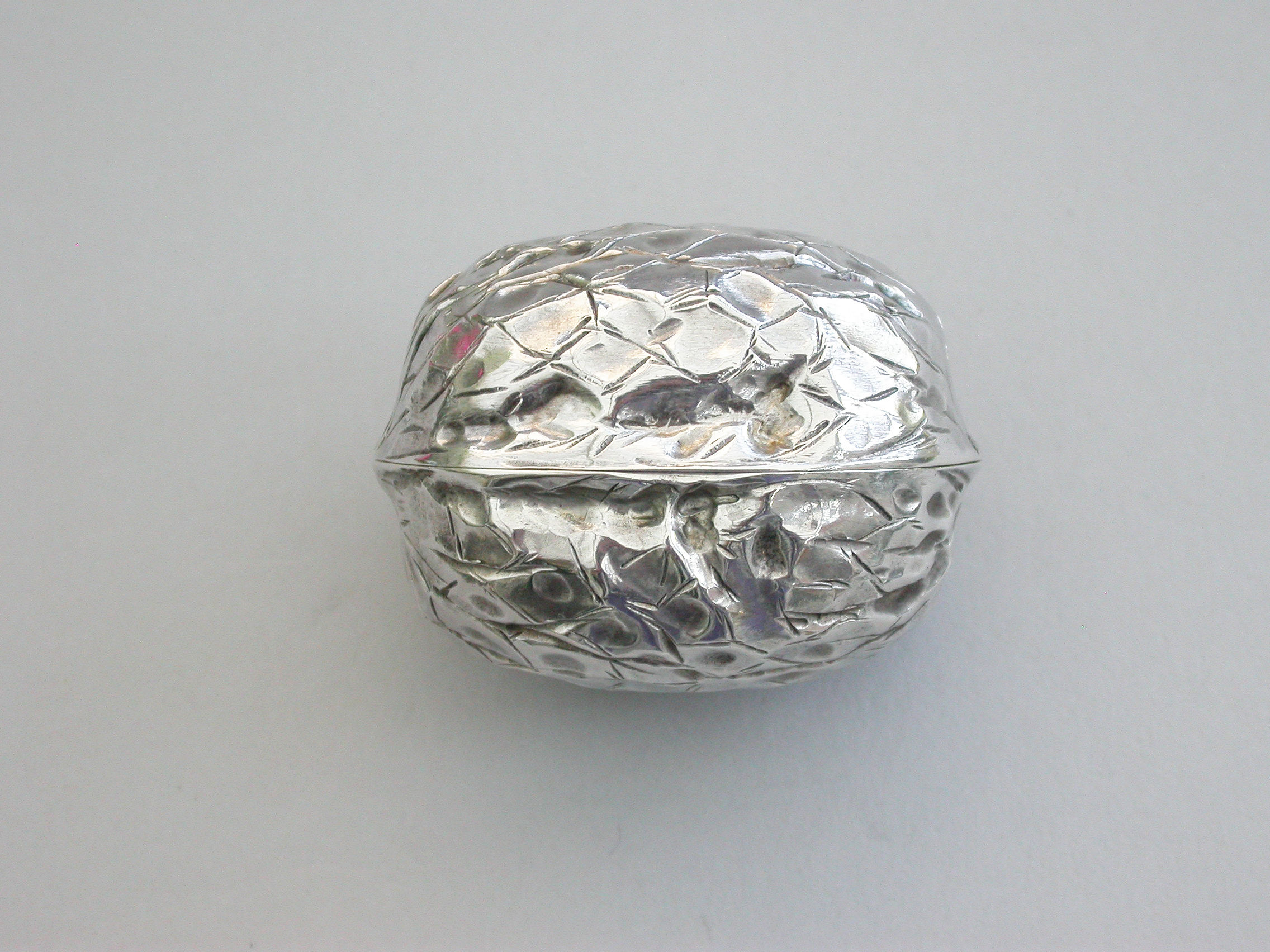 An extremely rare and fine quality Victorian novelty silver Vinaigrette naturalistically formed as a walnut, the lid and base as the shell and the grille as the nut, with randomly pierced holes.