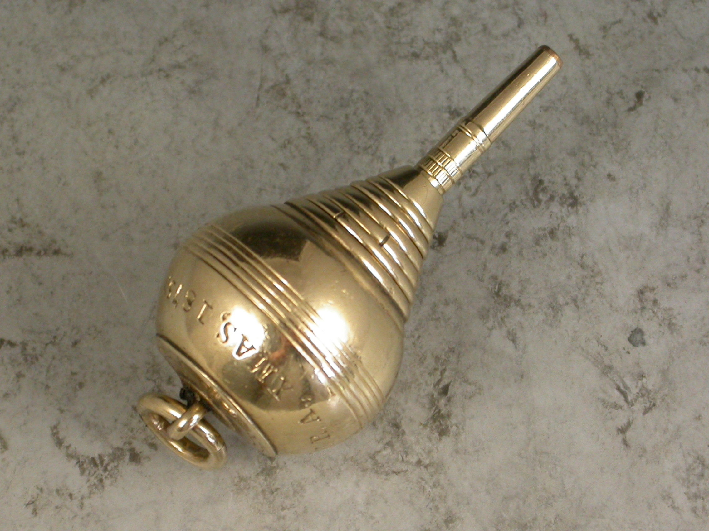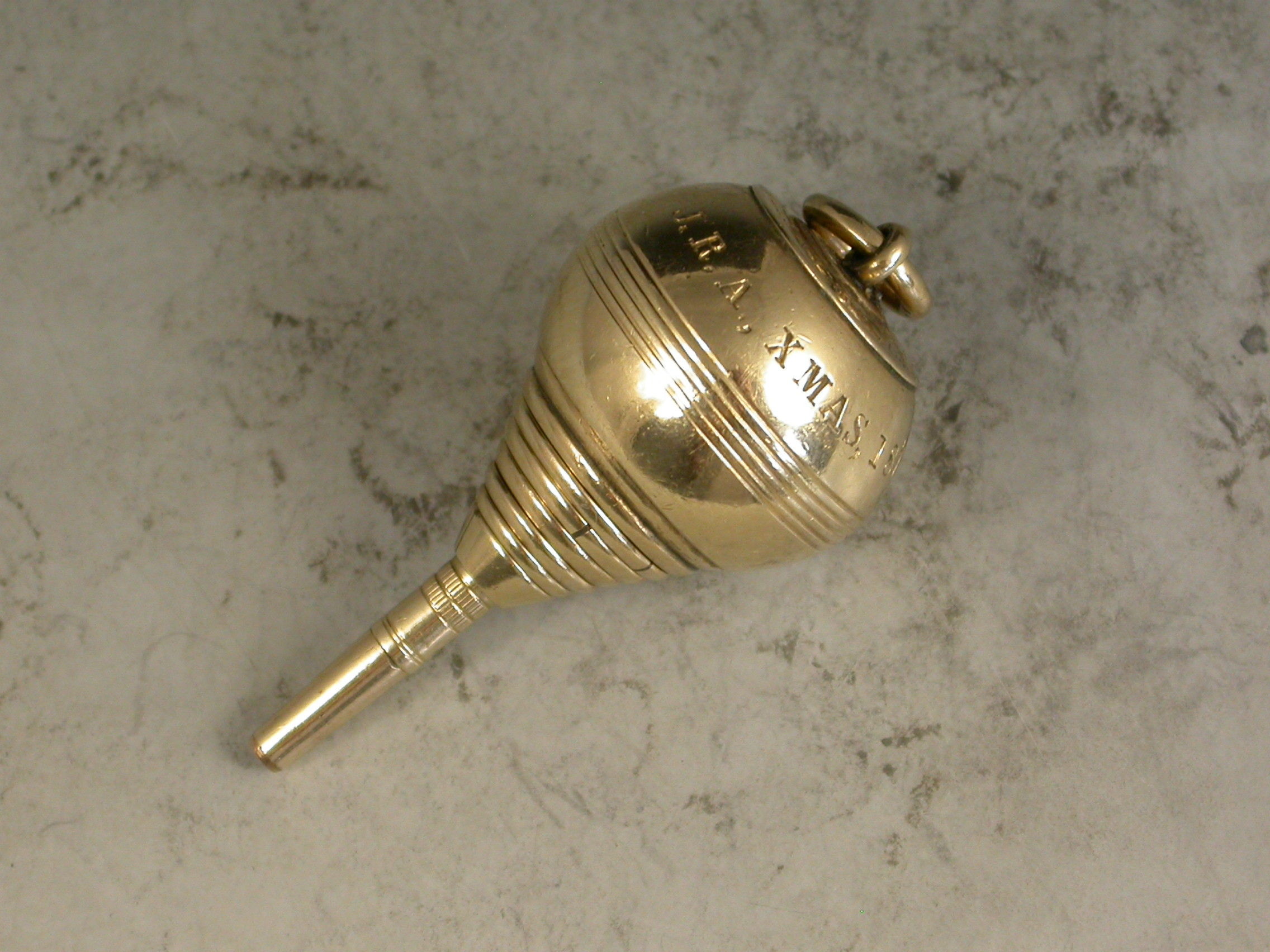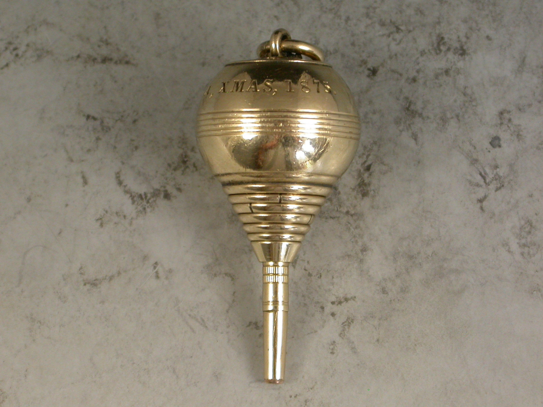 A very rare Victorian novelty 10 carat gold six-drawer telescopic Propelling Pencil made in the form of a Plumb Bob or Spinning Top, each section graduated to fit one inside the other when opened or closed. the circular body with attached suspension ring and reeded decoration. Engraved - 'J.R.A., XMAS 1875'.