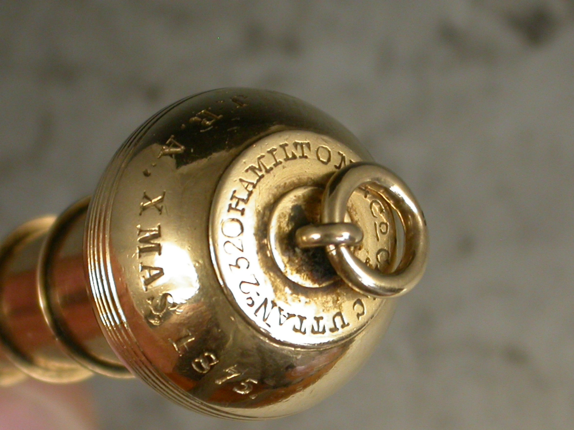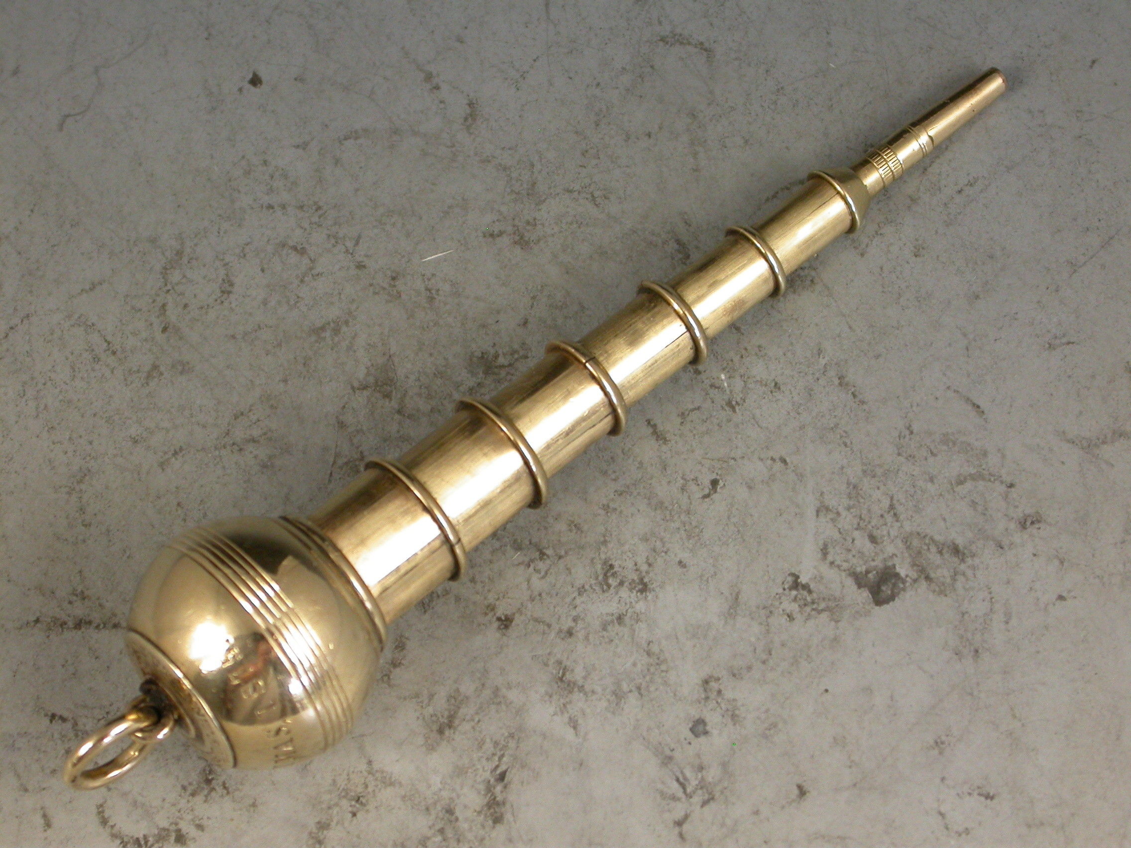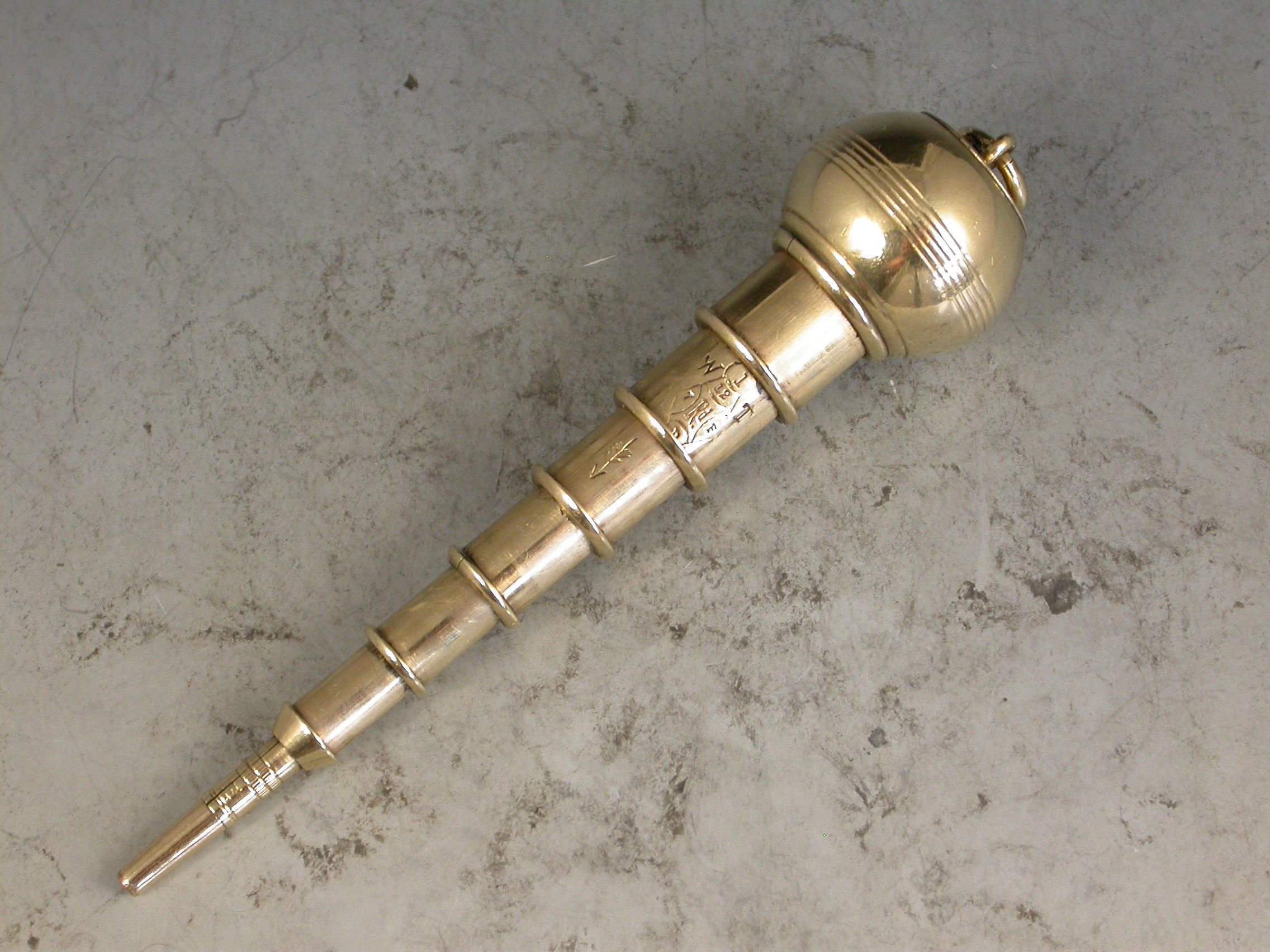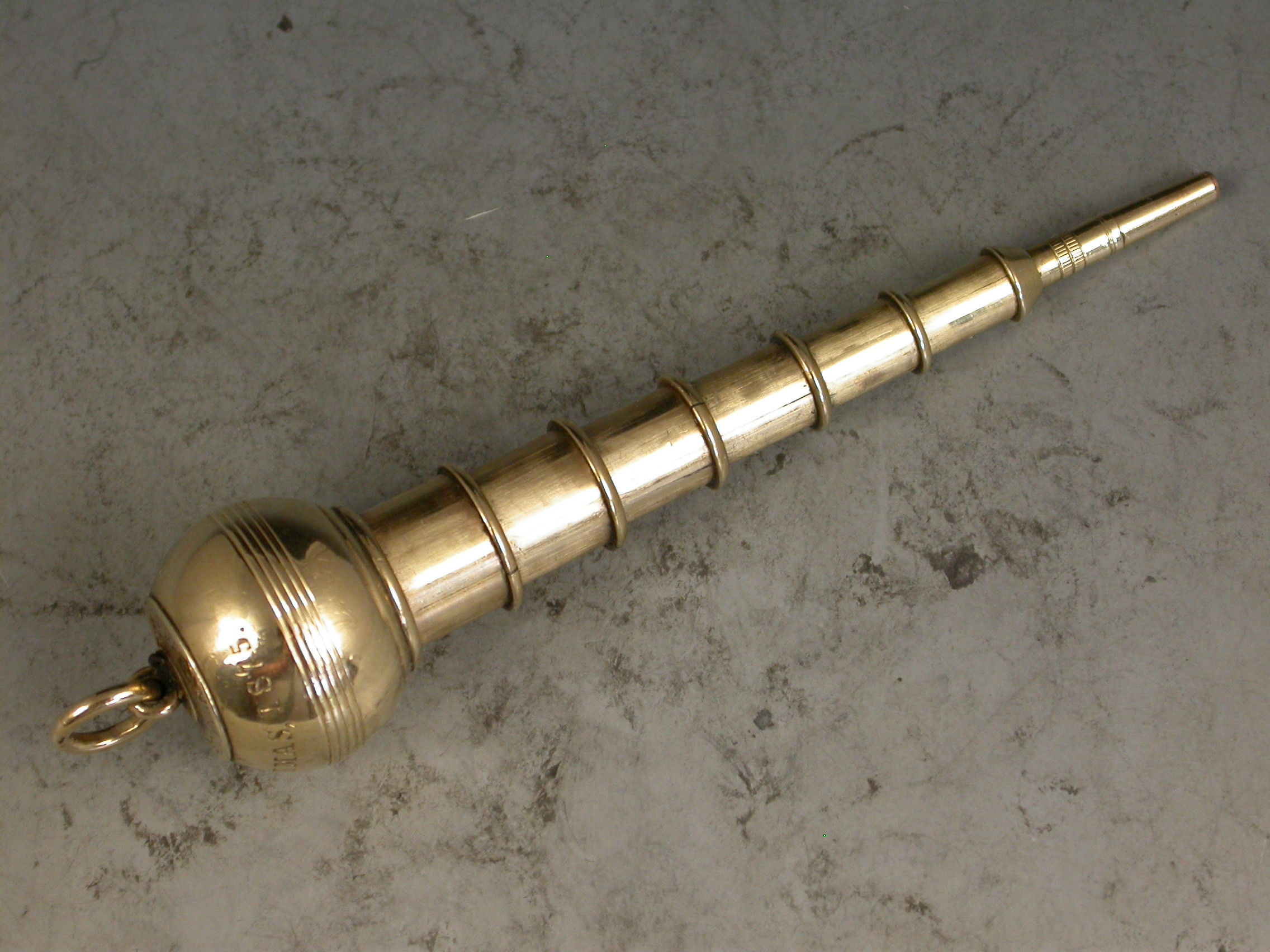 A very rare Victorian novelty 10 carat gold six-drawer telescopic Propelling Pencil made in the form of a Plumb Bob or Spinning Top, each section graduated to fit one inside the other when opened or closed. the circular body with attached suspension ring and reeded decoration. Engraved - 'J.R.A., XMAS 1875'.