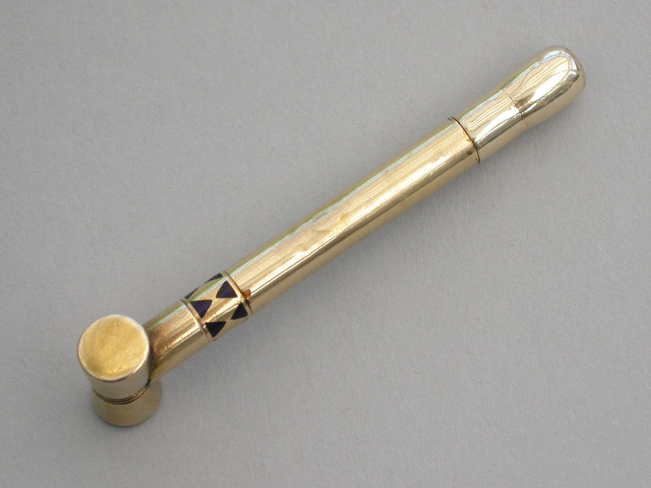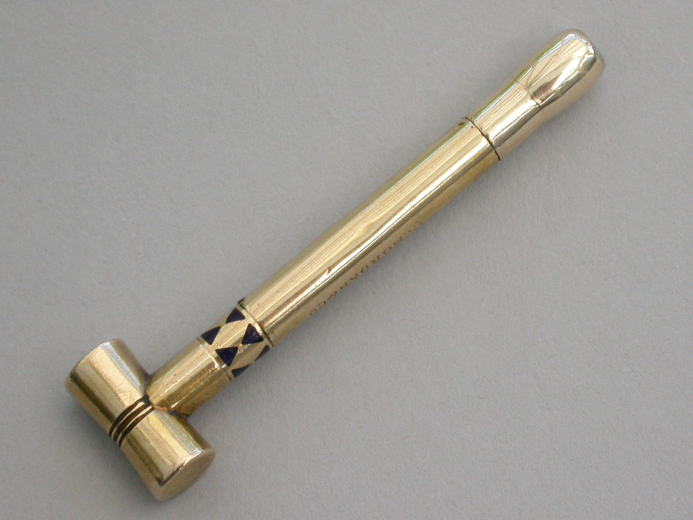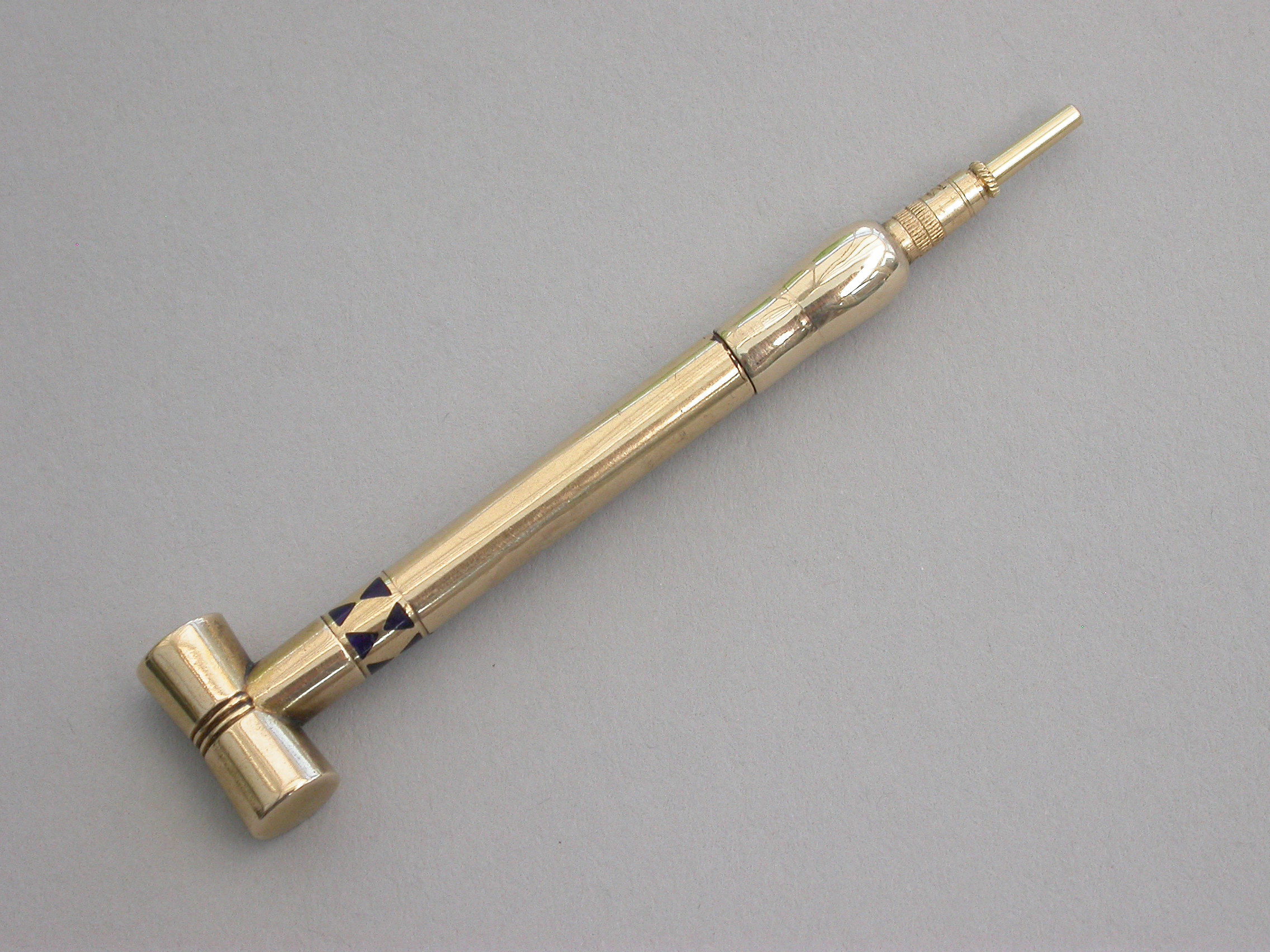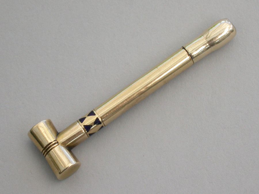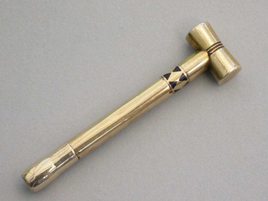 A rare Victorian novelty 16 carat gold (tested) Propelling Pencil made in the form of a Croquet Mallet with band of blue enamel decoration to the shaft. A twist action to propel the pencil.