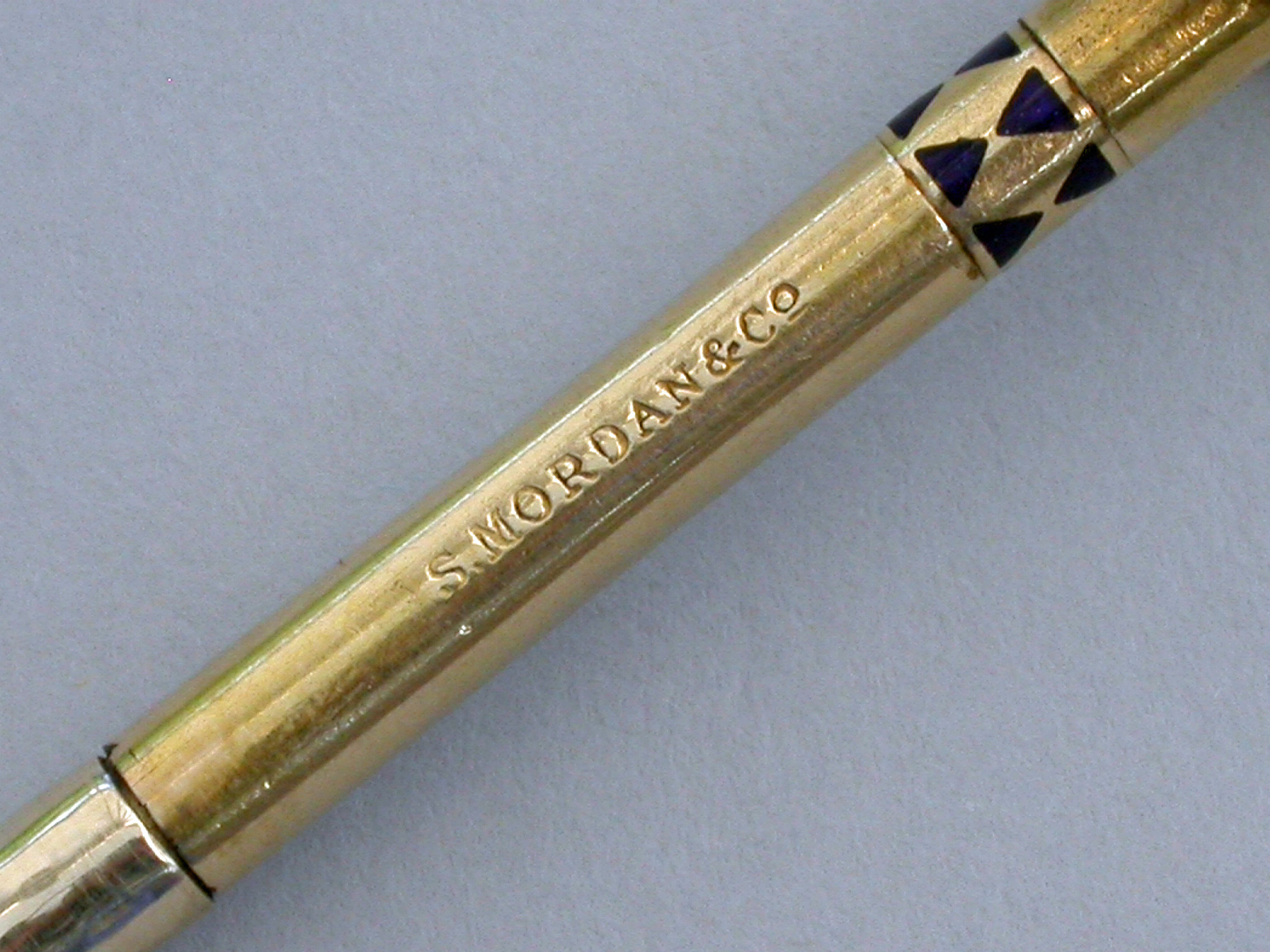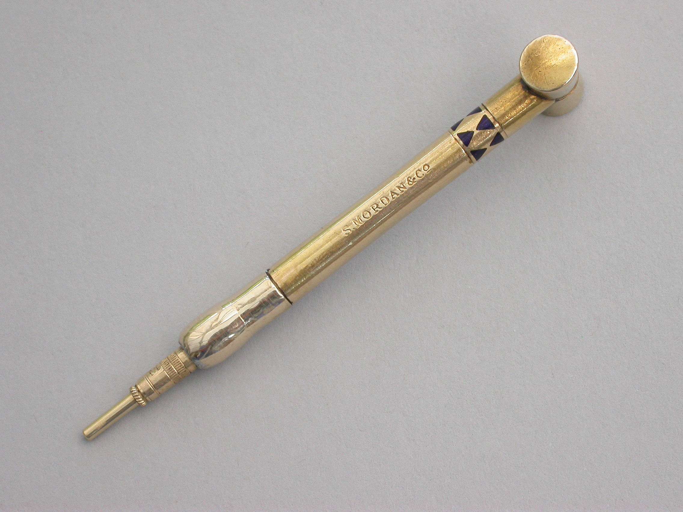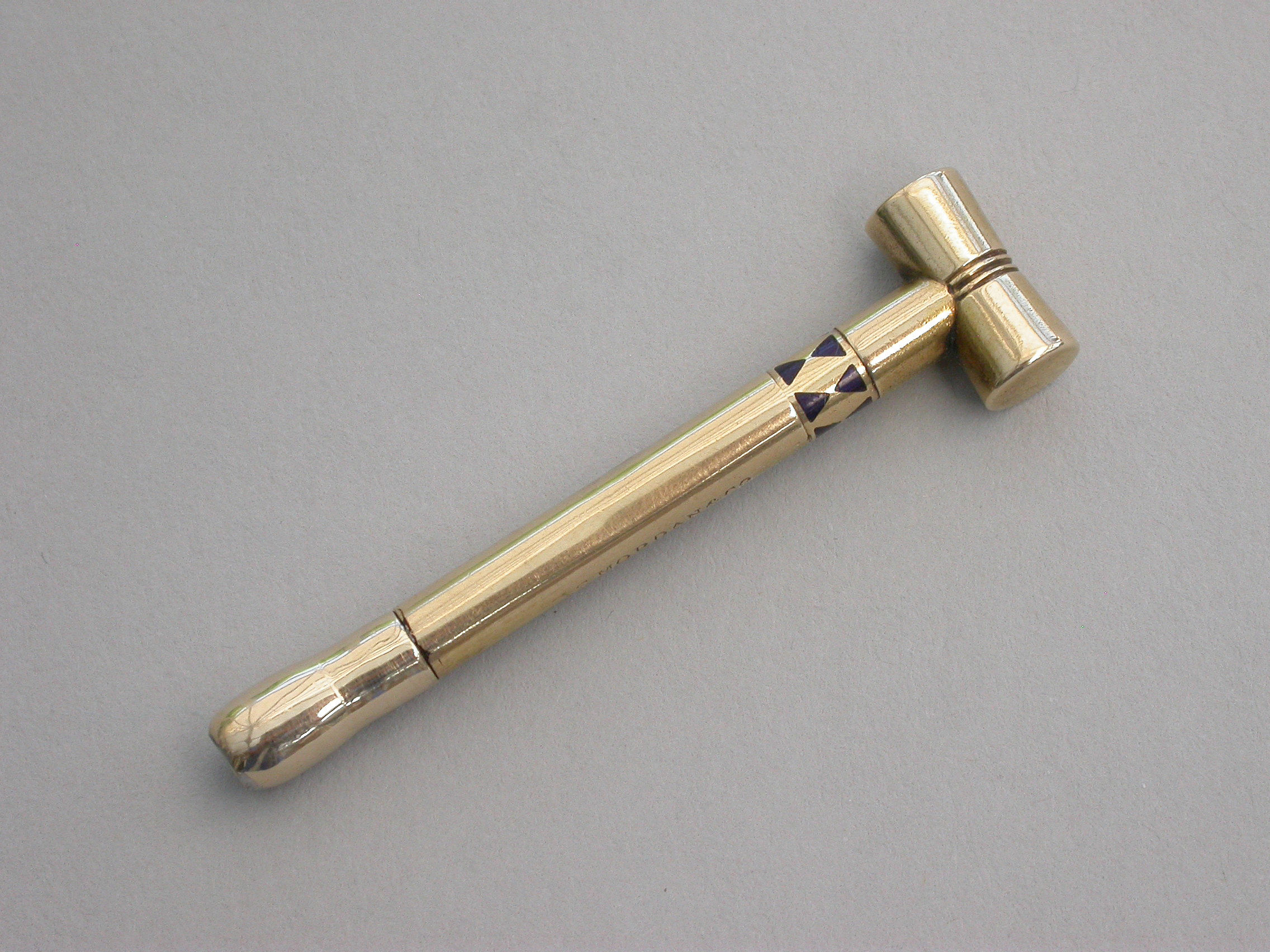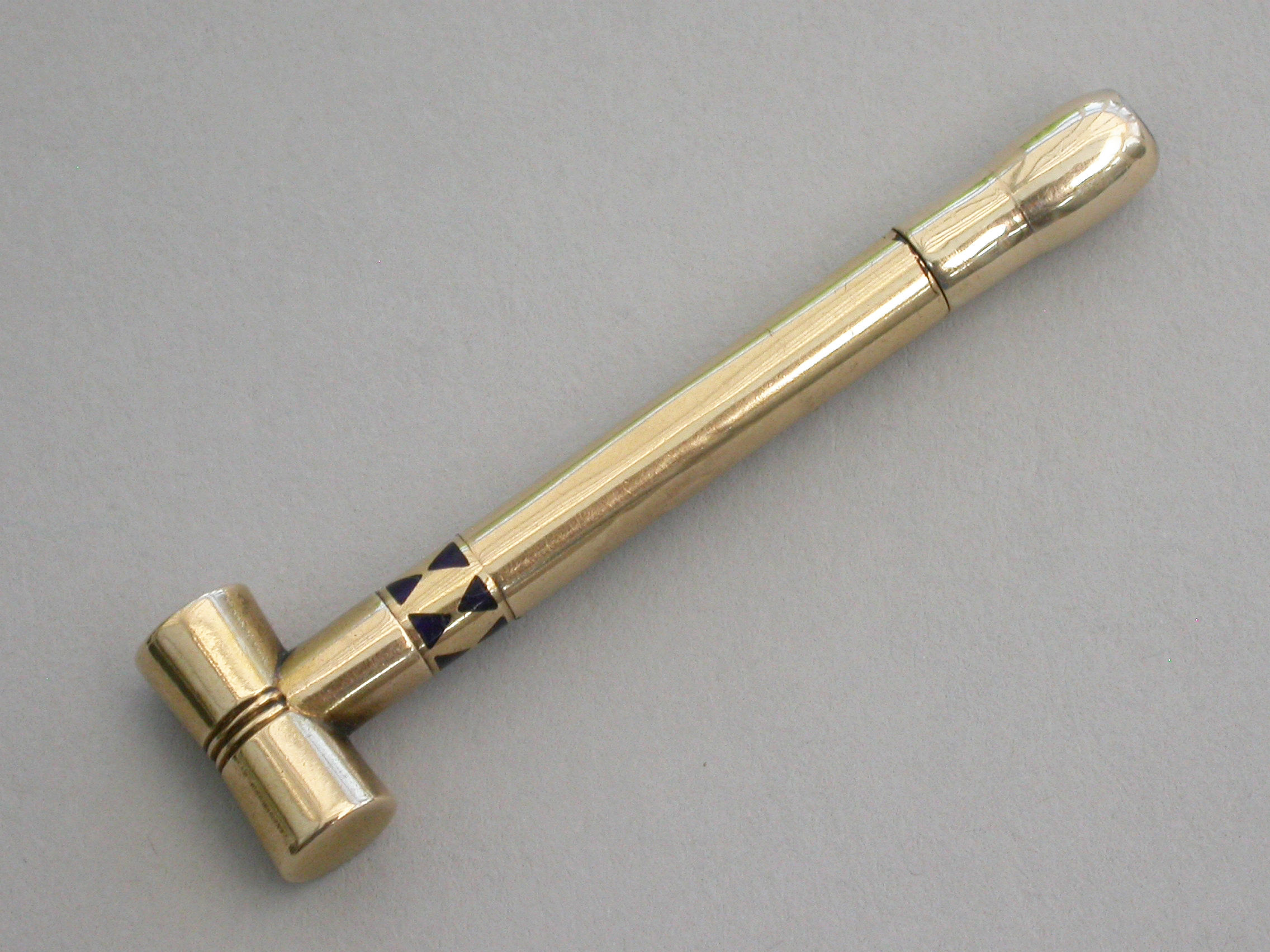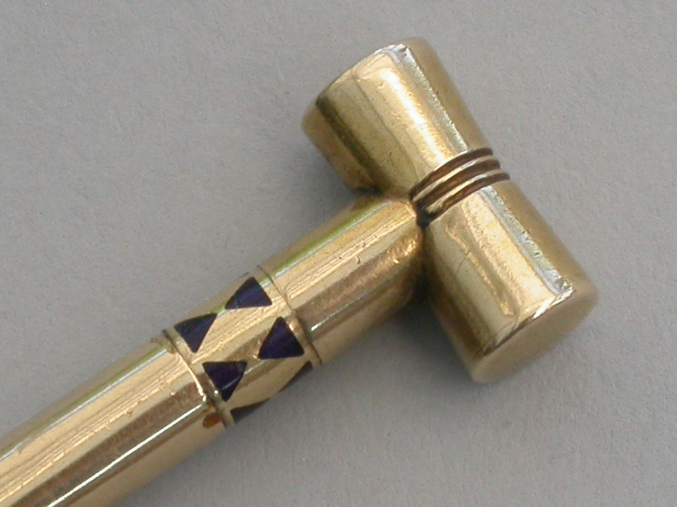 A rare Victorian novelty 16 carat gold (tested) Propelling Pencil made in the form of a Croquet Mallet with band of blue enamel decoration to the shaft. A twist action to propel the pencil.