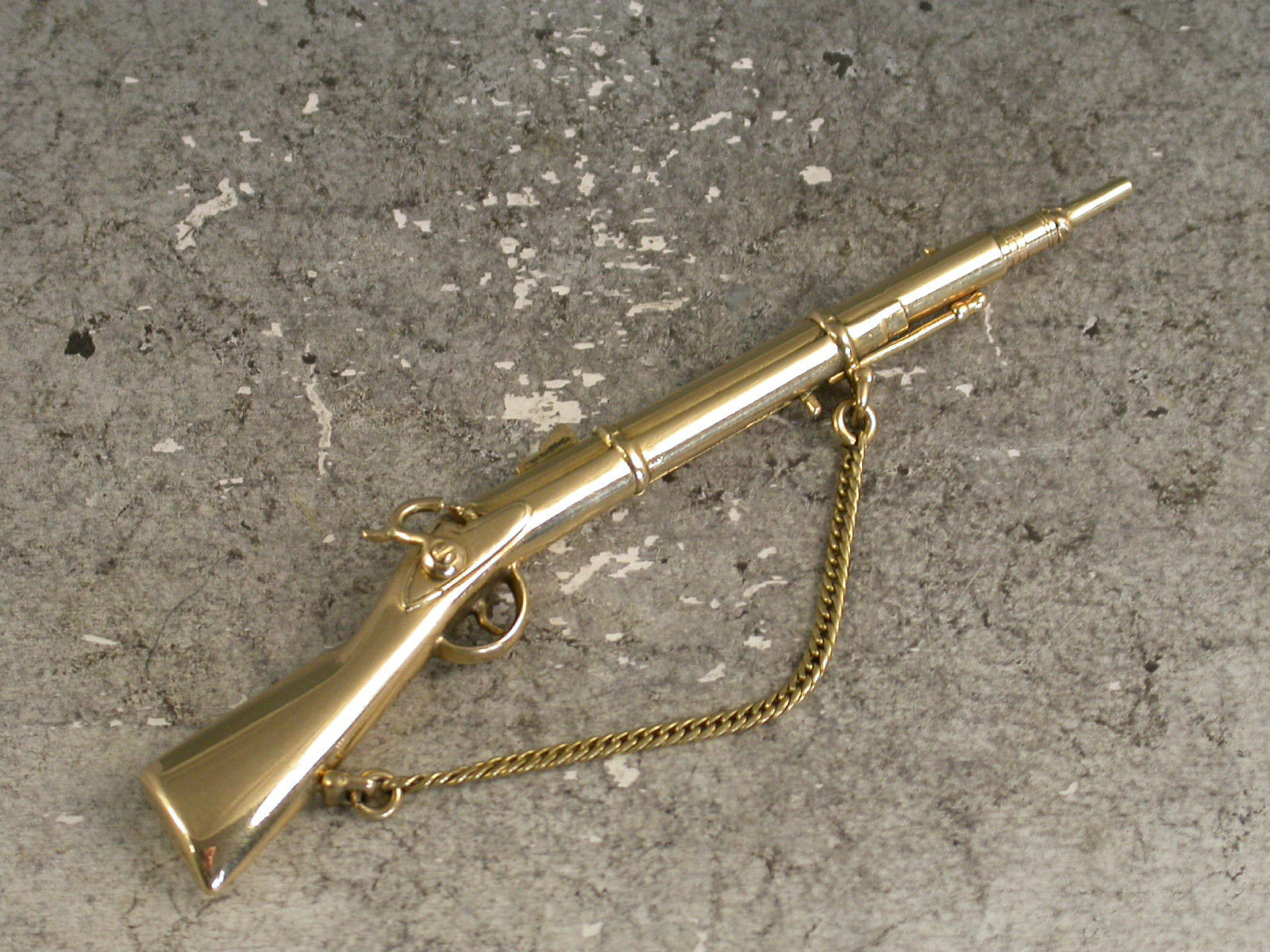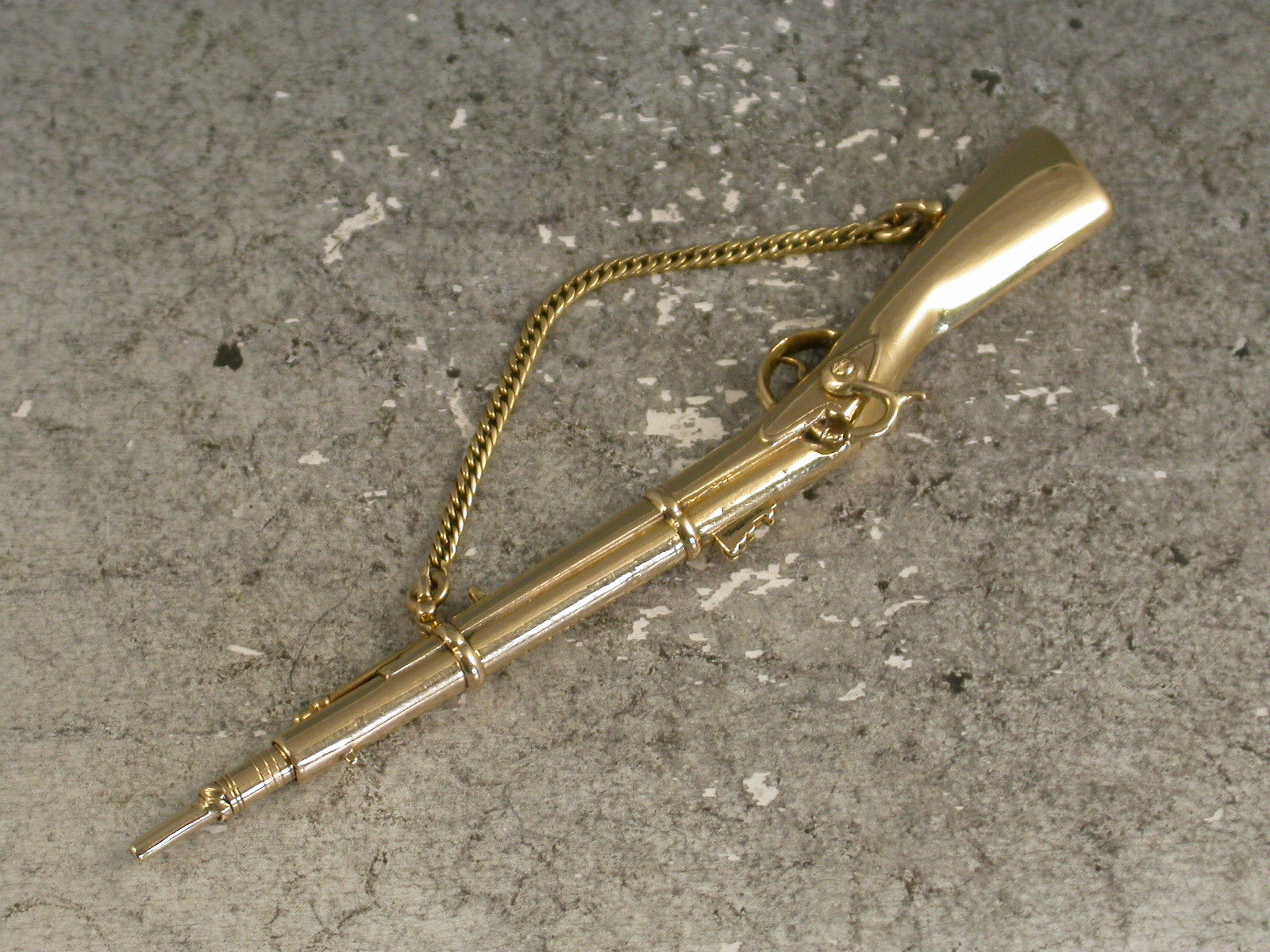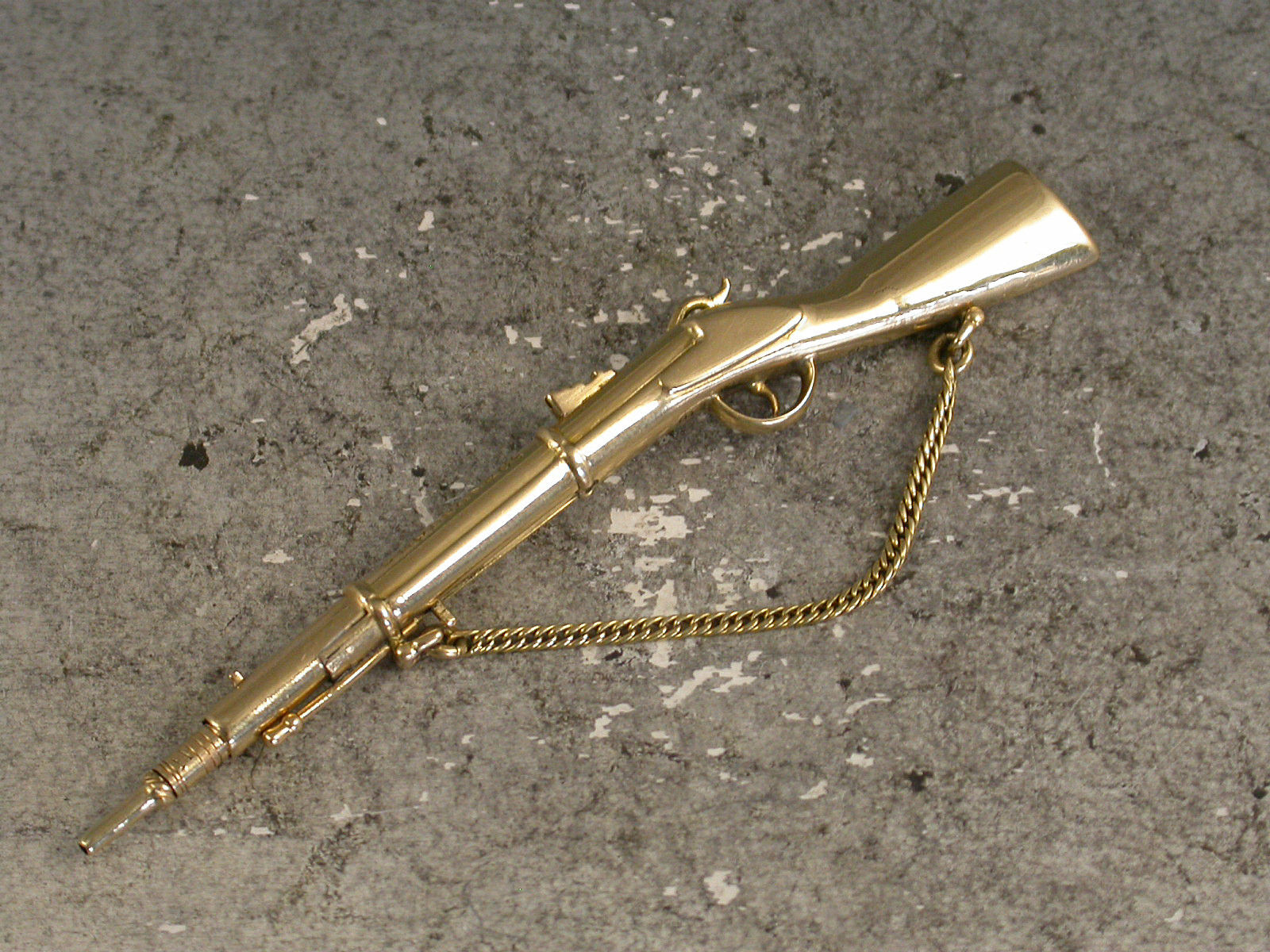 A rare early Victorian novelty 18 carat gold (tested) Propelling Pencil made in the form of a Percussion Cap Rifle, complete with gold chain to simulate the shoulder strap, the pencil is extended by a sliding pin beneath the barrel.