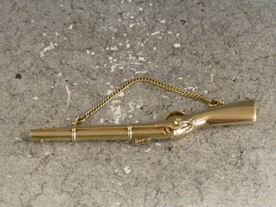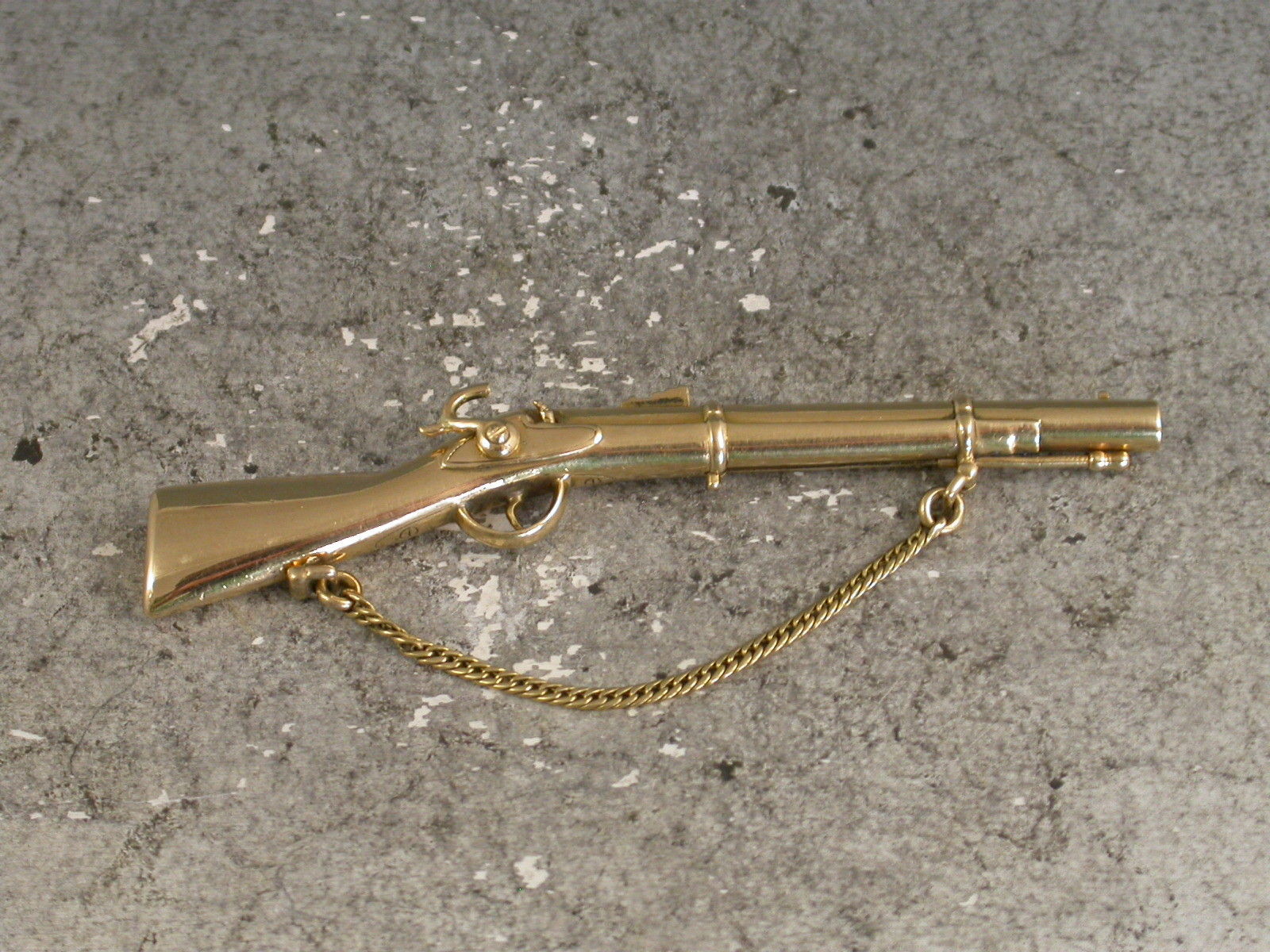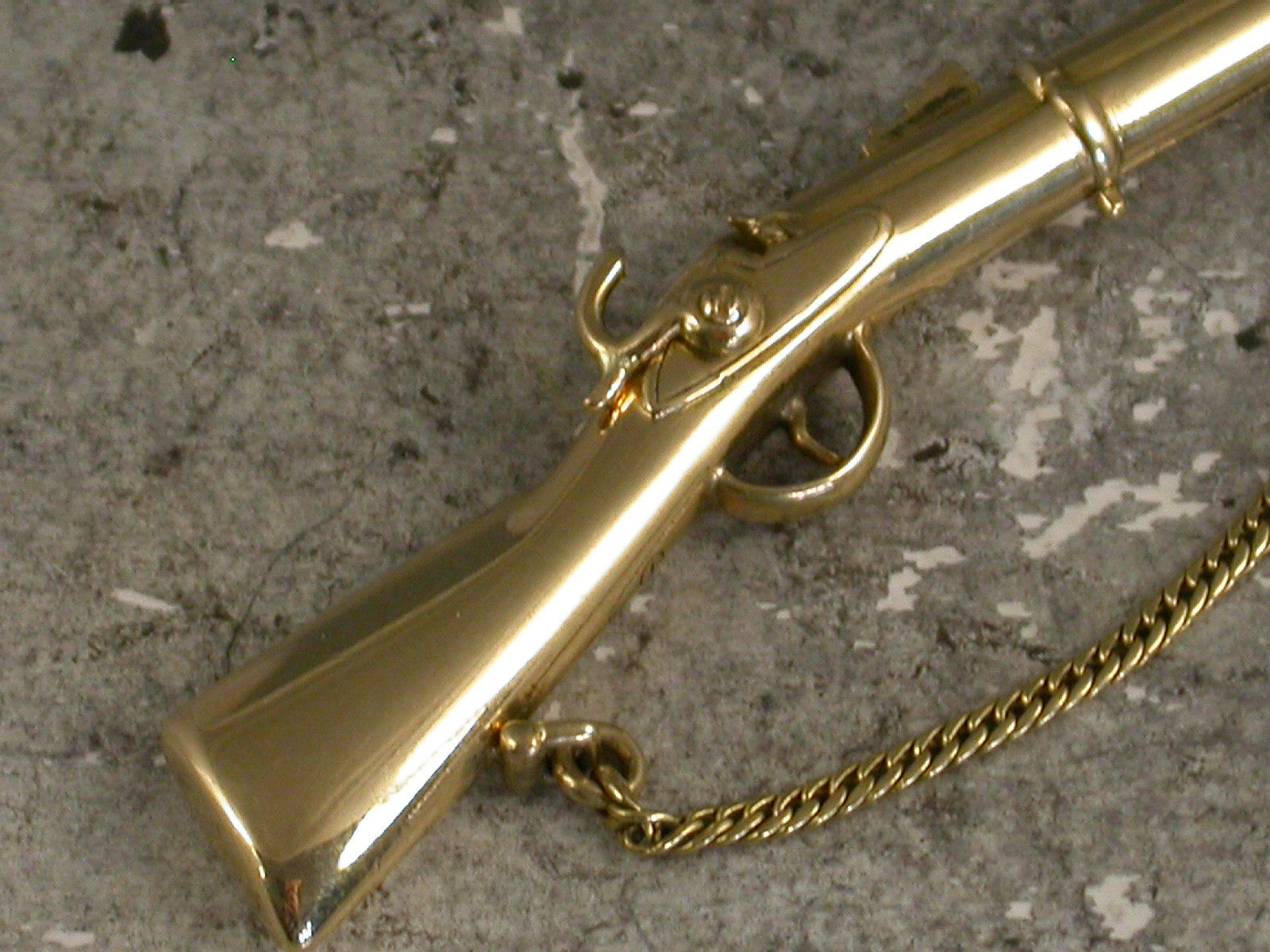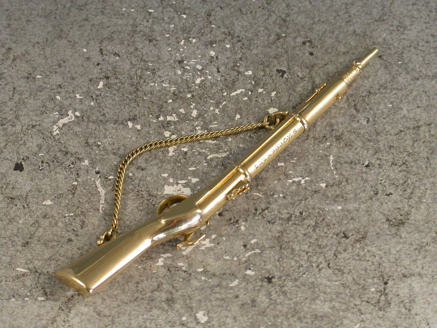 A rare early Victorian novelty 18 carat gold (tested) Propelling Pencil made in the form of a Percussion Cap Rifle, complete with gold chain to simulate the shoulder strap, the pencil is extended by a sliding pin beneath the barrel.