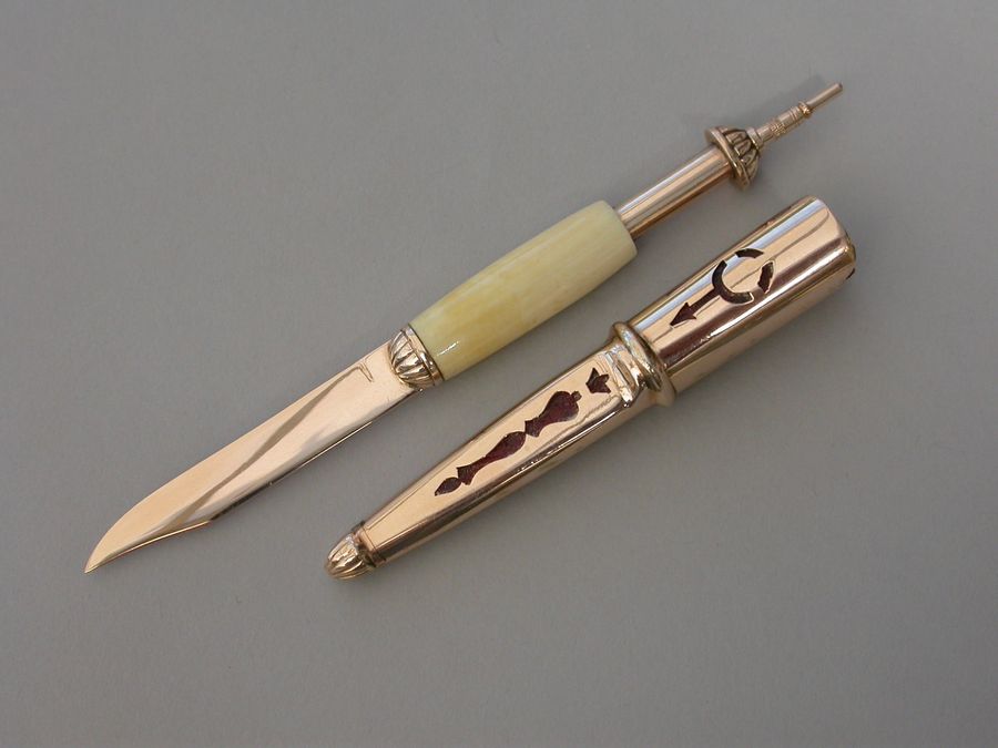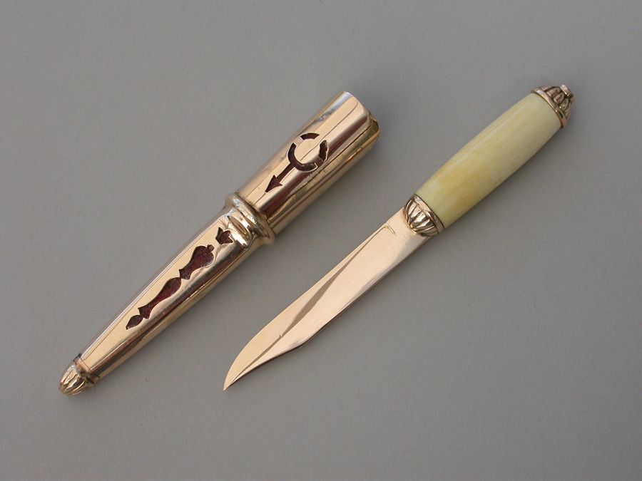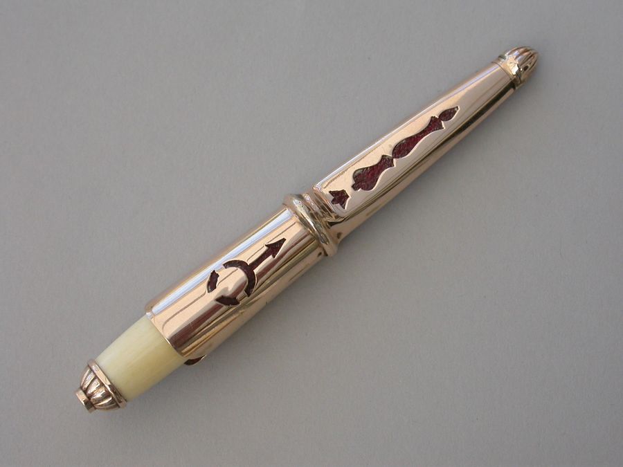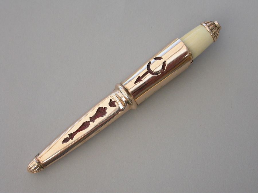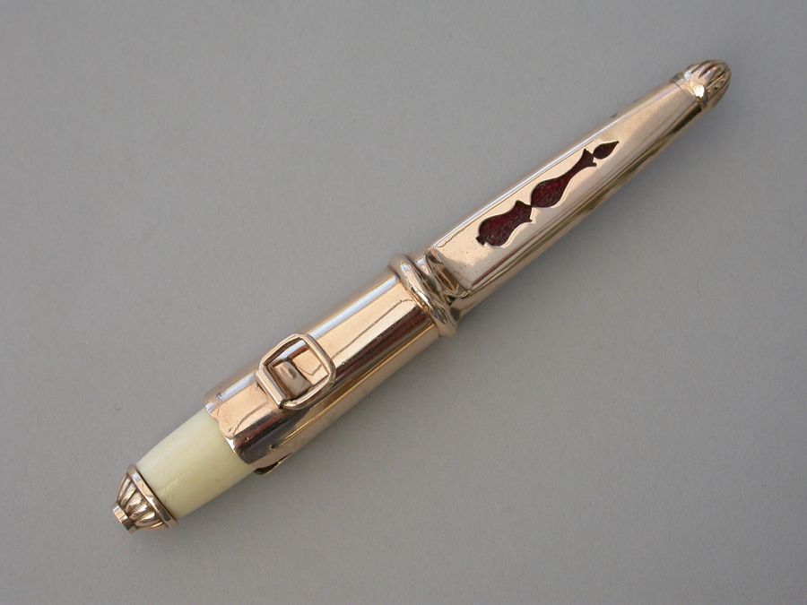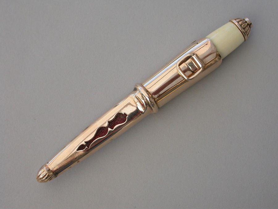 An extremely rare Victorian 9 crt gold (tested) and ivory novelty telescopic Propelling Pencil made in the form of a Bowie Knife, complete with pierced sheath with attached suspension ring and lined with red Morocco leather.
