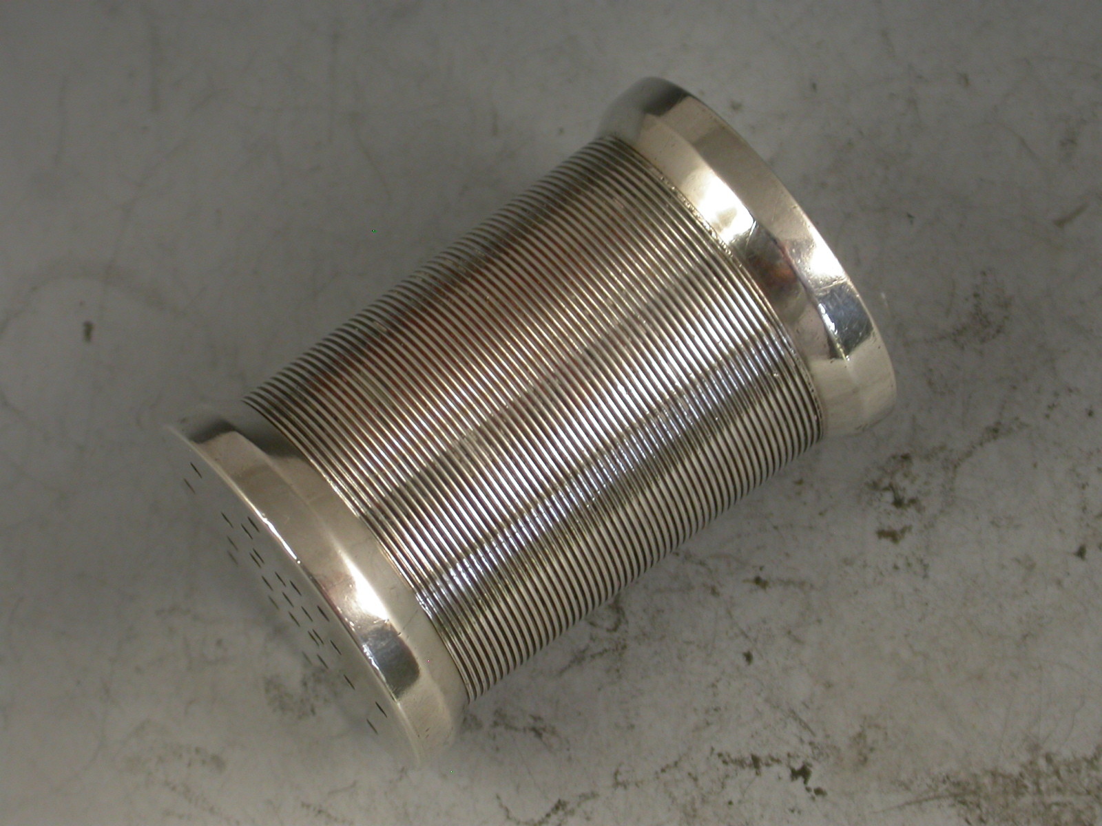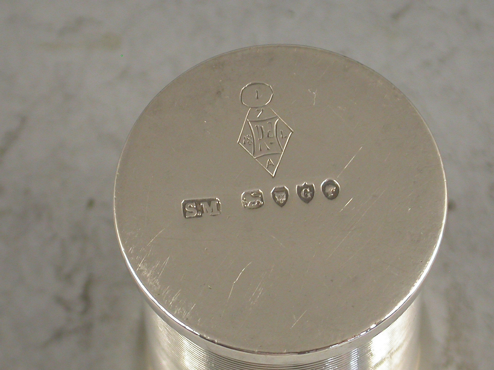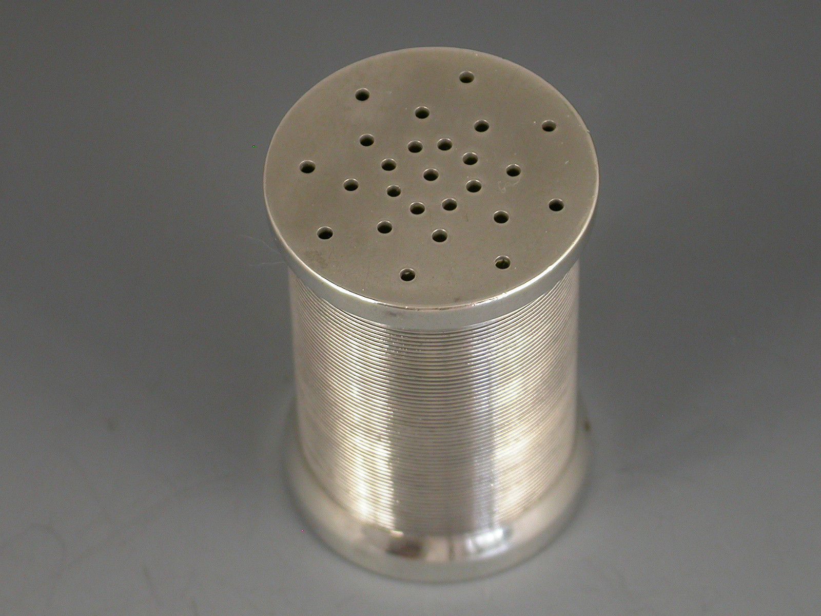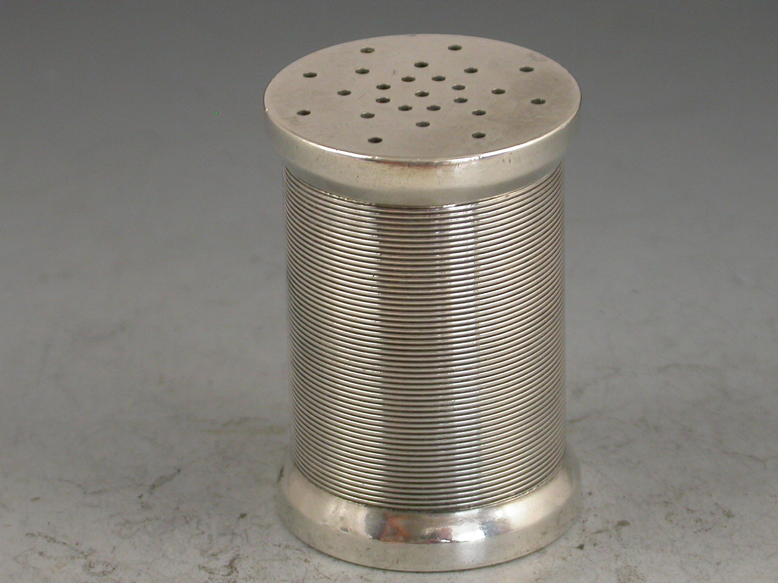 A rare Victorian novelty silver Pepper made in the form of a Cotton Reel with reeded body to simulate the cotton, a pierced screw off cover and silver gilt interior.