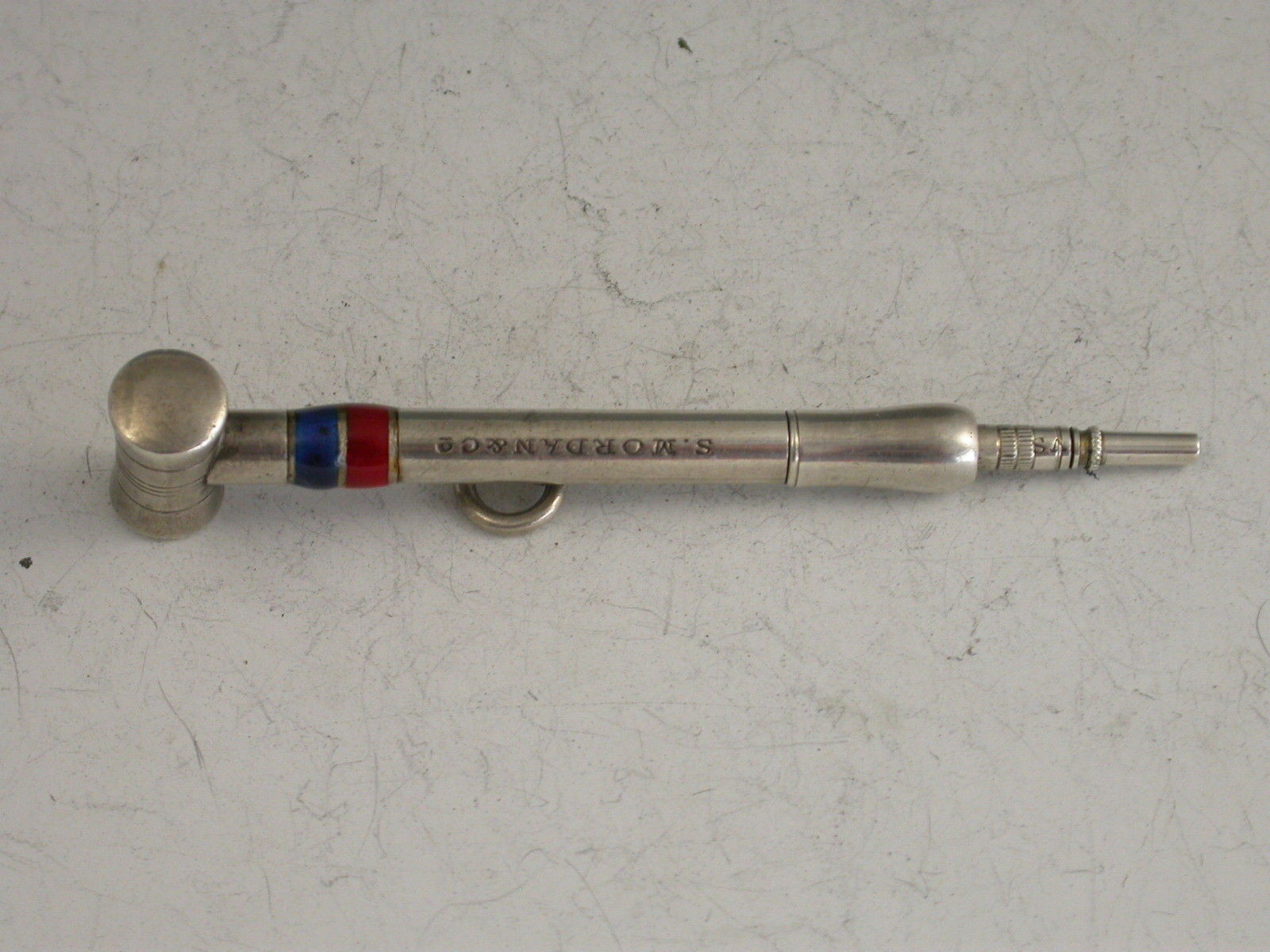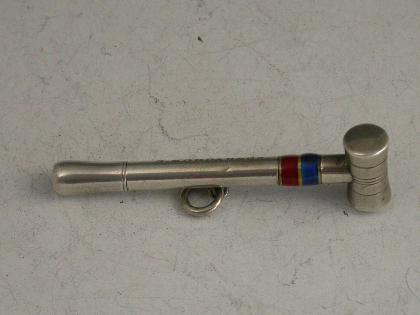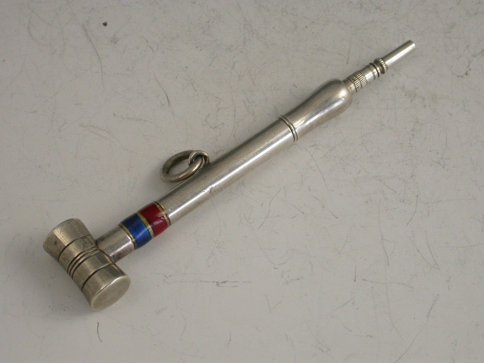 A rare Victorian novelty silver Propelling Pencil made in the form of Croquet Mallet, with red and blue enamel bands to the handle, the pencil extending on a twist mechanism.