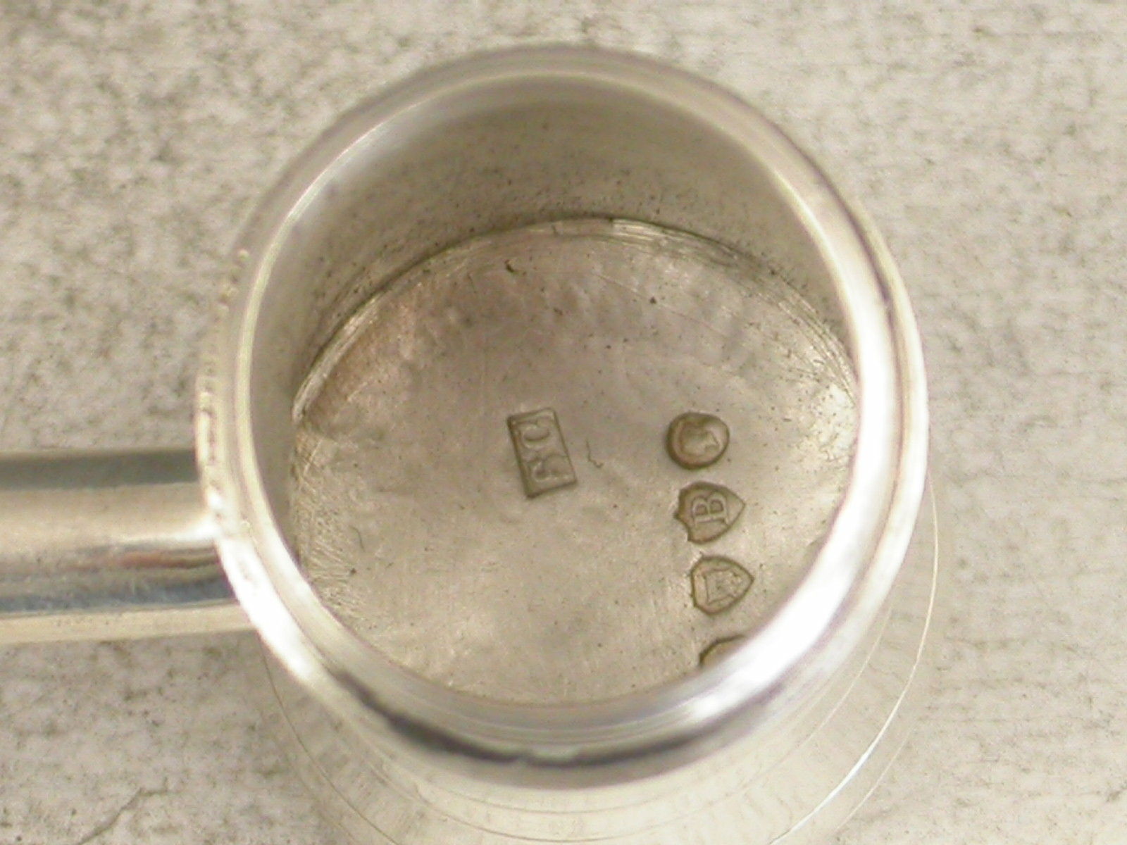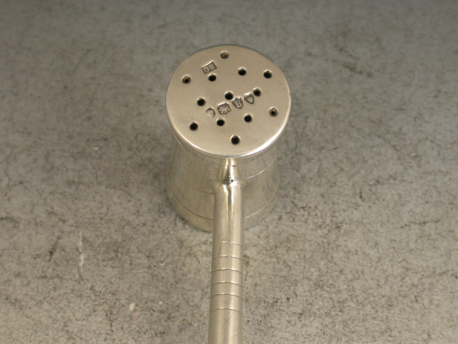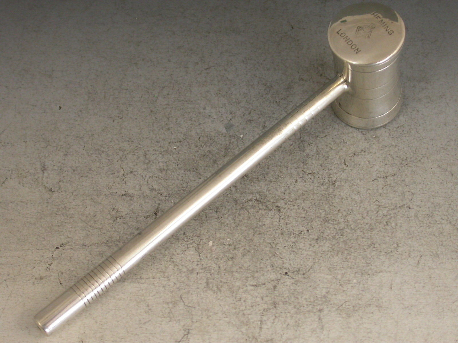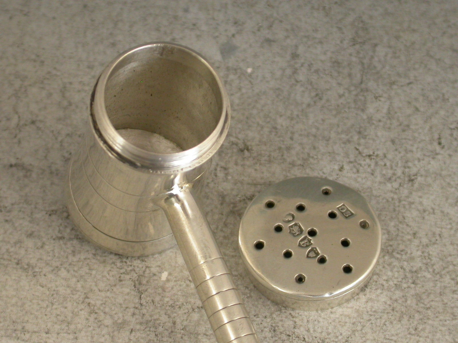 A rare Victorian novelty silver Pepper or possibly Sander, made in the form of a Auctioneers Gavel, with bands of reeded decoration and pierced screw off cover, the base engraved with a diamond registration mark and retailers name of Heming, London.
