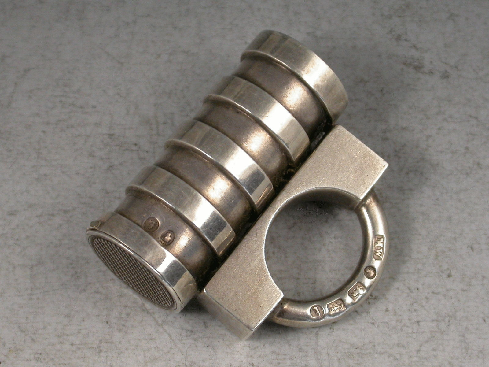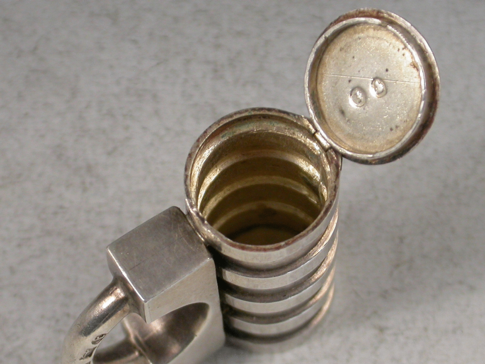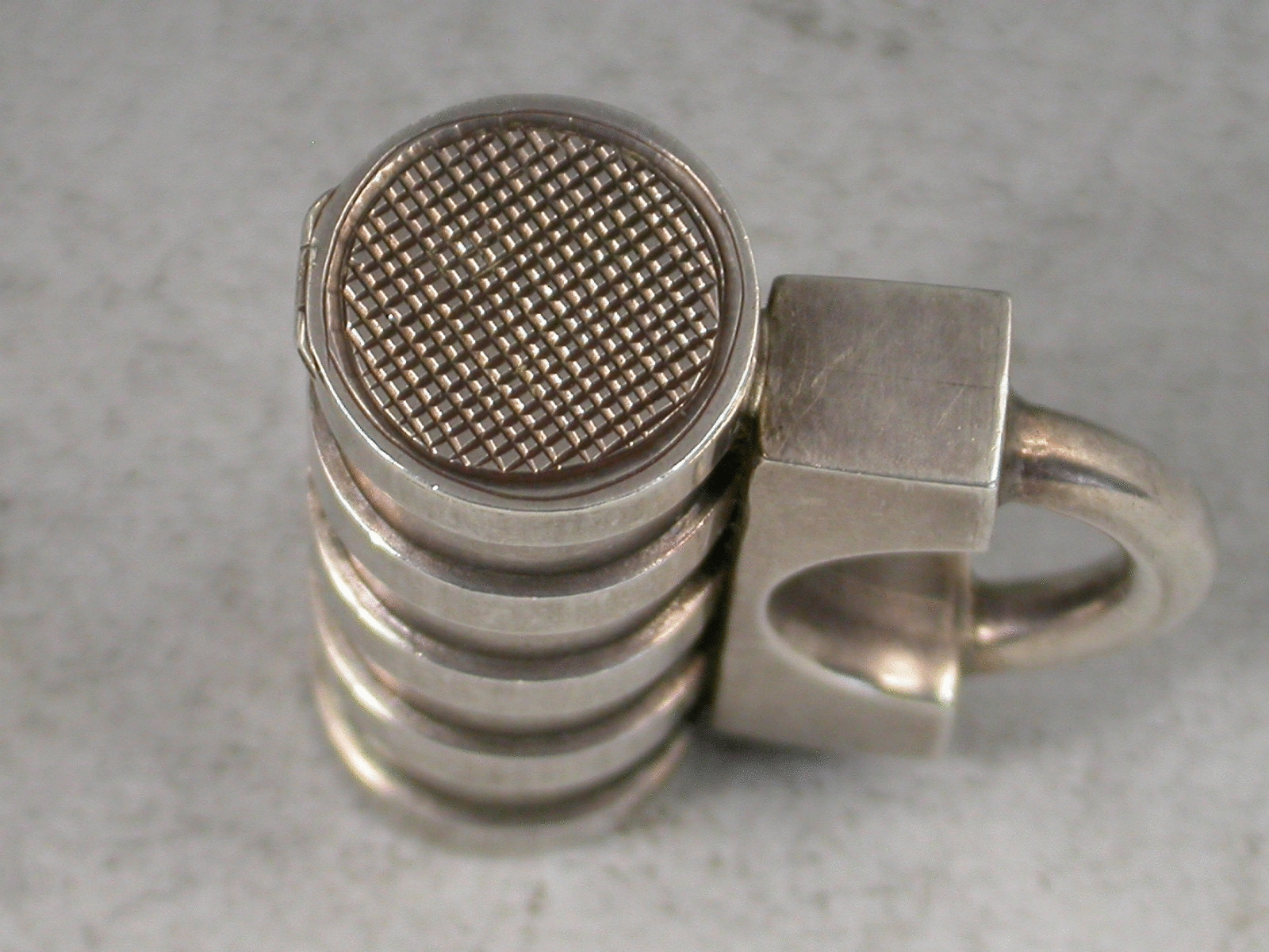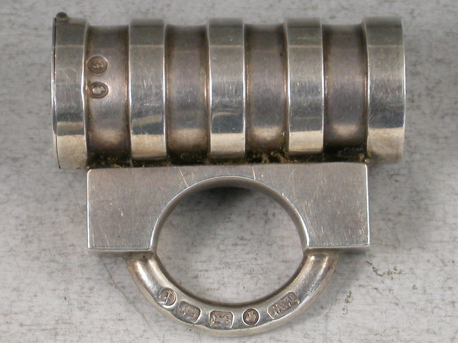 A rare Victorian novelty silver Vesta Case in the form of a Padlock with cylindrical ribbed barrel, the striker to the top of the flat hinged lid.