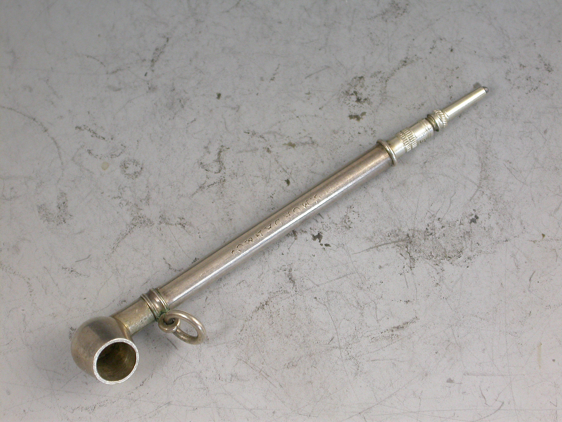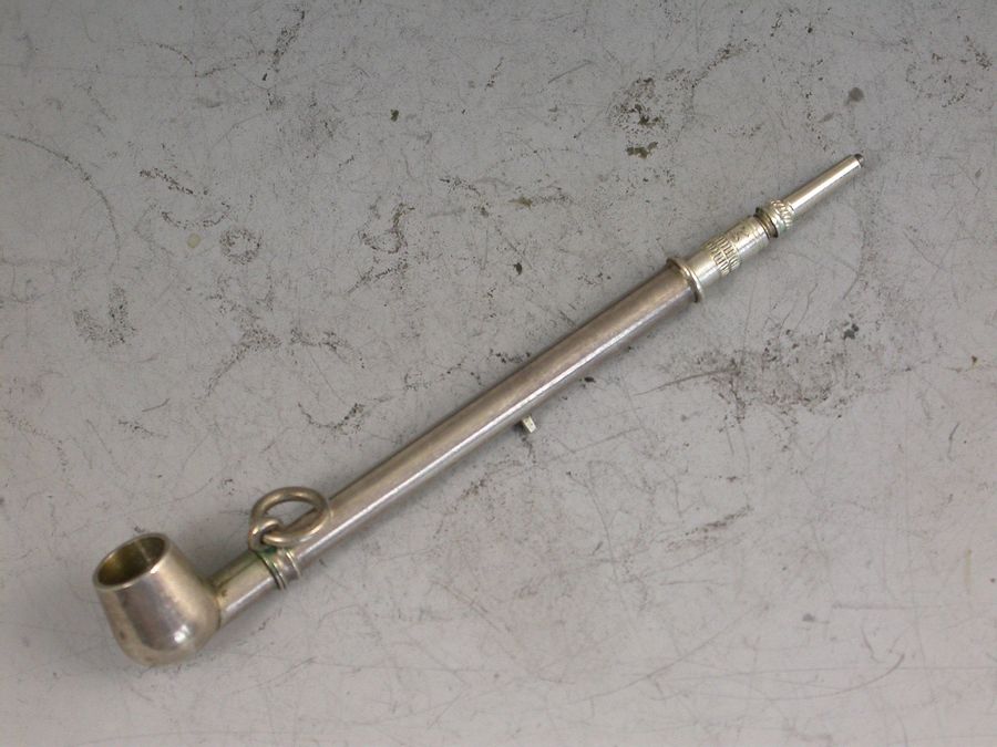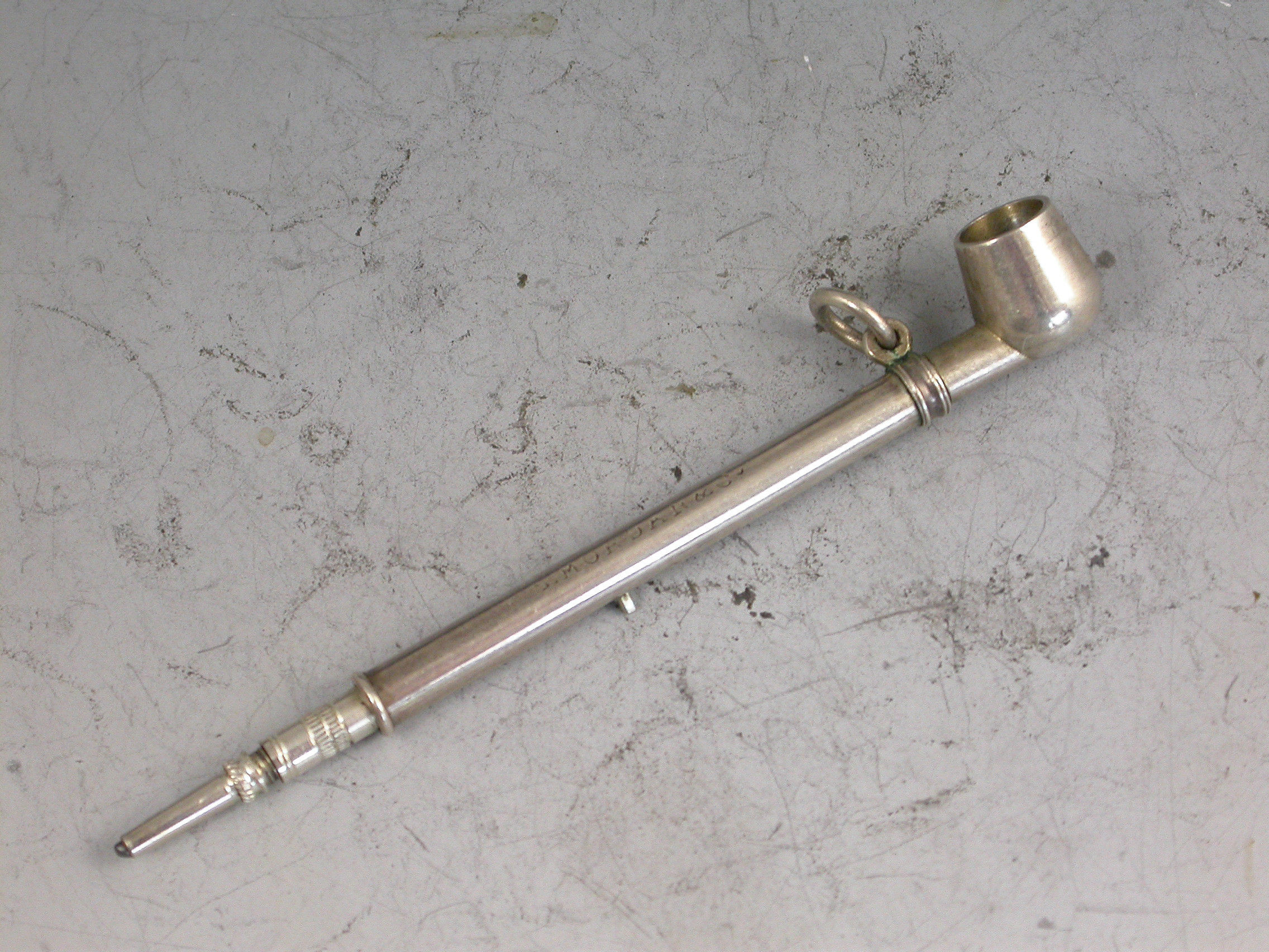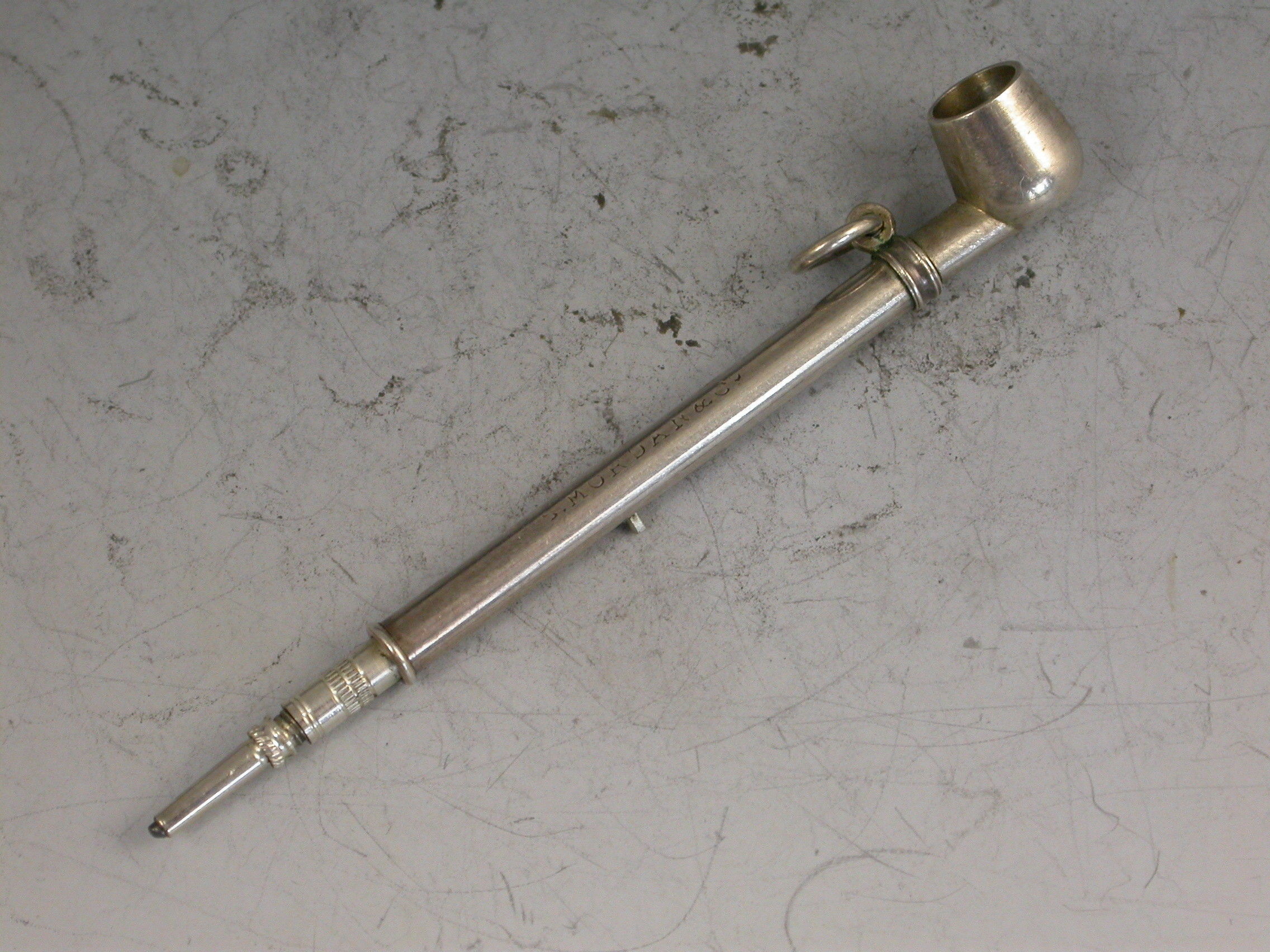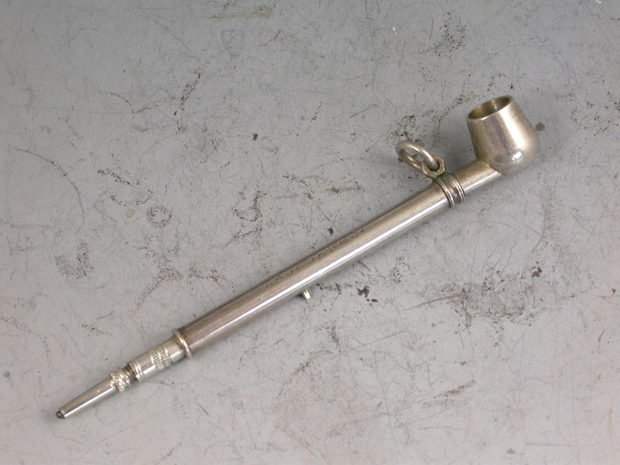 A rare Victorian novelty silver Propelling Pencil made in the form of a Pipe, with sliding pin mechanism to extend the pencil, attached suspension ring.
