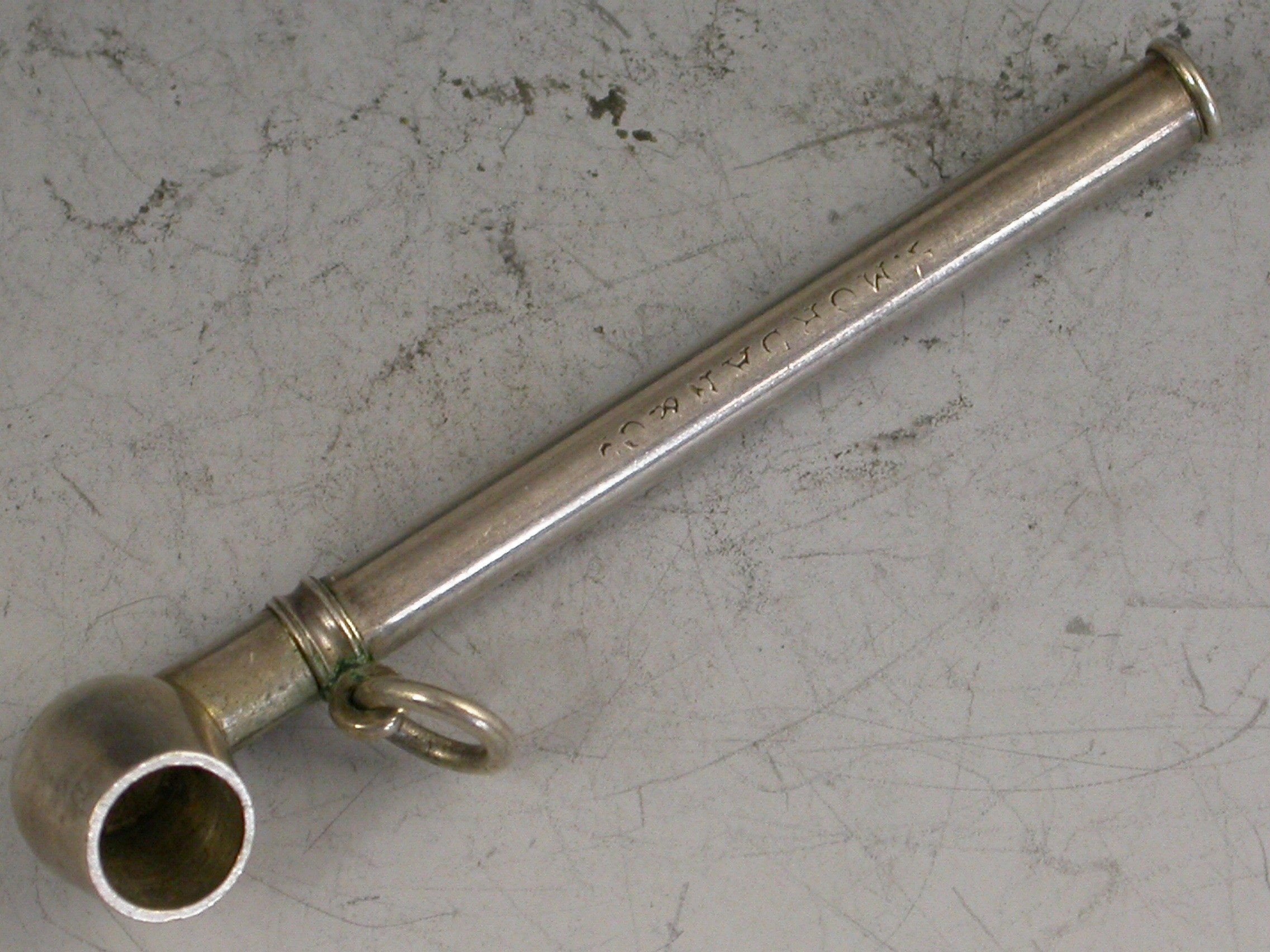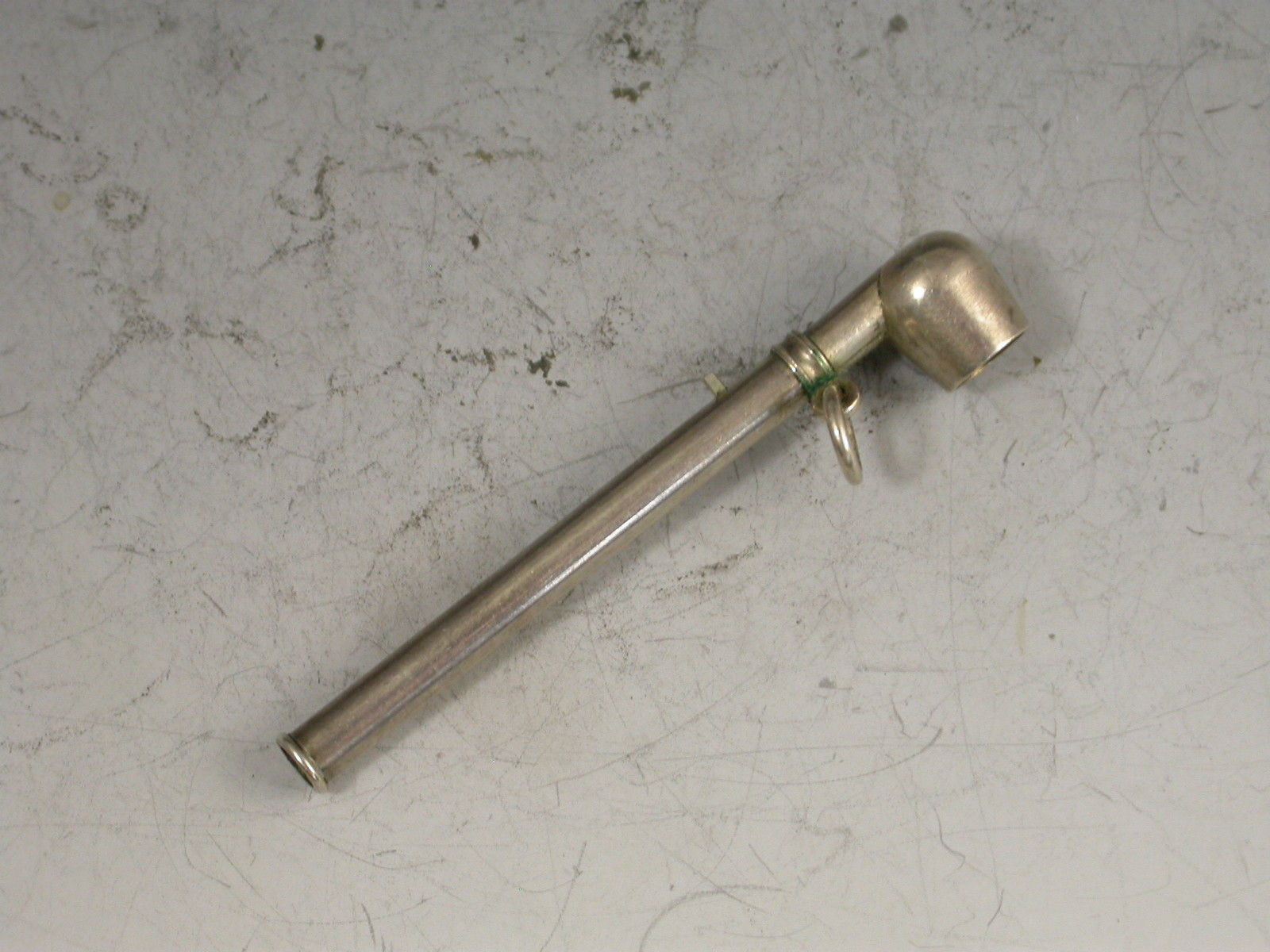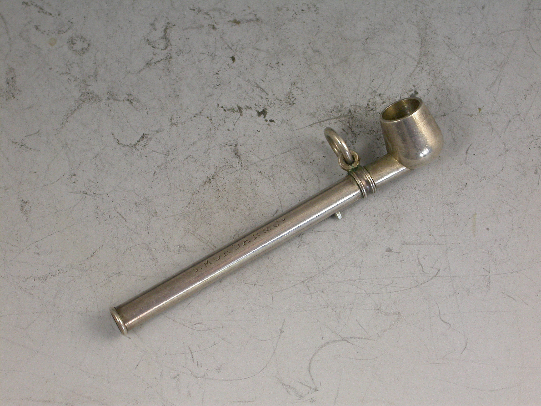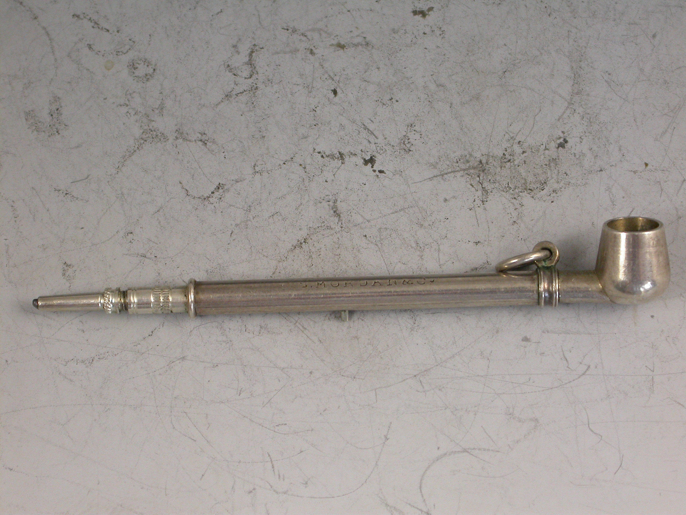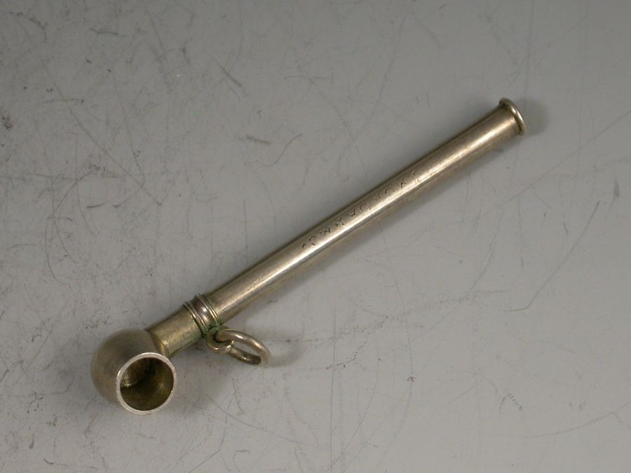 A rare Victorian novelty silver Propelling Pencil made in the form of a Pipe, with sliding pin mechanism to extend the pencil, attached suspension ring.