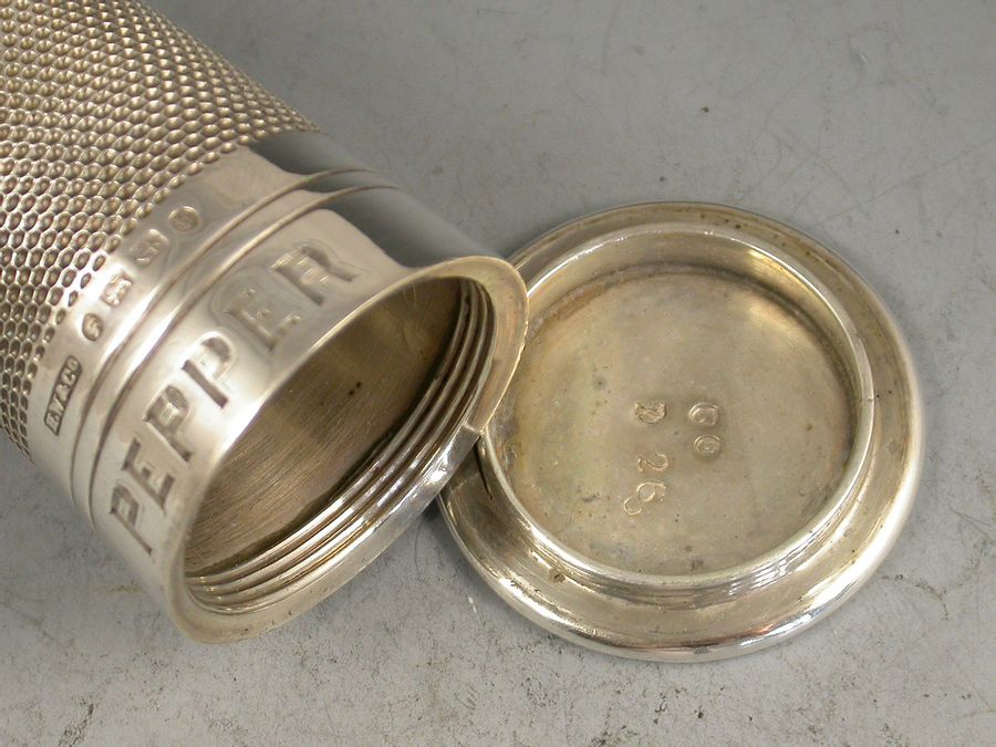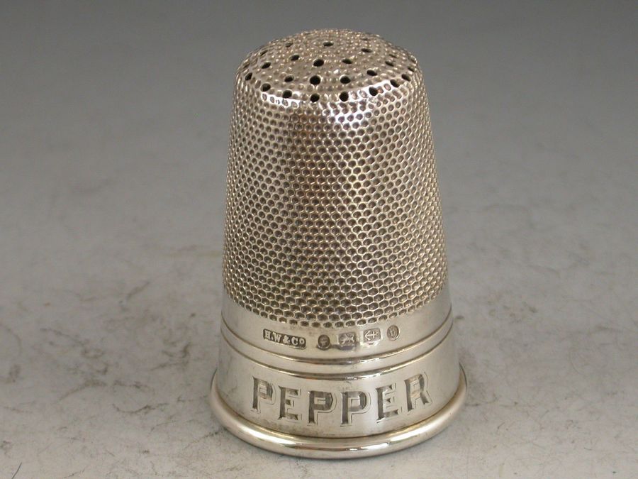 A rare Victorian novelty silver Pepper, made in the form of a Thimble and inscribed 'Pepper' to the side, with screw-off base.