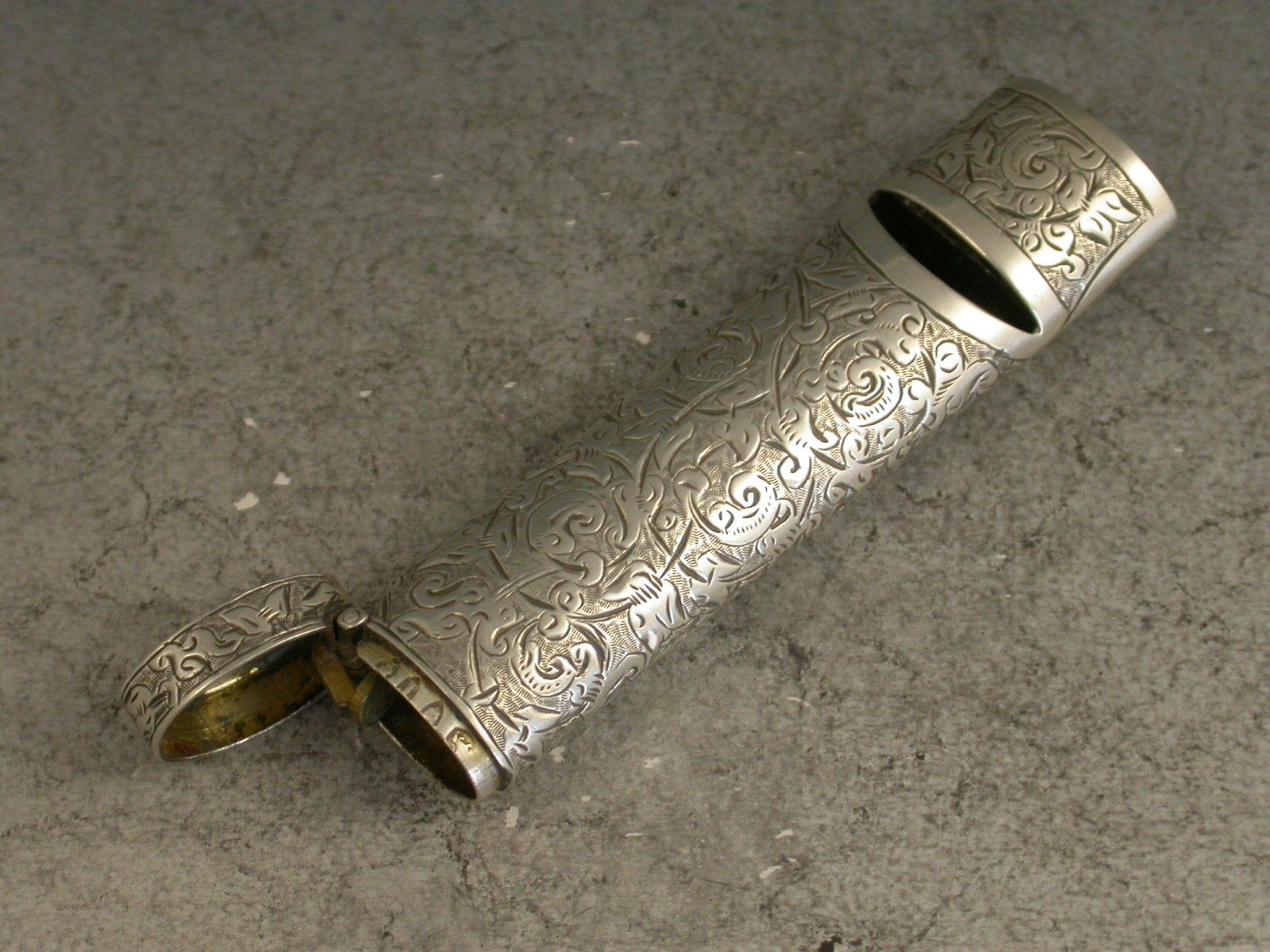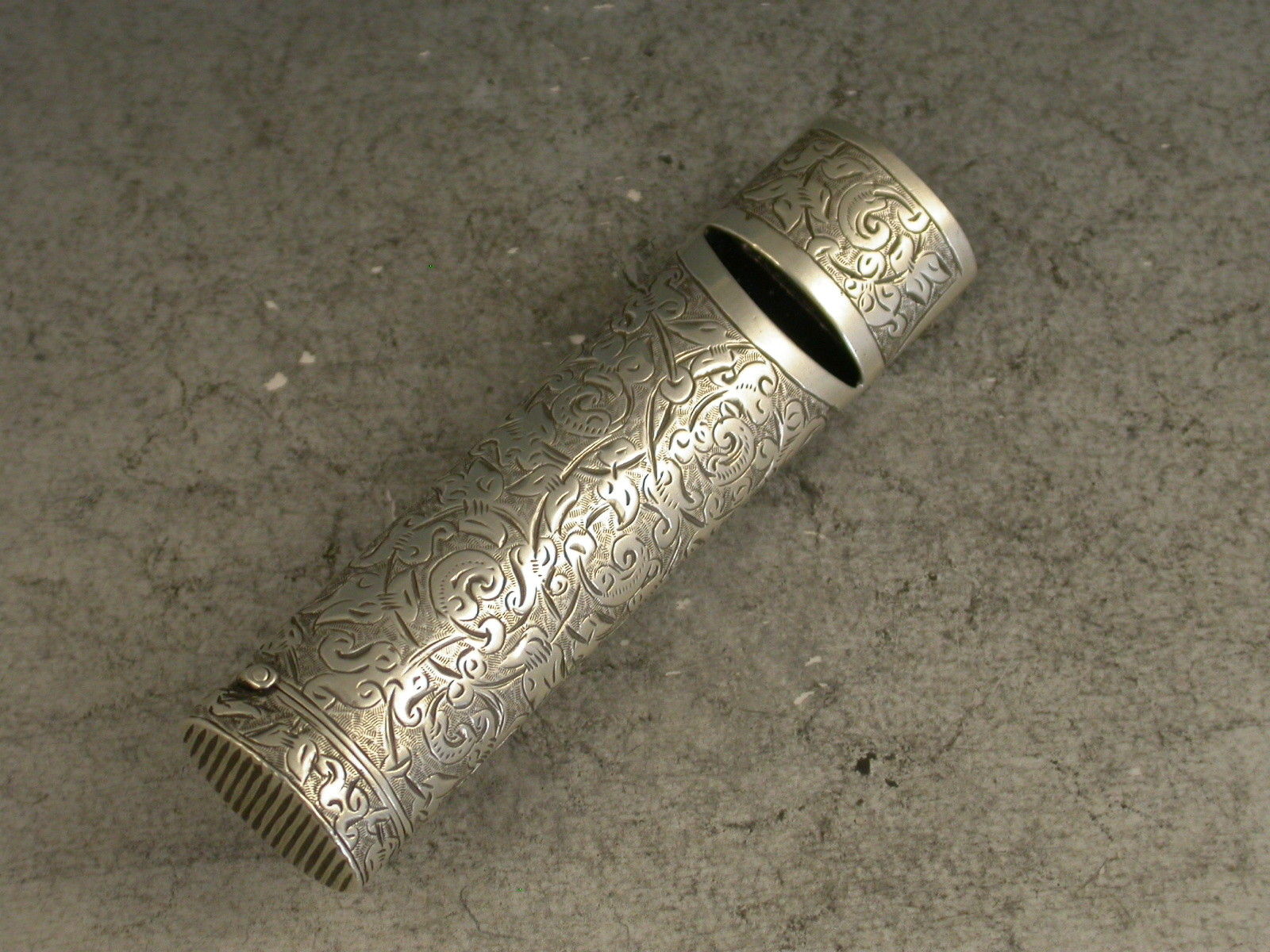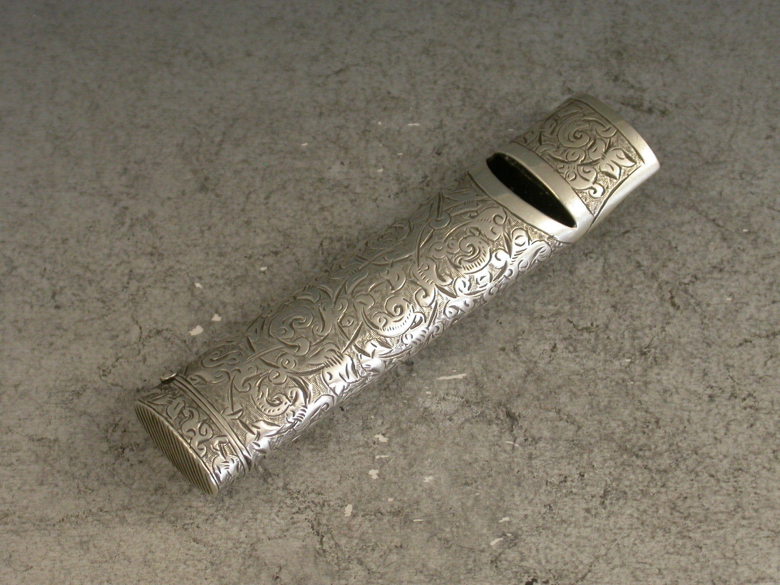 A good Victorian novelty silver Vesta Case made in the form of a Whistle, the oval tubular body engraved with all-over foliate scroll decoration, hinged flip-top lid with striker.