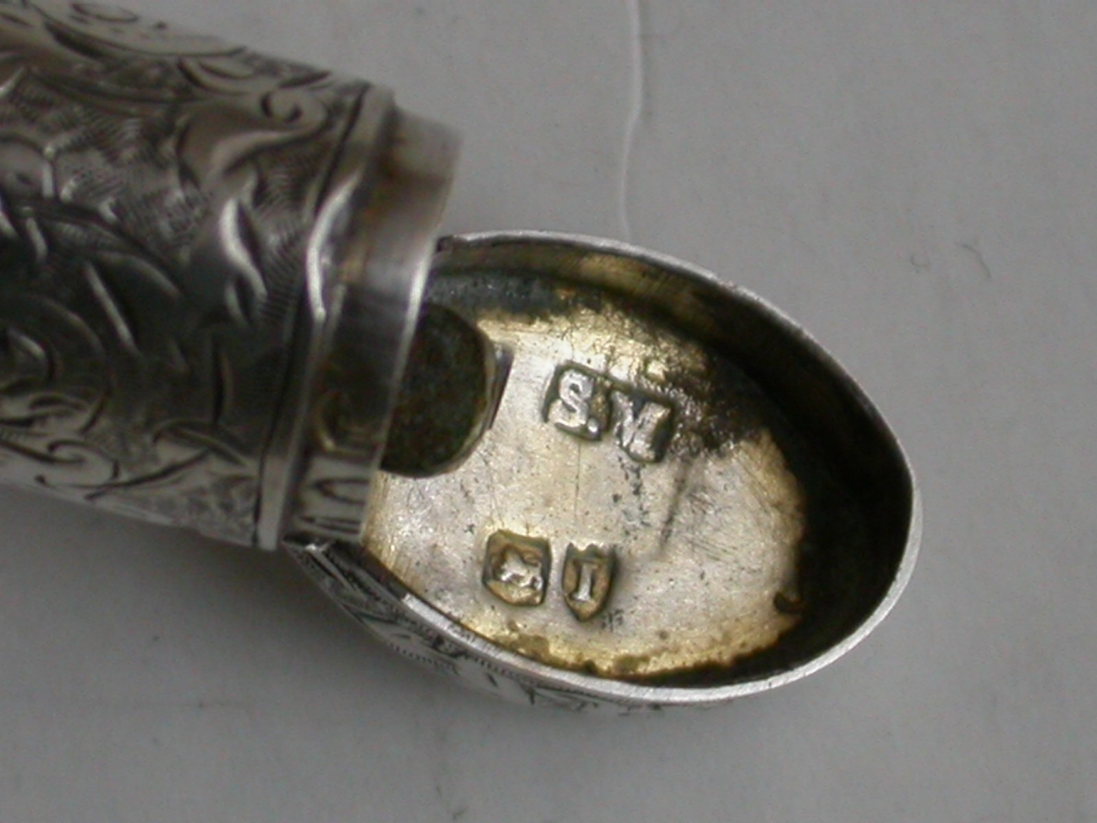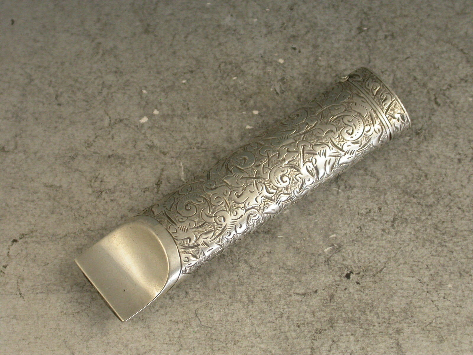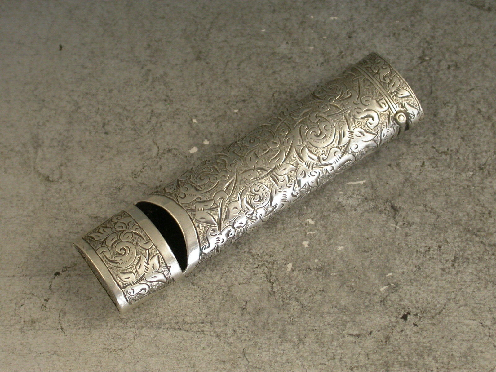 A good Victorian novelty silver Vesta Case made in the form of a Whistle, the oval tubular body engraved with all-over foliate scroll decoration, hinged flip-top lid with striker.