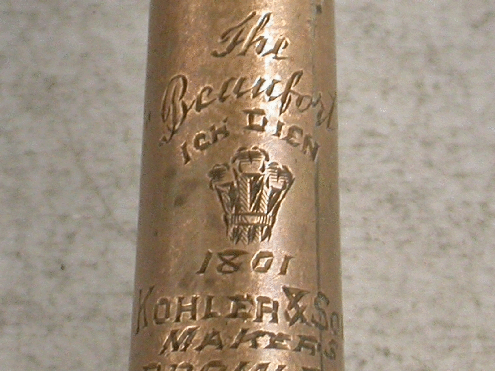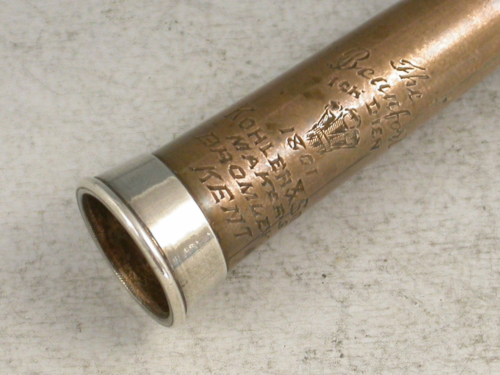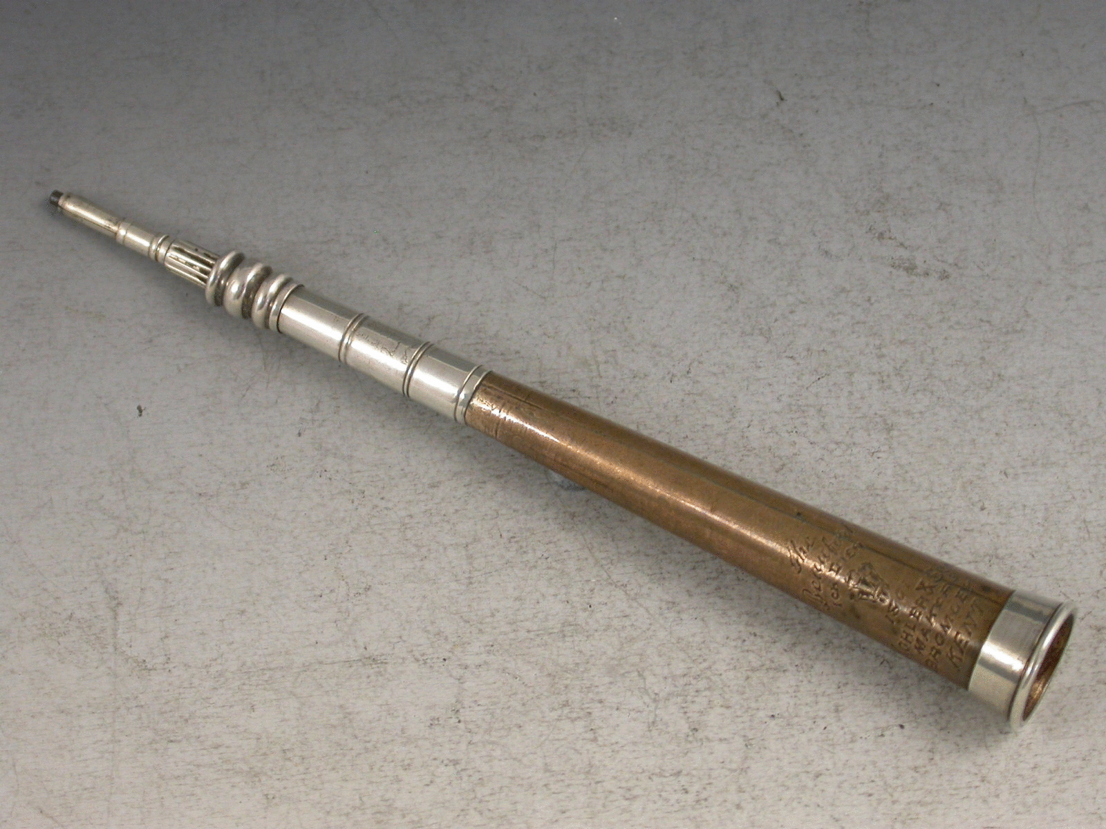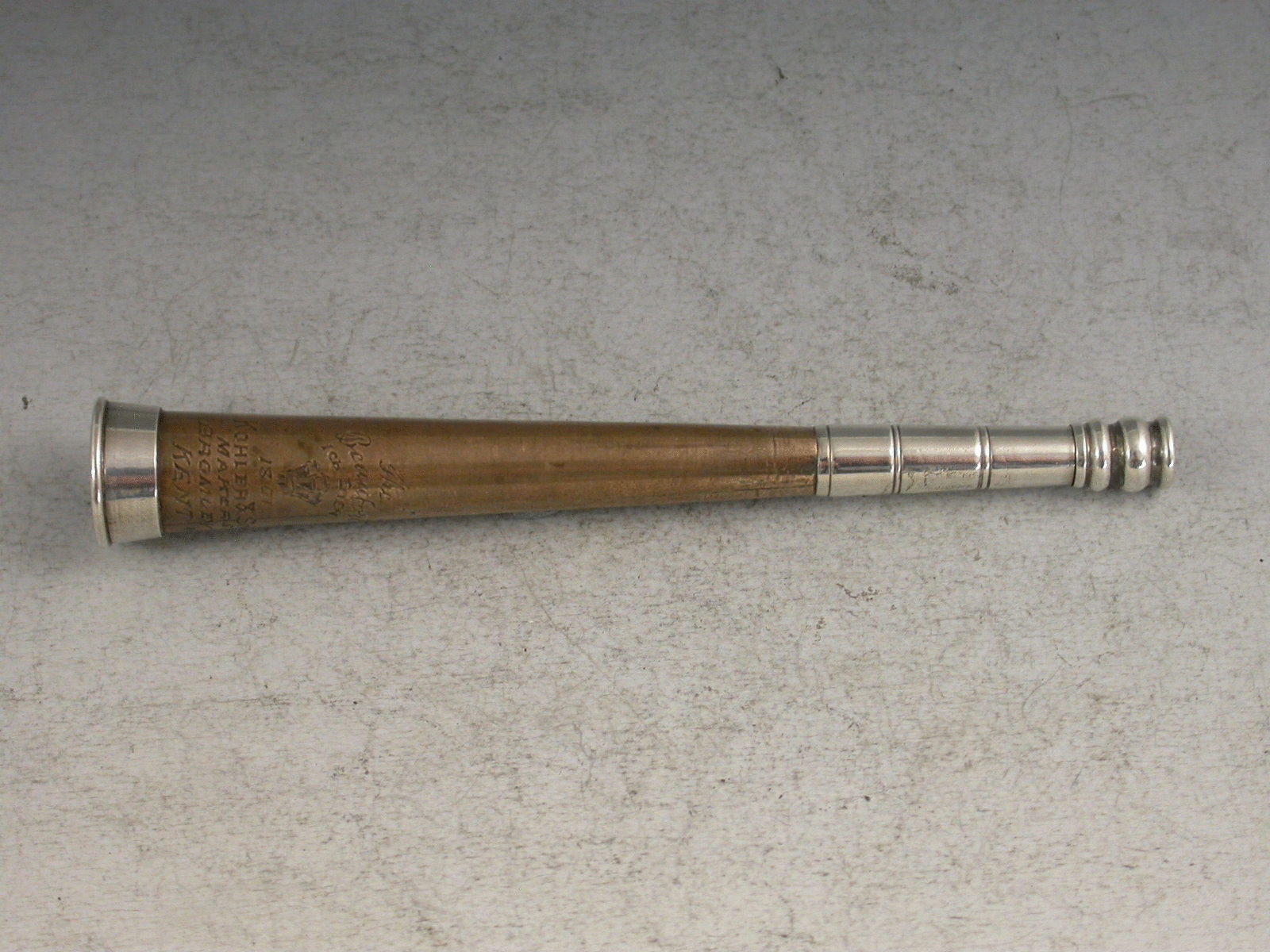 A rare Victorian novelty silver Propelling Pencil made in the form of a Hunting Horn with copper sleeve to body. Engraved with a Prince of Wales Feathers motif below the motto – “Ich Dien” and above the date 1801. Also engraved “The Beaufort”, and stamped with the makers name:- Kohler & Son, Makers, Bromley, Kent. Twist mechanism to propel the pencil.