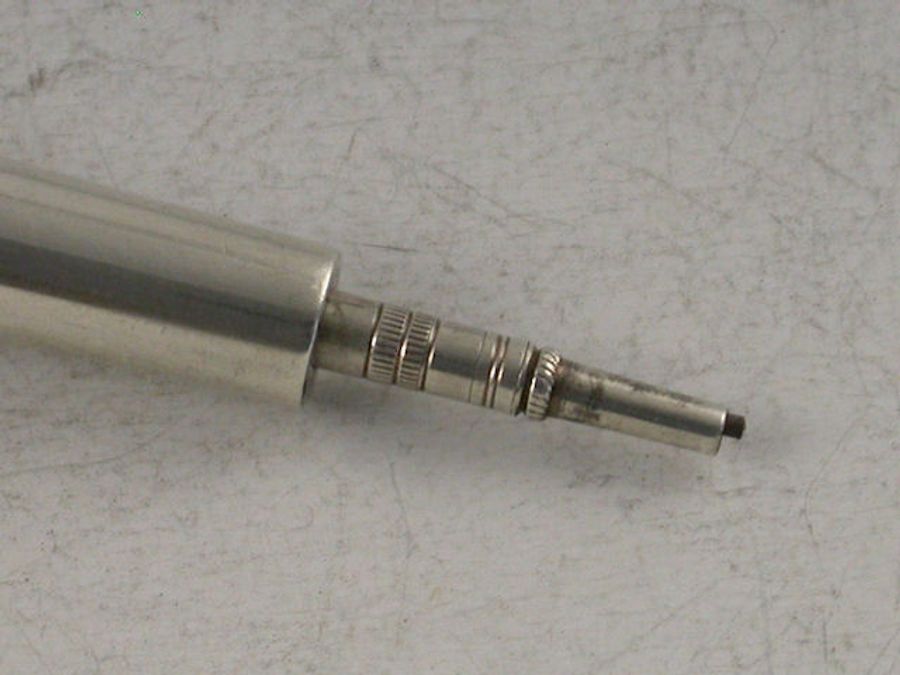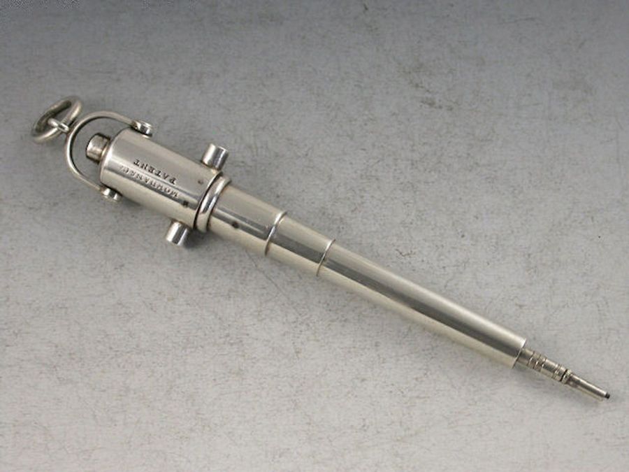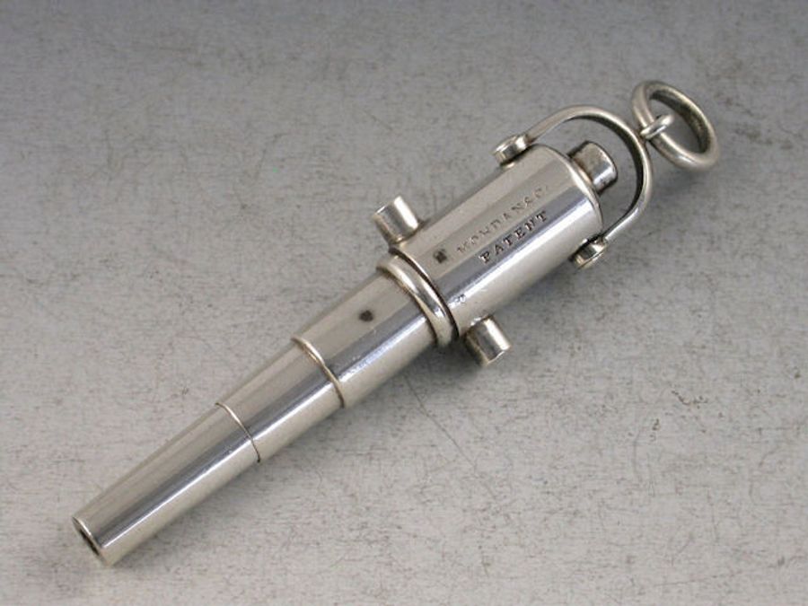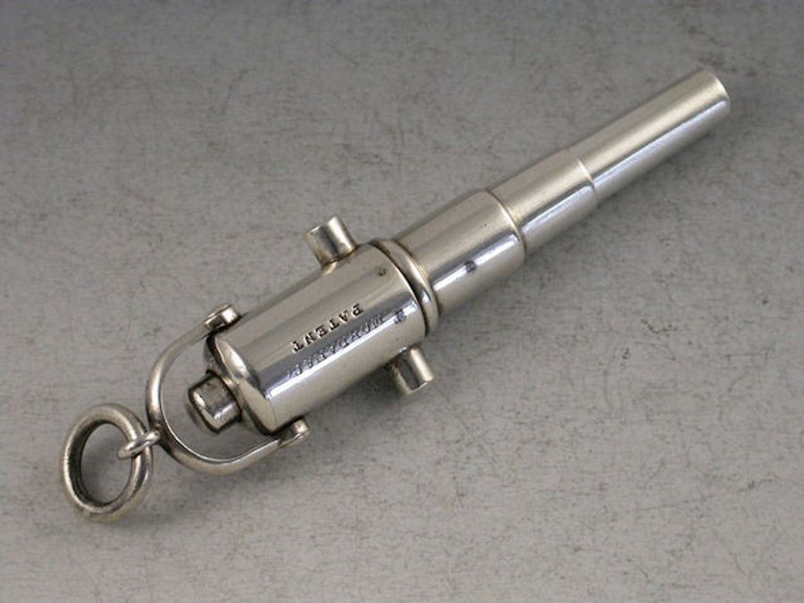 A rare Victorian novelty silver Propelling Pencil in the form of a recoiling Cannon, with sprung push button mechanism to extend the barrel, attached suspension loop.
