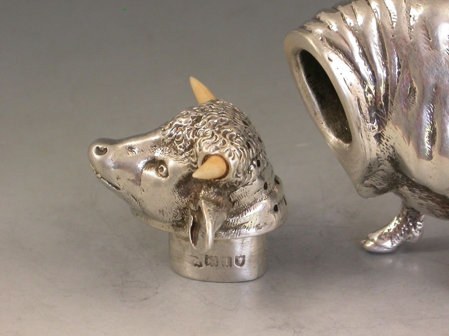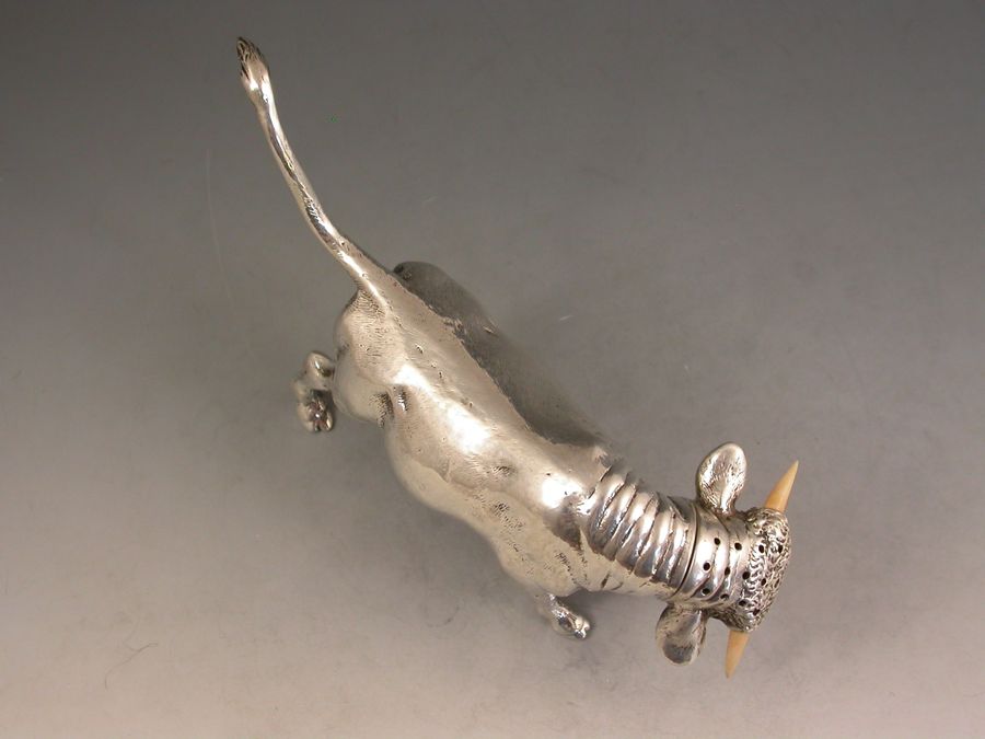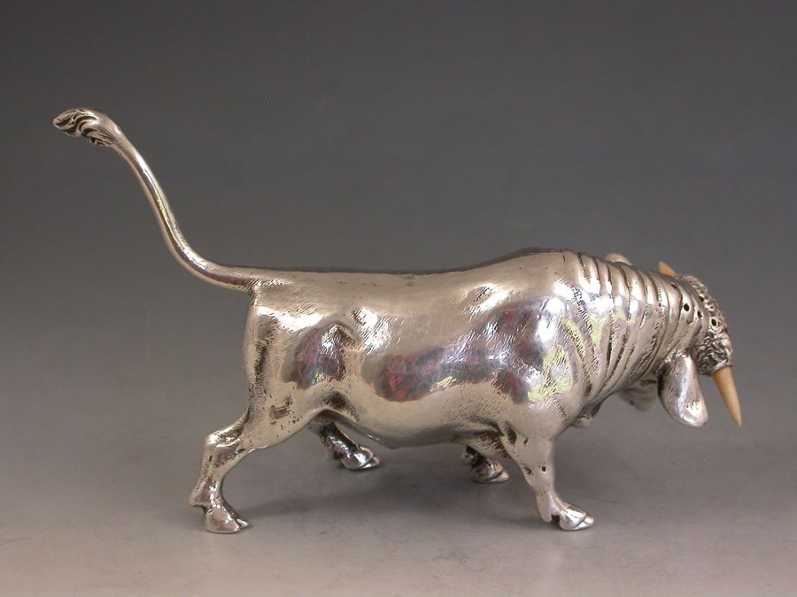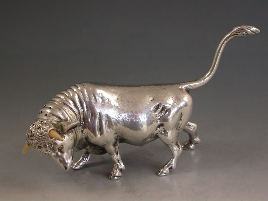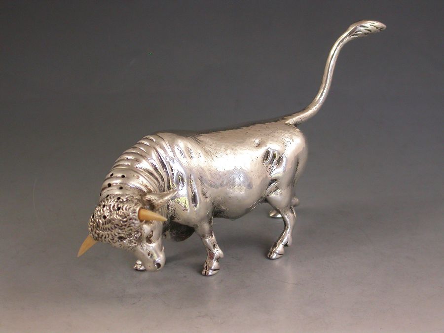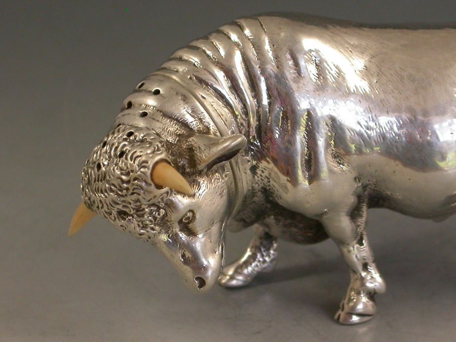 A very fine quality and extremely rare novelty cast silver Pepper made in the form of a Bull, with pull-off pierced head set with ivory horns.