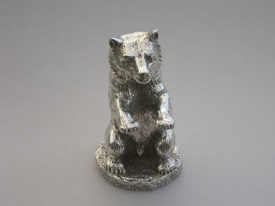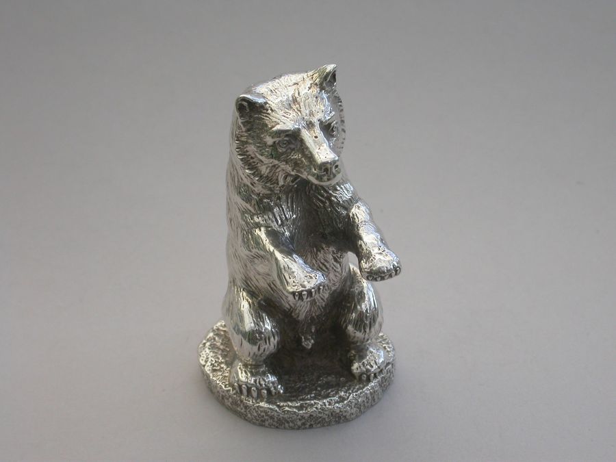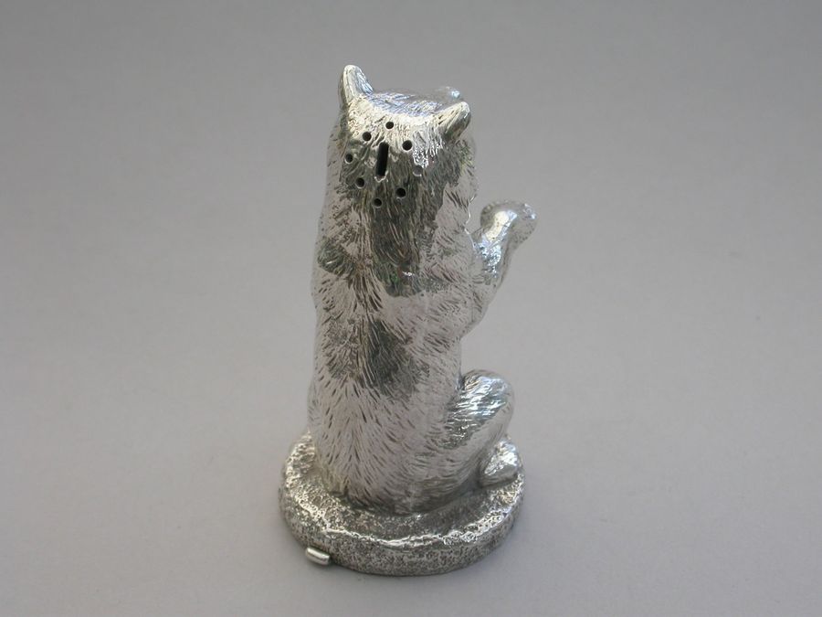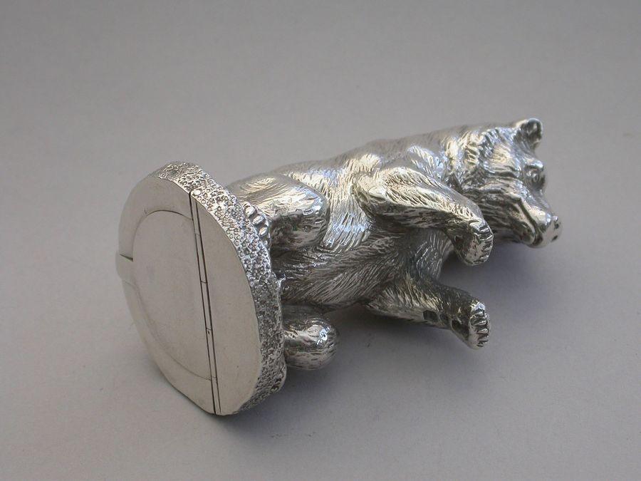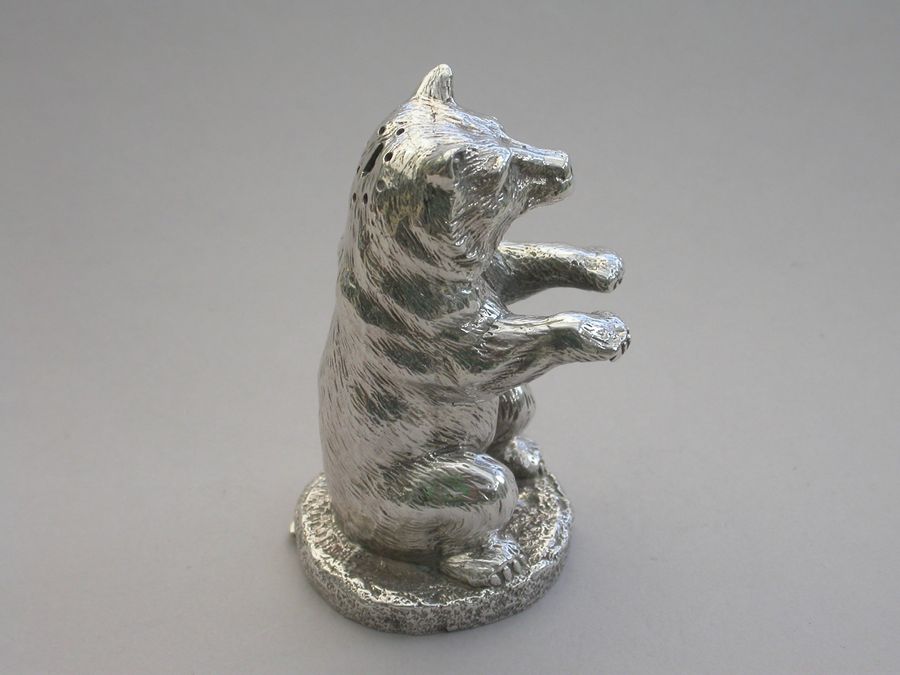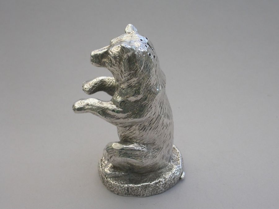 A fine quality Victorian cast silver novelty Pepper made in the form of a bear sitting on its hind legs, the circular base with hinged lid opening to reveal a silver gilt interior.