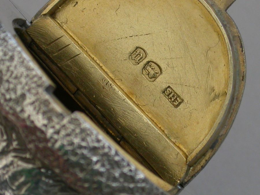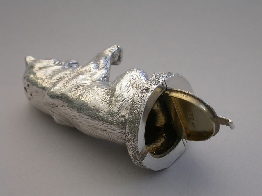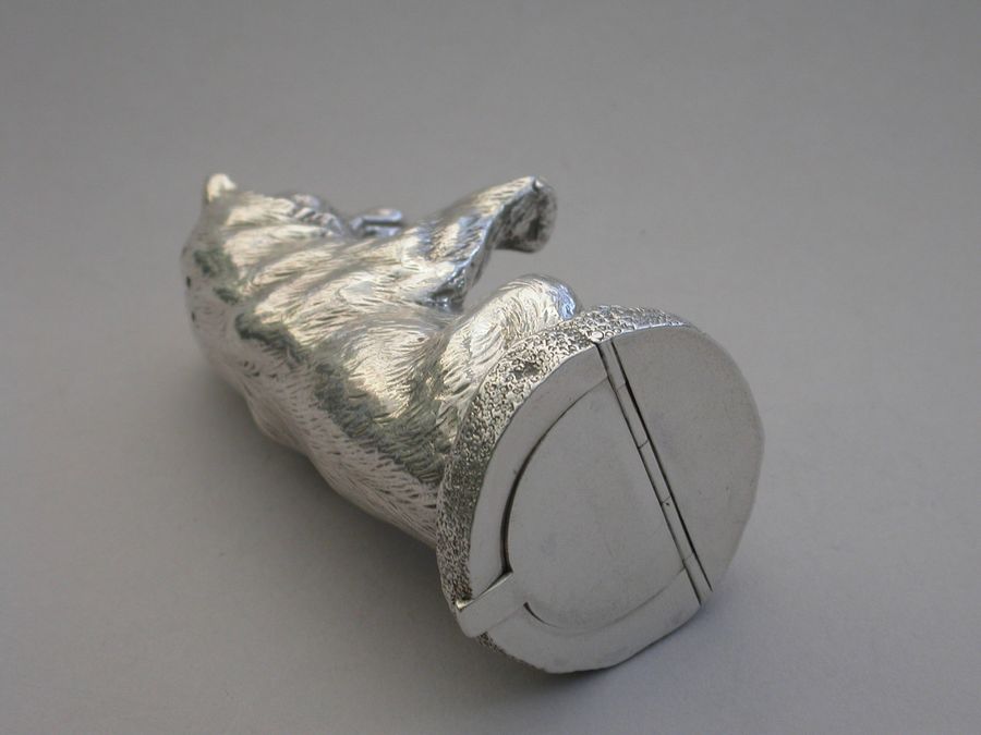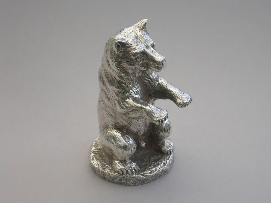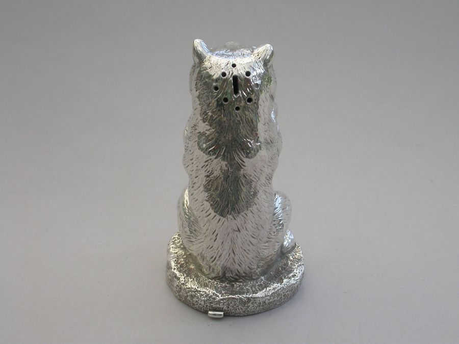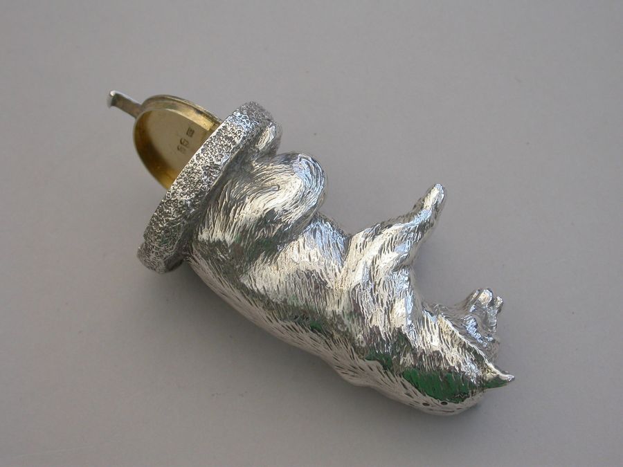 A fine quality Victorian cast silver novelty Pepper made in the form of a bear sitting on its hind legs, the circular base with hinged lid opening to reveal a silver gilt interior.
