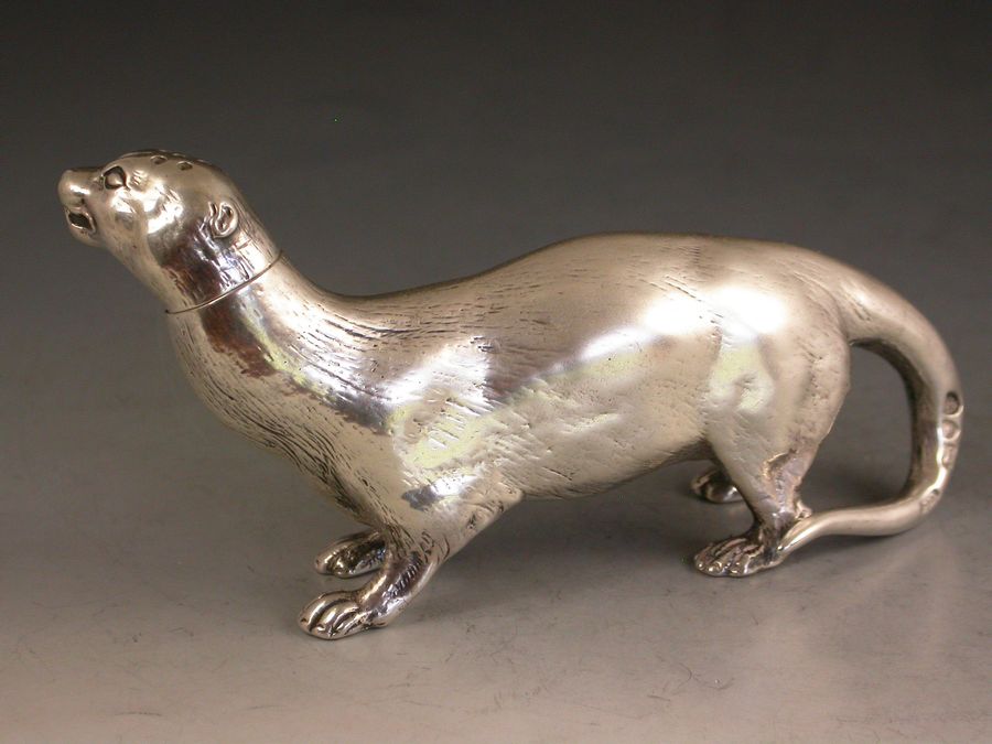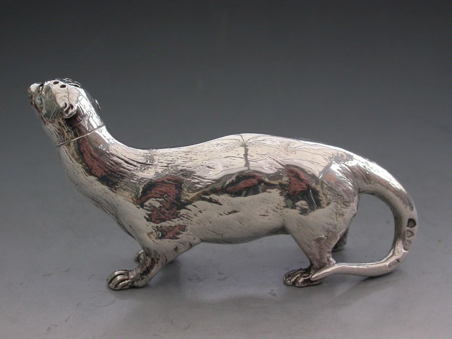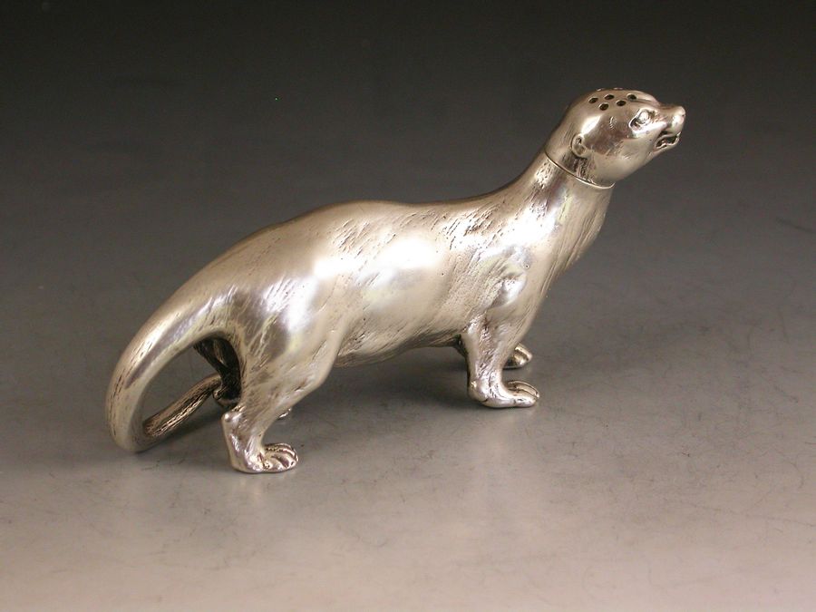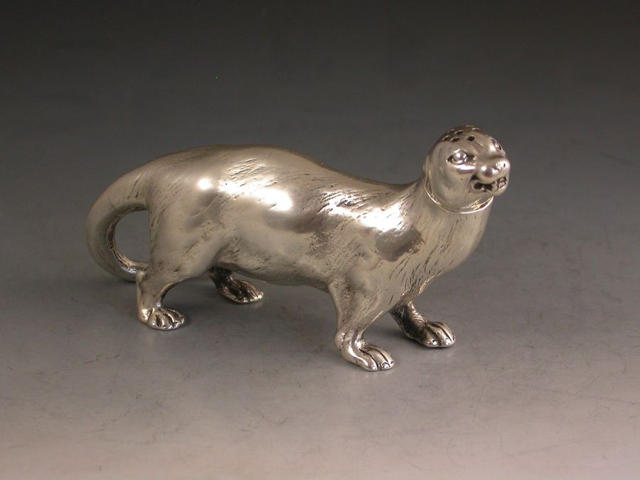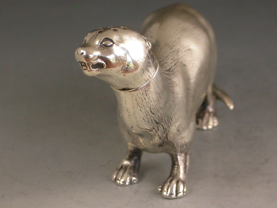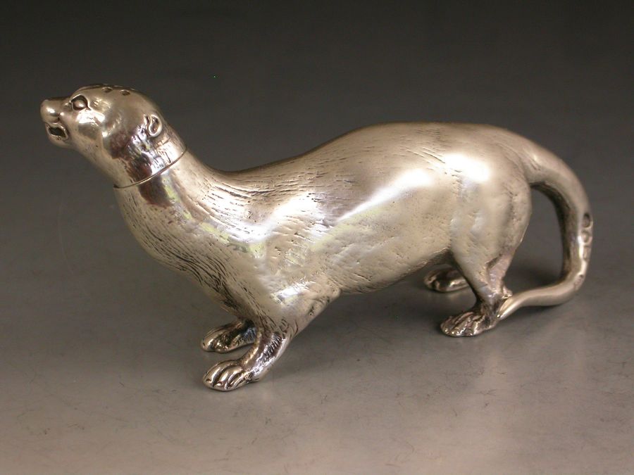 An extremely rare and fine quality novelty cast silver Pepper made in the form of an Otter. Pull-off pierced head.