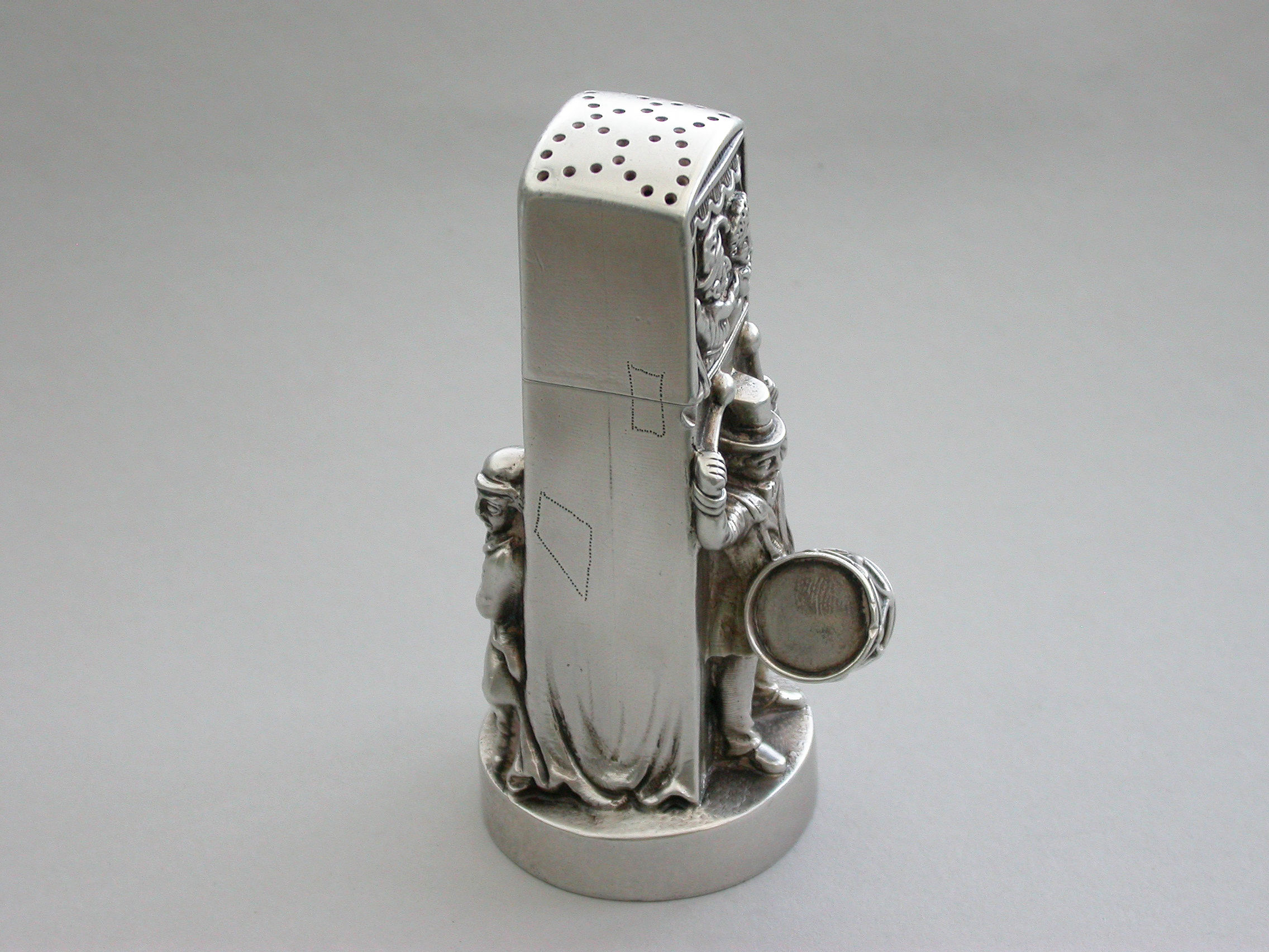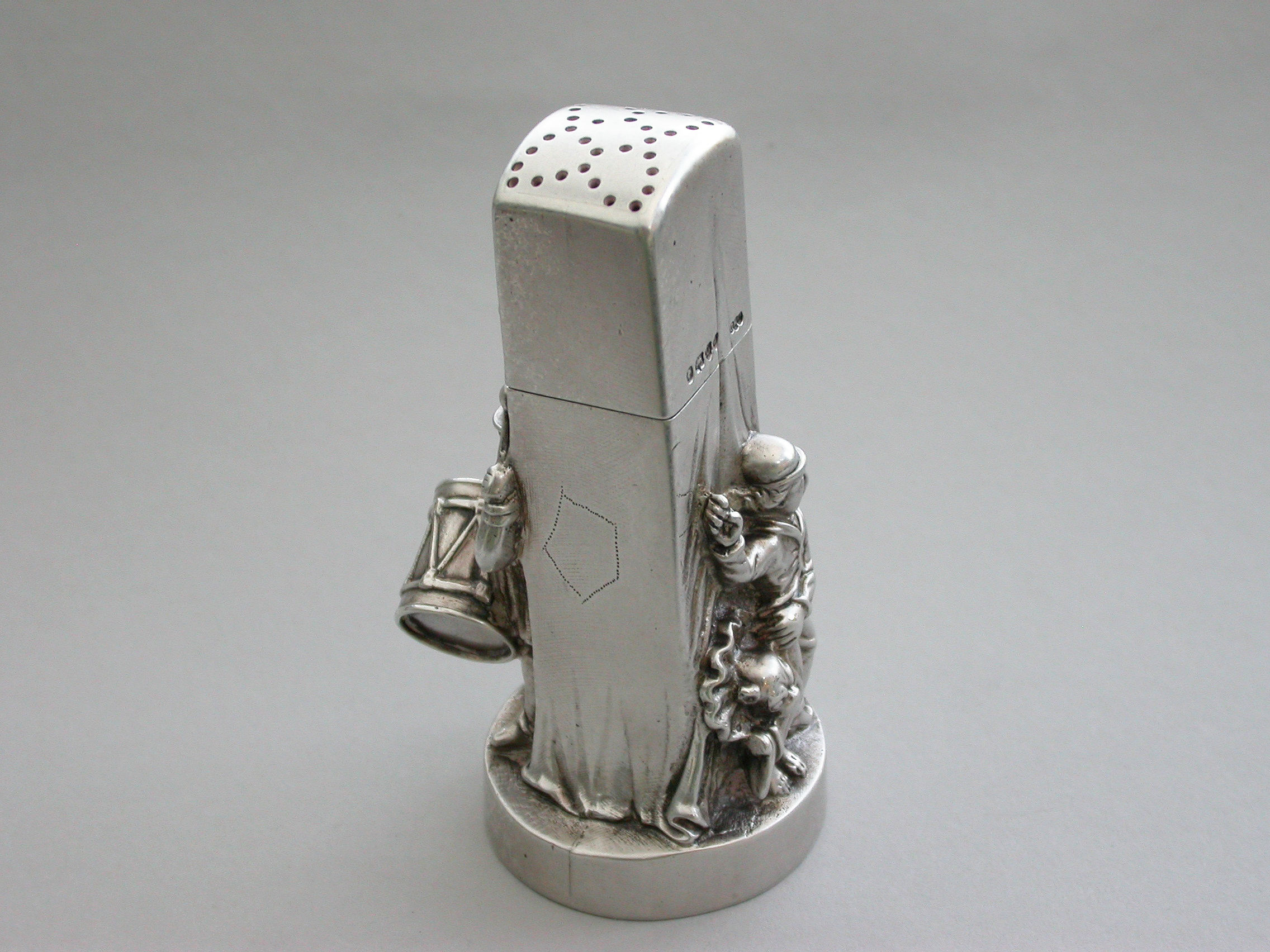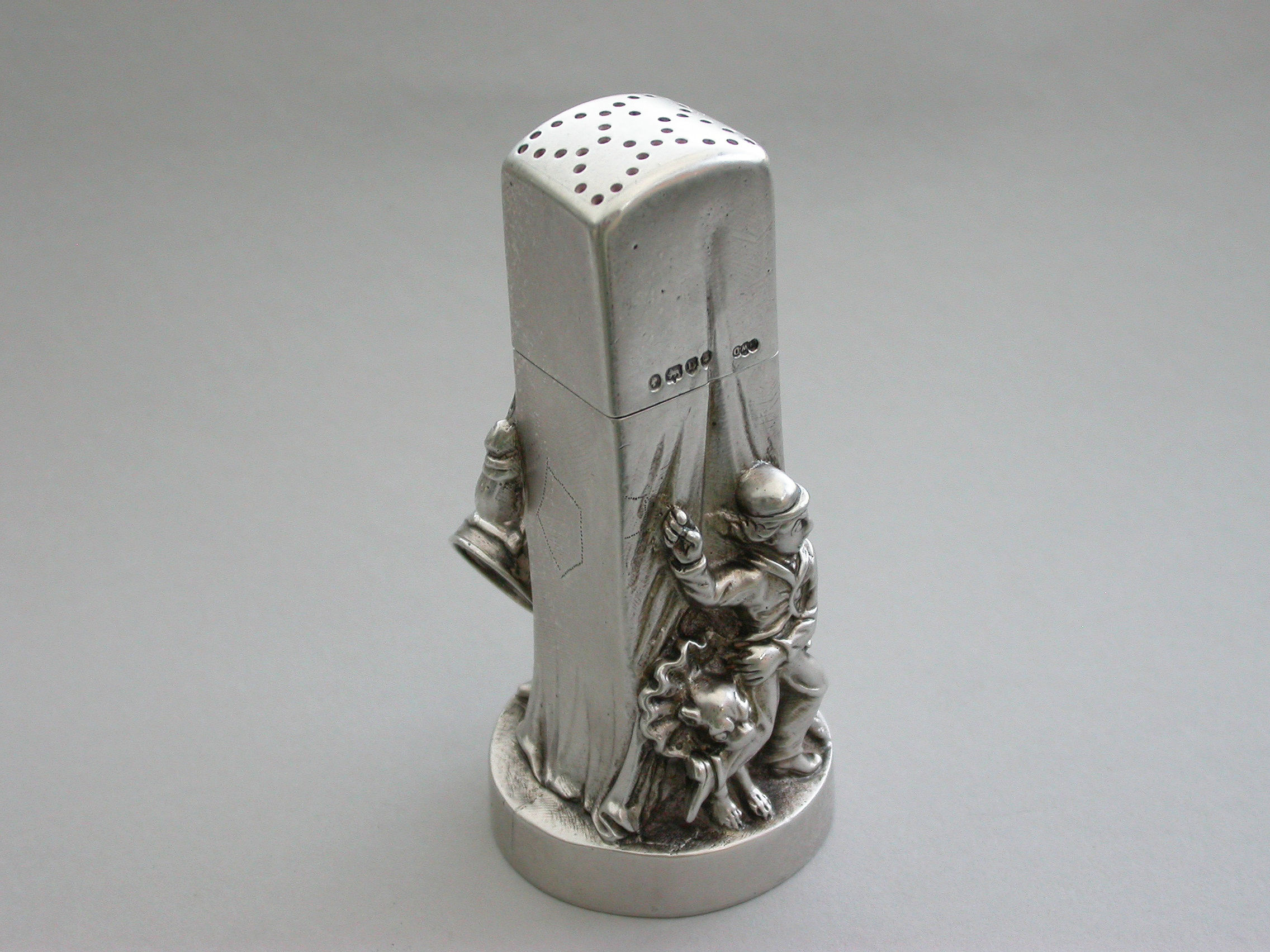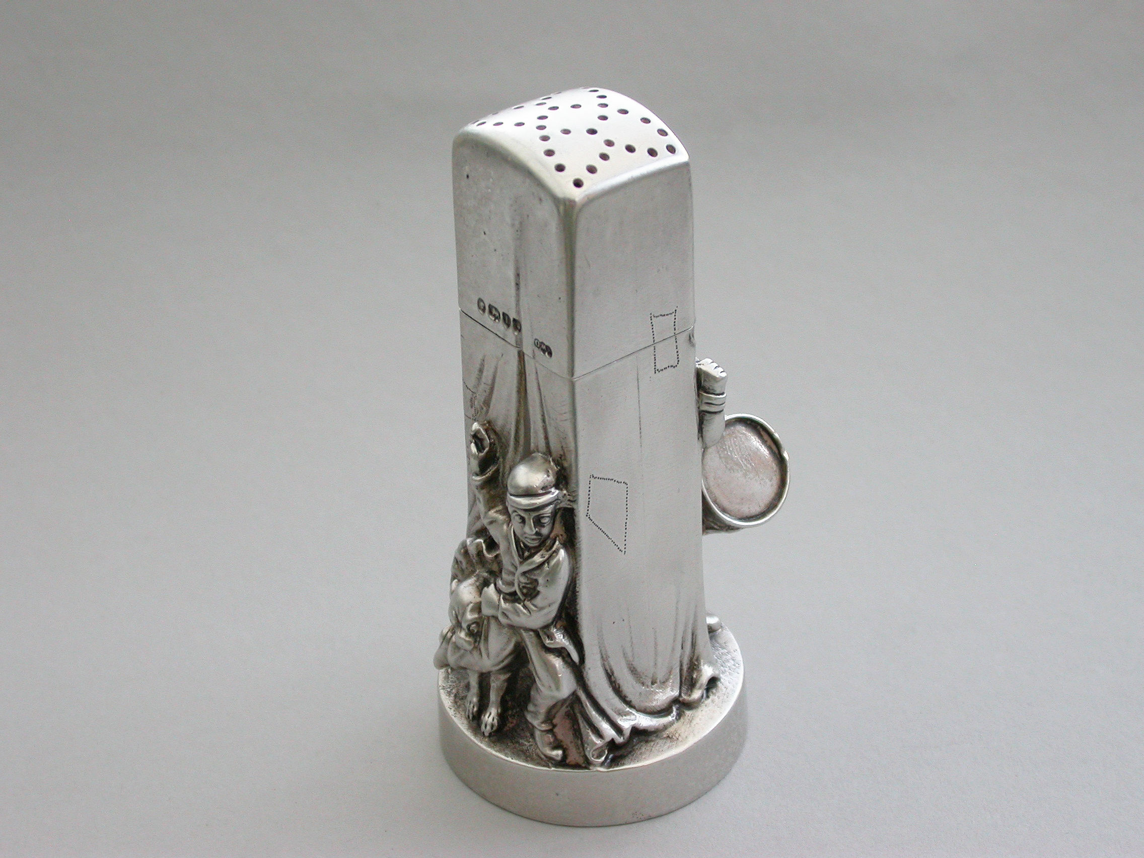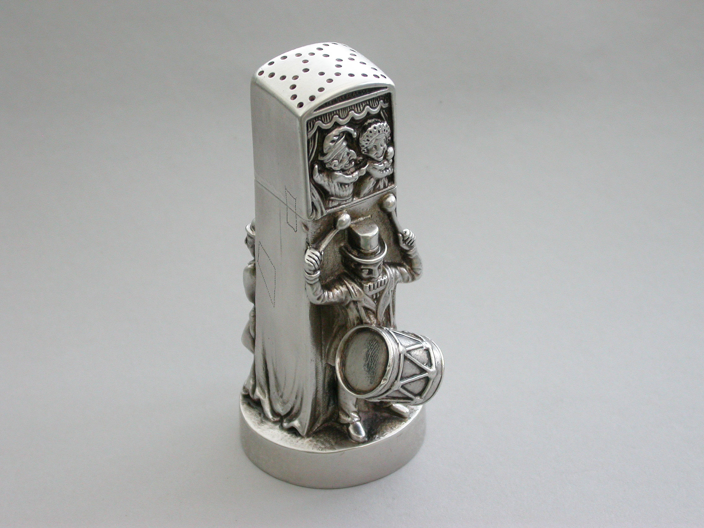 A very fine and unusual heavy Victorian novelty cast silver Pepper Pot, made in the form of a Punch and Judy puppet booth, with Punch and Judy holding the baby to the front along with a ""Bottler"" playing drums and a flute. Toby the dog appears from the back of the booth biting the leg of a fleeing boy. With pull-off cover and silver gilt interior.