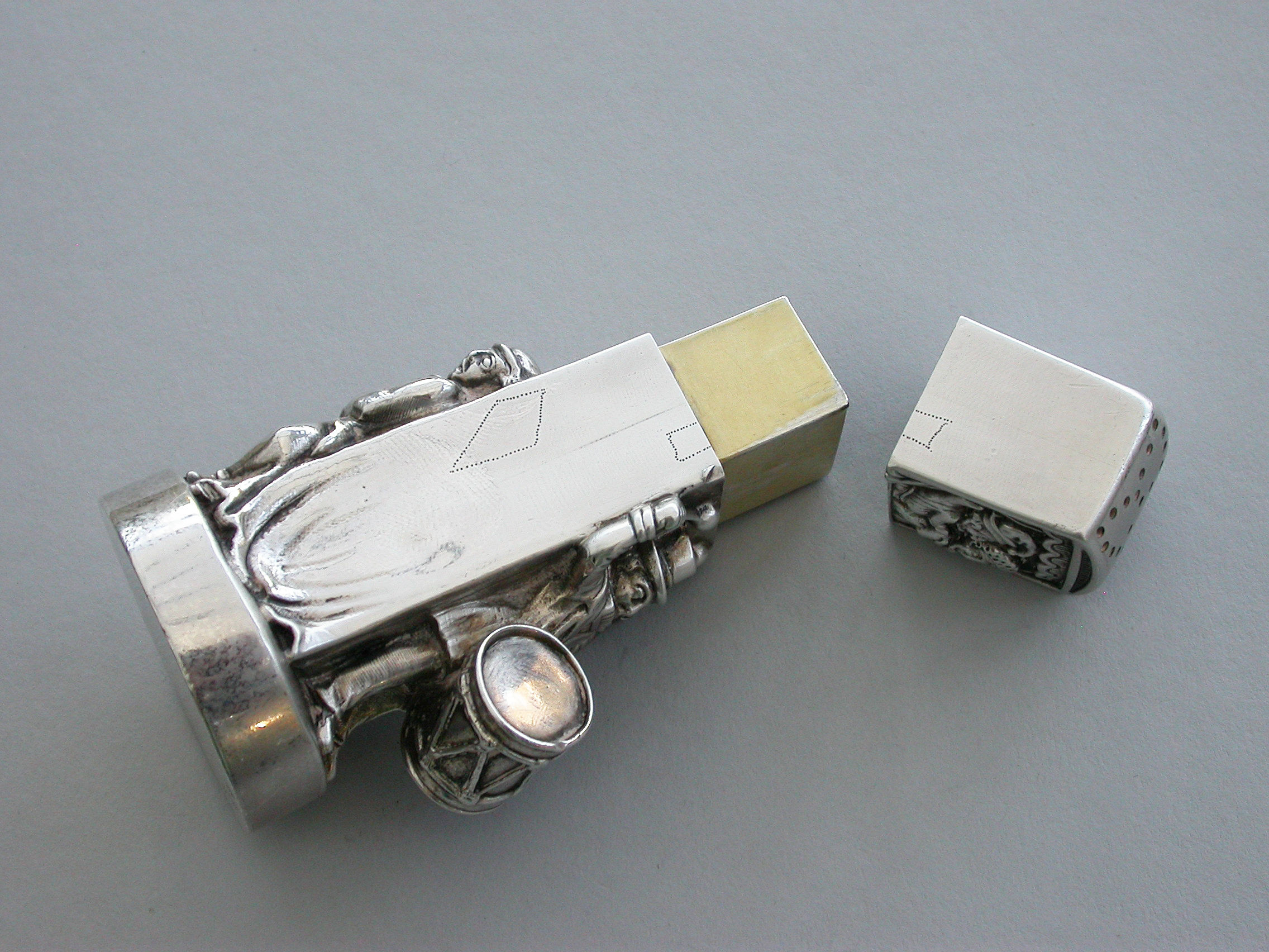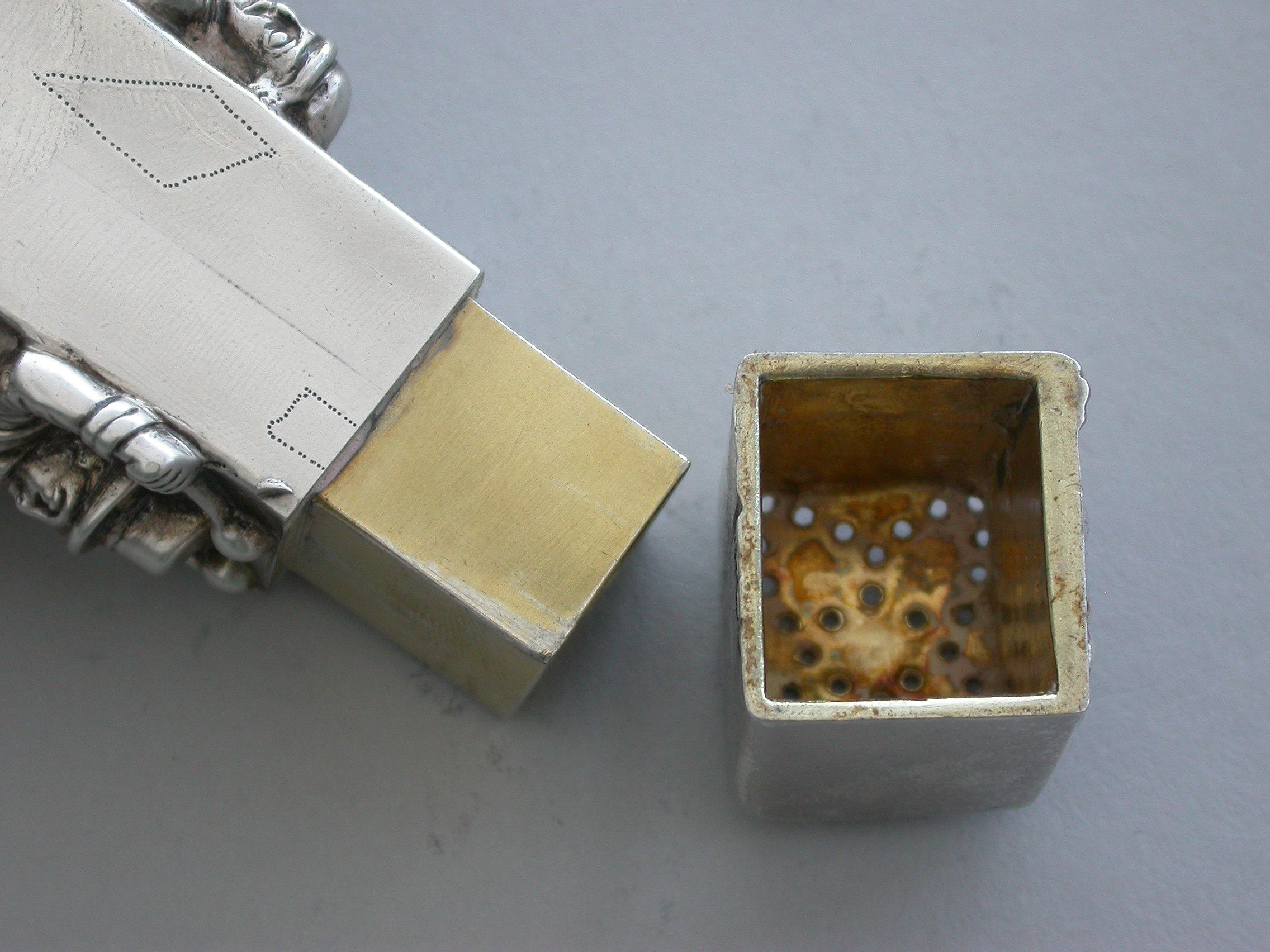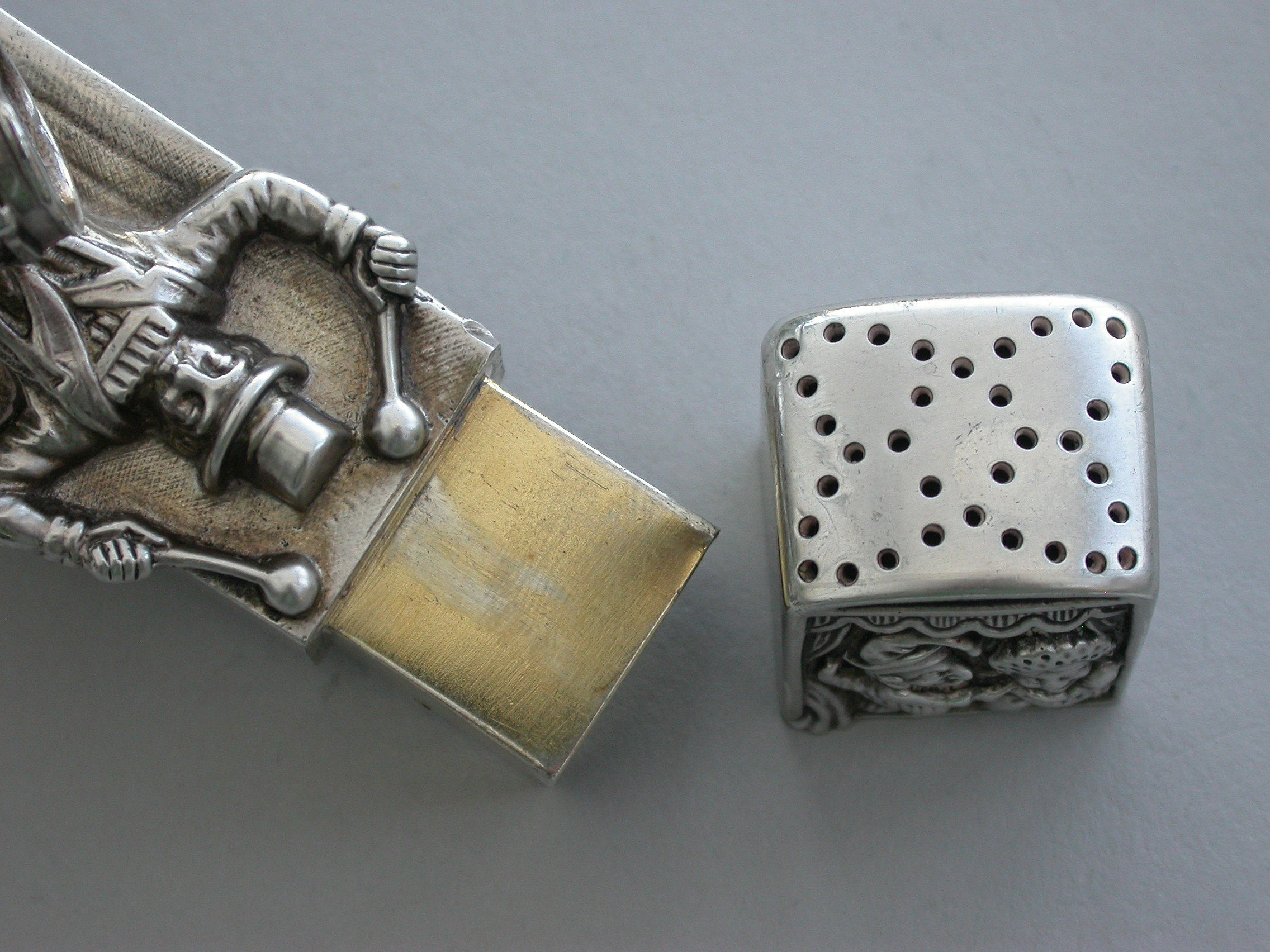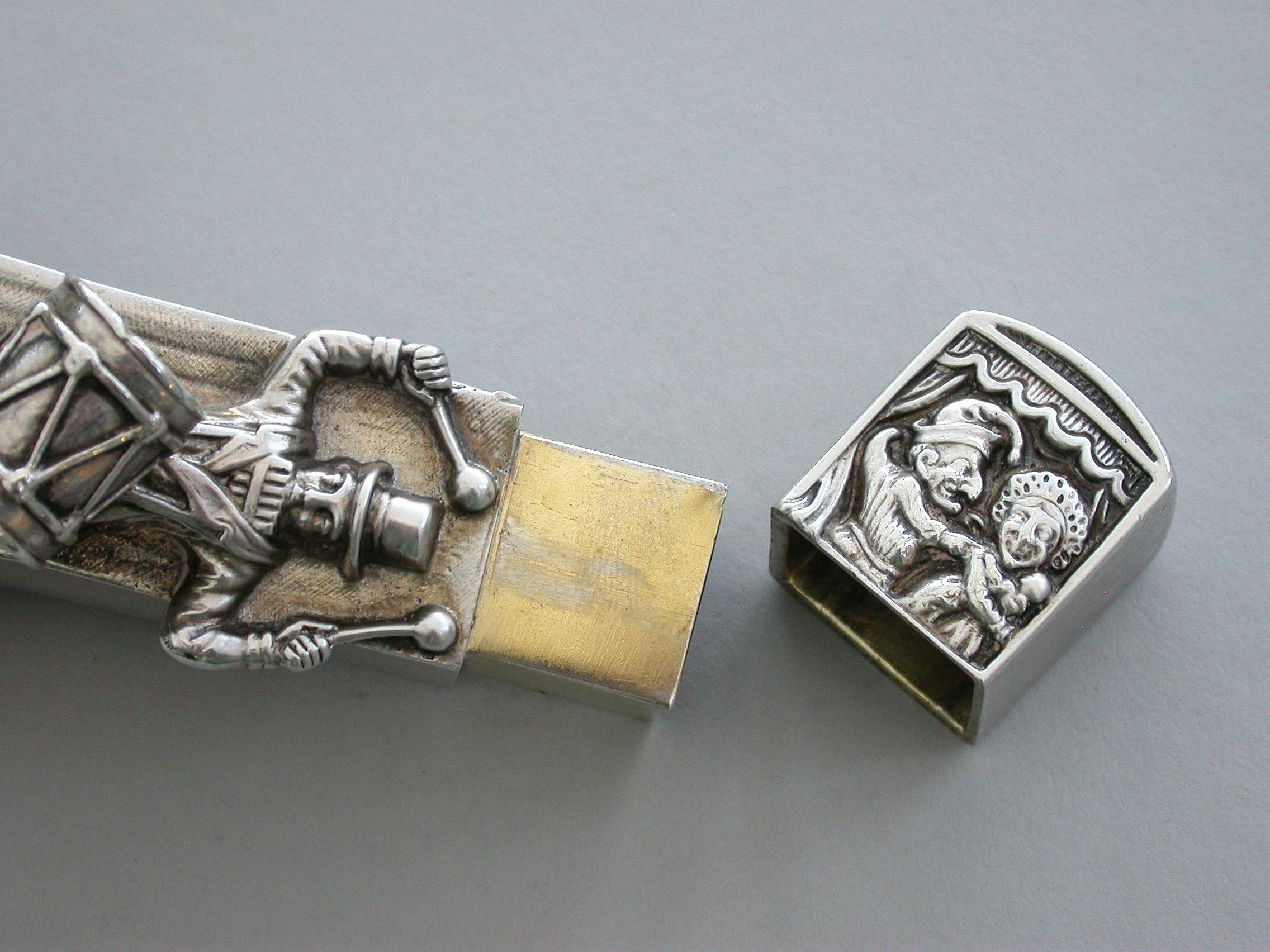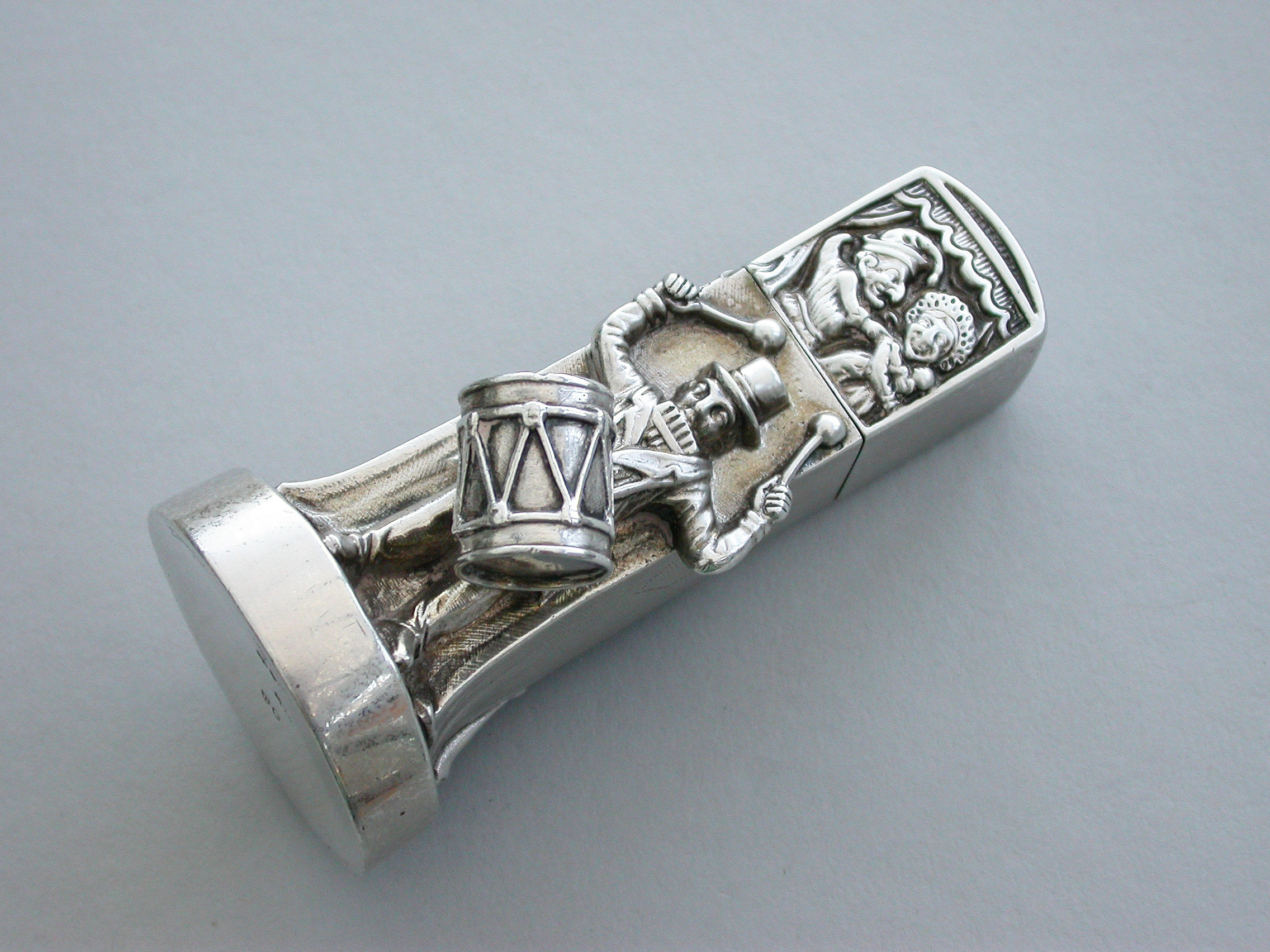 A very fine and unusual heavy Victorian novelty cast silver Pepper Pot, made in the form of a Punch and Judy puppet booth, with Punch and Judy holding the baby to the front along with a ""Bottler"" playing drums and a flute. Toby the dog appears from the back of the booth biting the leg of a fleeing boy. With pull-off cover and silver gilt interior.