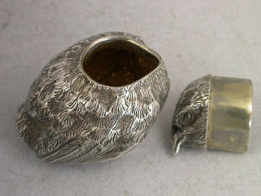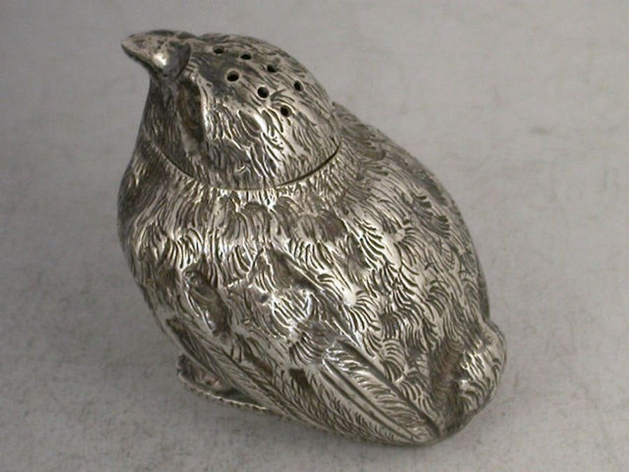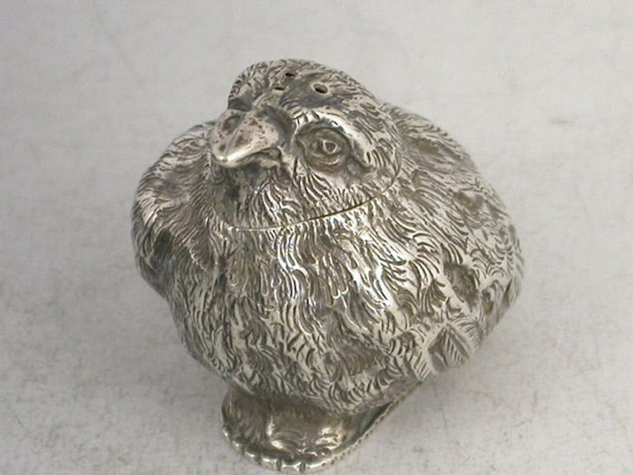 A rare Victorian Novelty silver Pepper in the form of a Chick, with pierced pull off cover and flat base.