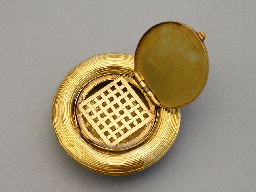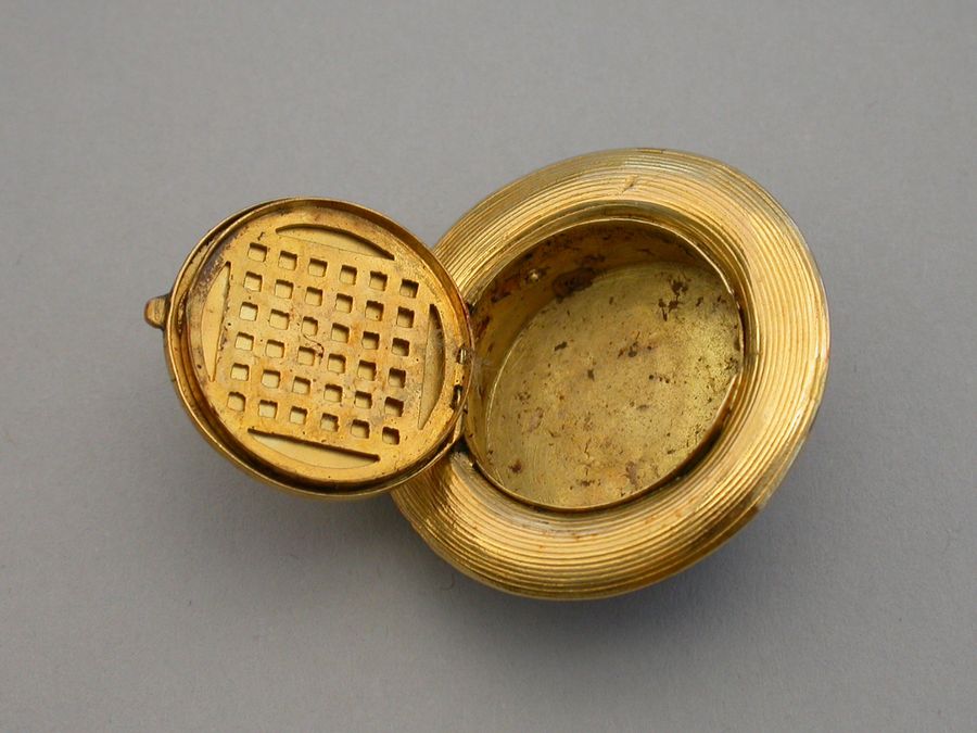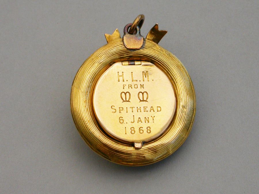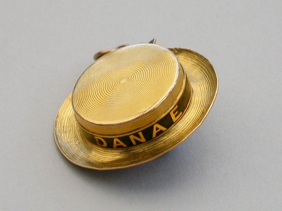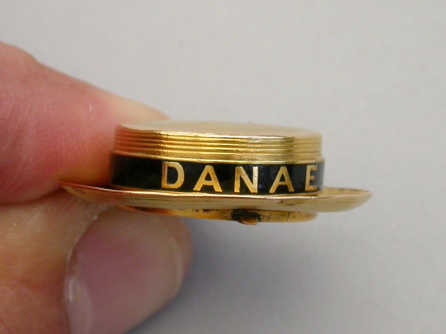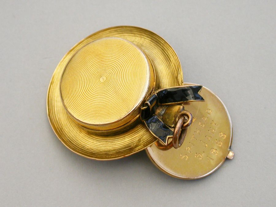 A Victorian gold and enamel Vinaigrette made in the form of a Sailors straw hat, the ribbon in black enamel, the ships name 'DANAE' picked out in gold. The hinged base engraved with a presentation inscription and dated 1868, opening to reveal a pierced grille made in the form of a ships deck grill.
