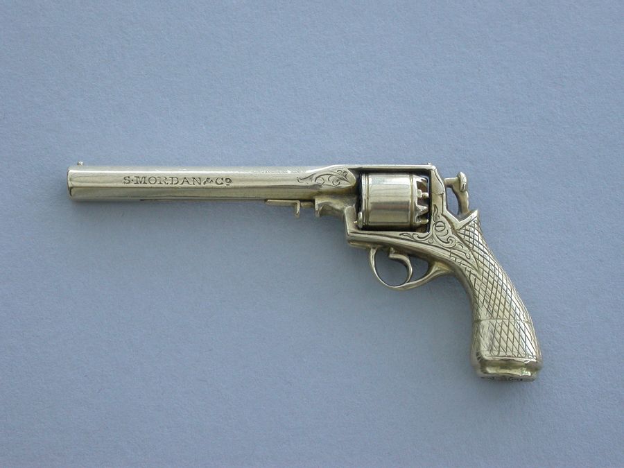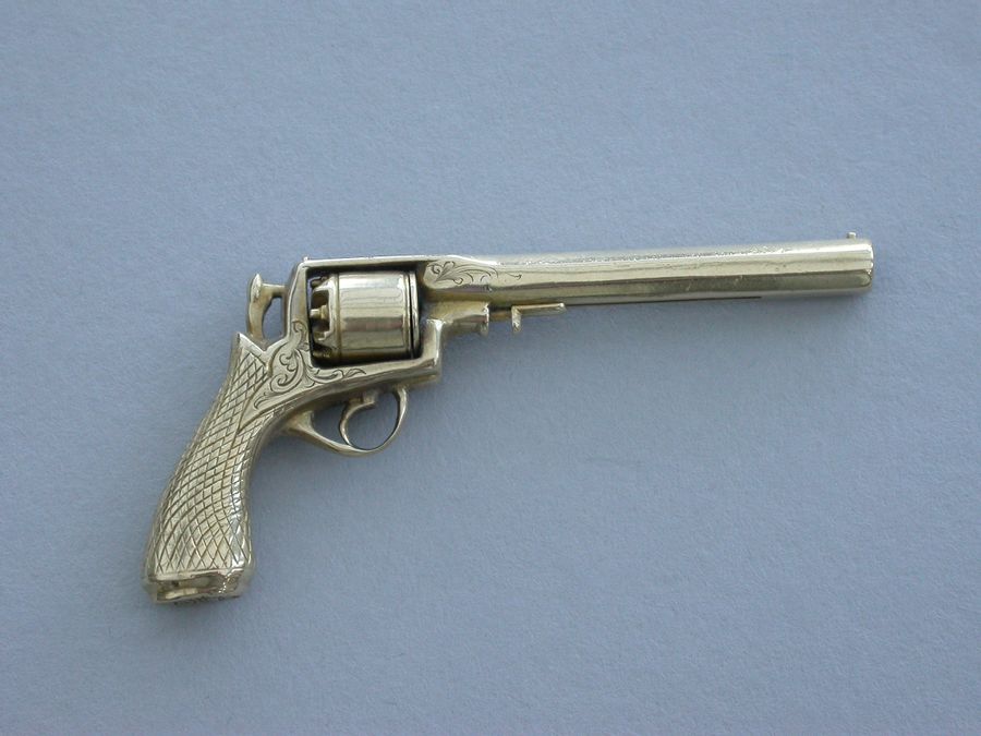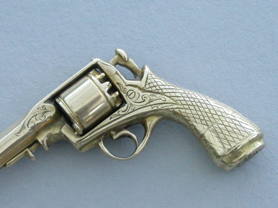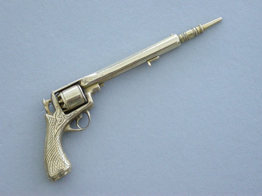 A rare Victorian novelty gold Propelling Pencil made in the form of a revolver, with textured grip and revolving cartridge case. A slider pin to extend the pencil. The butt plate stamped with a diamond registration mark for the 8th March 1855.