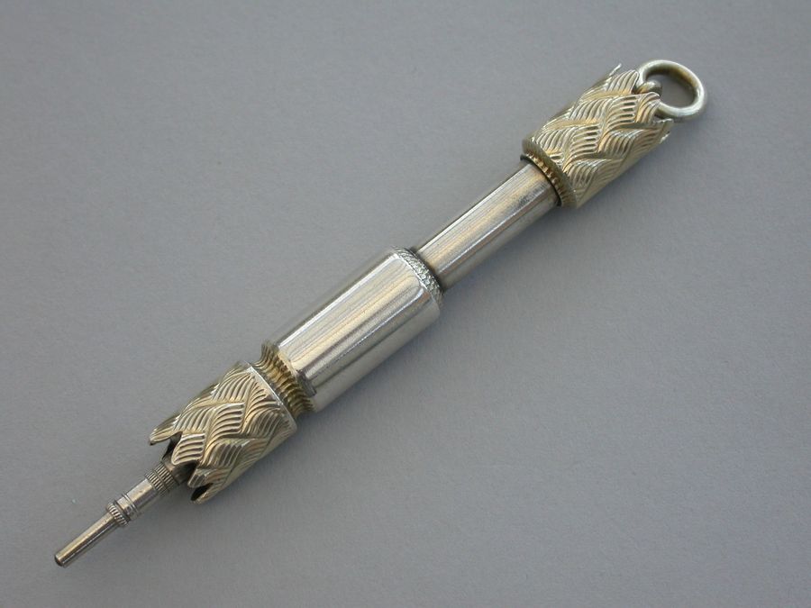 A fine and rare Victorian novelty parcel gilt silver telescopic Propelling Pencil made in the form of a Christmas Cracker with engraved gilded ends and attached suspension ring.
