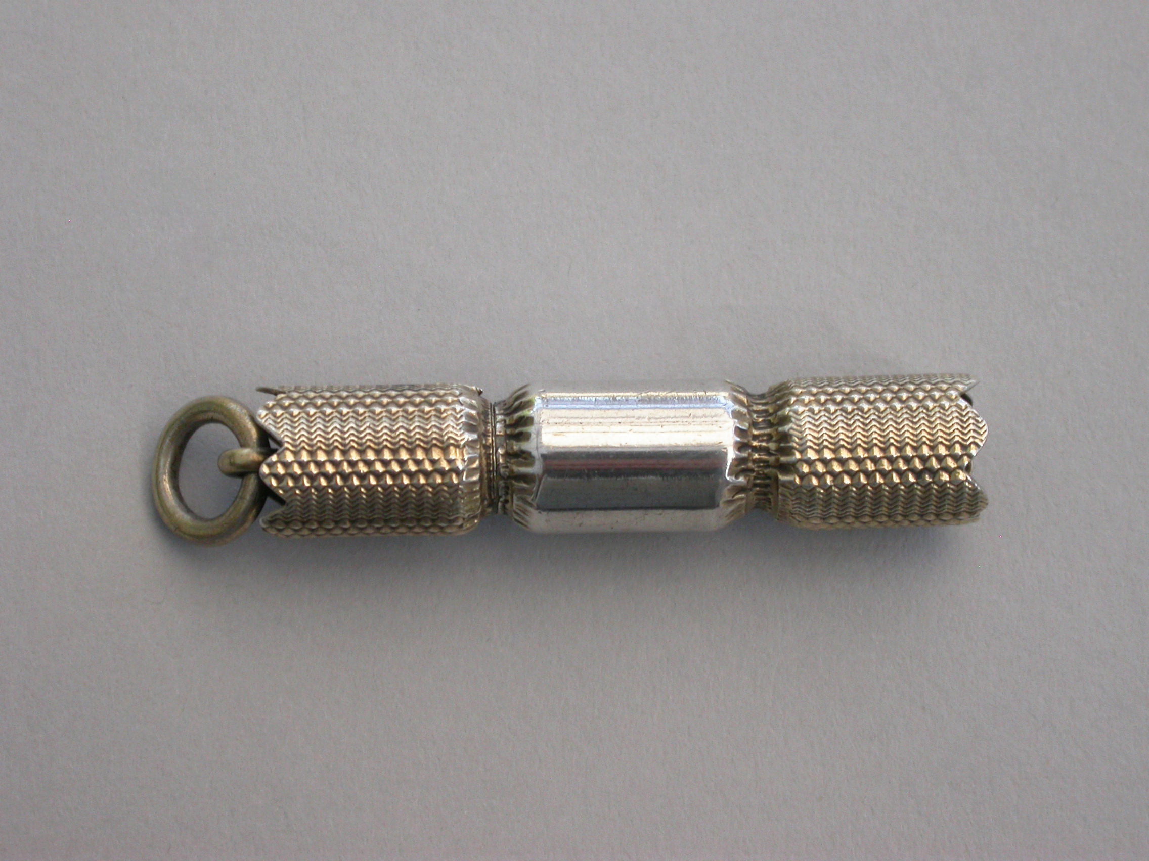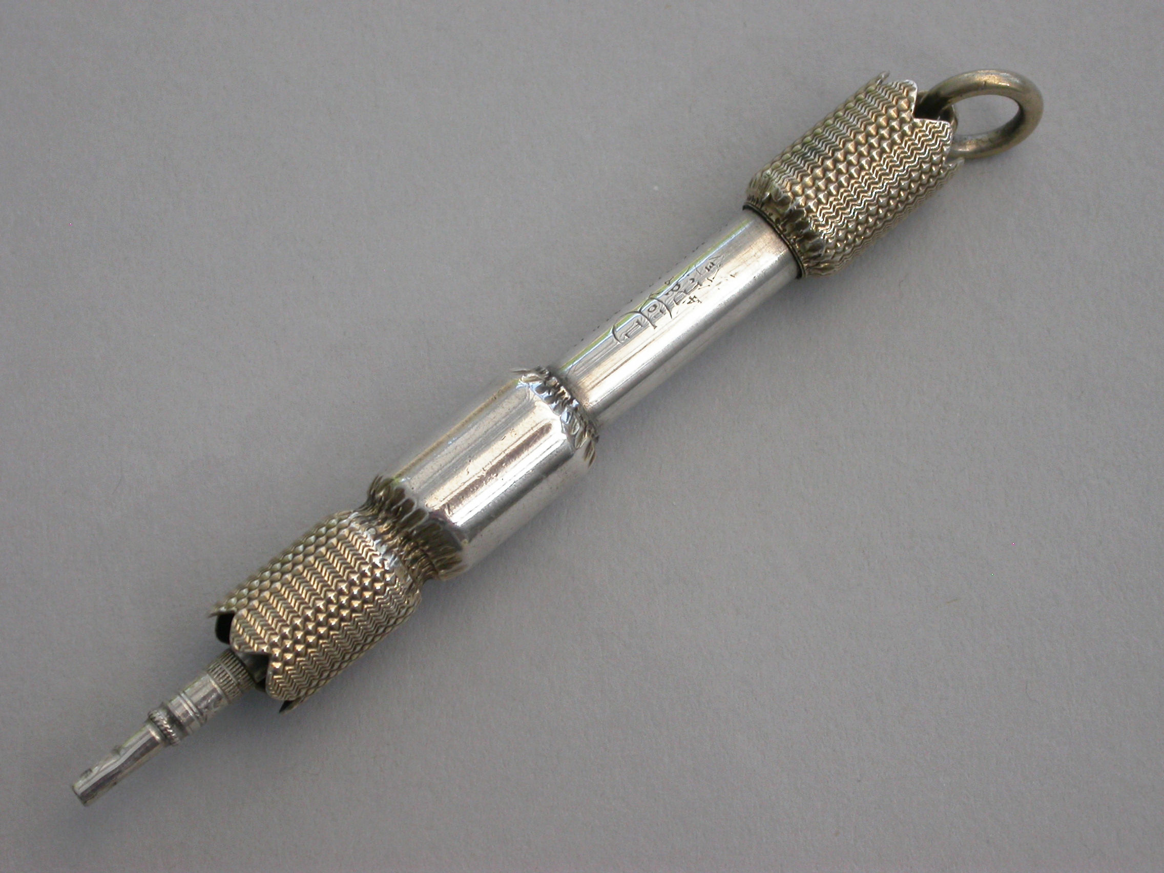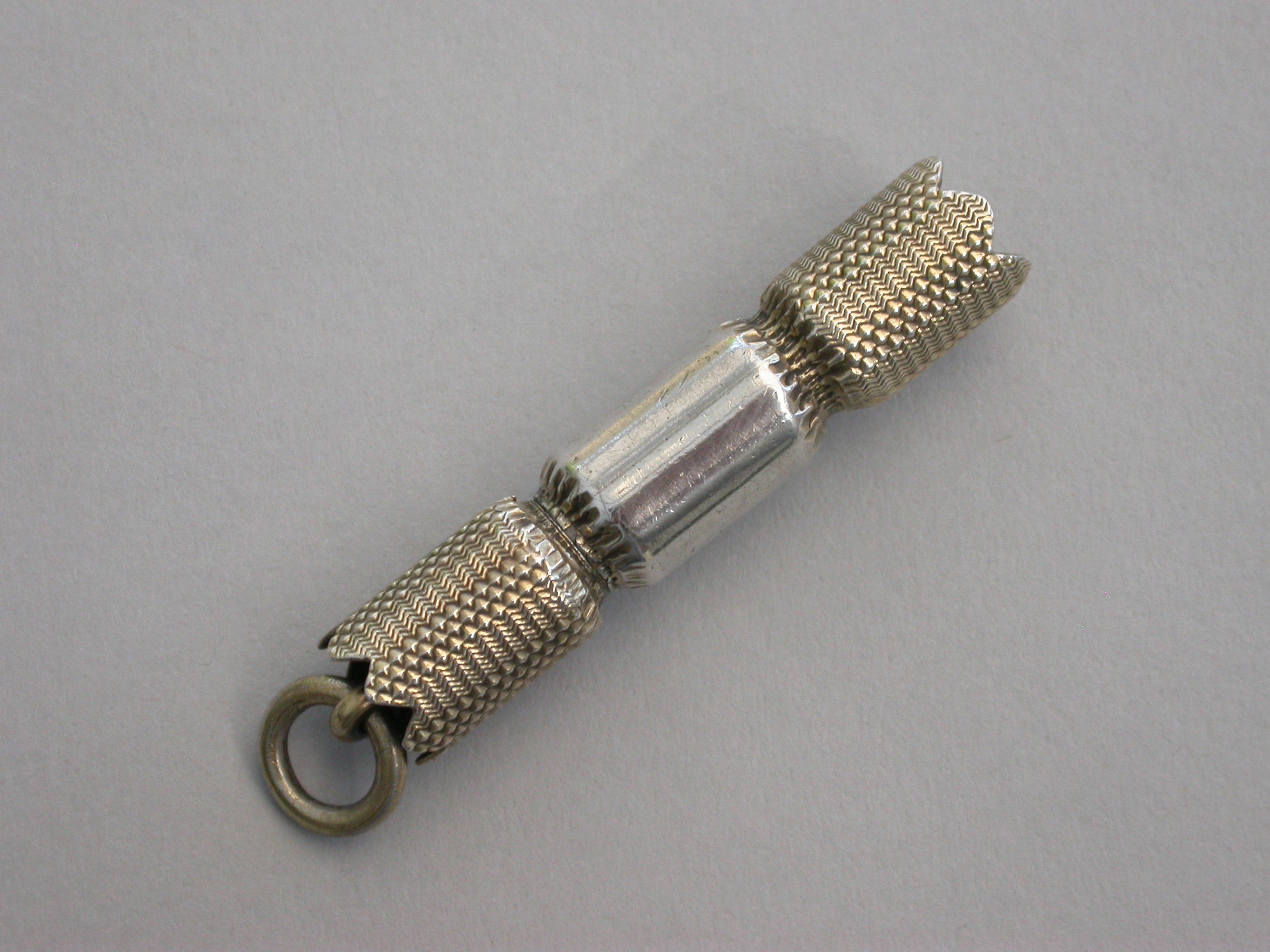 A fine and rare Victorian novelty parcel gilt silver telescopic Propelling Pencil made in the form of a Christmas Cracker with engraved gilded ends and attached suspension ring.