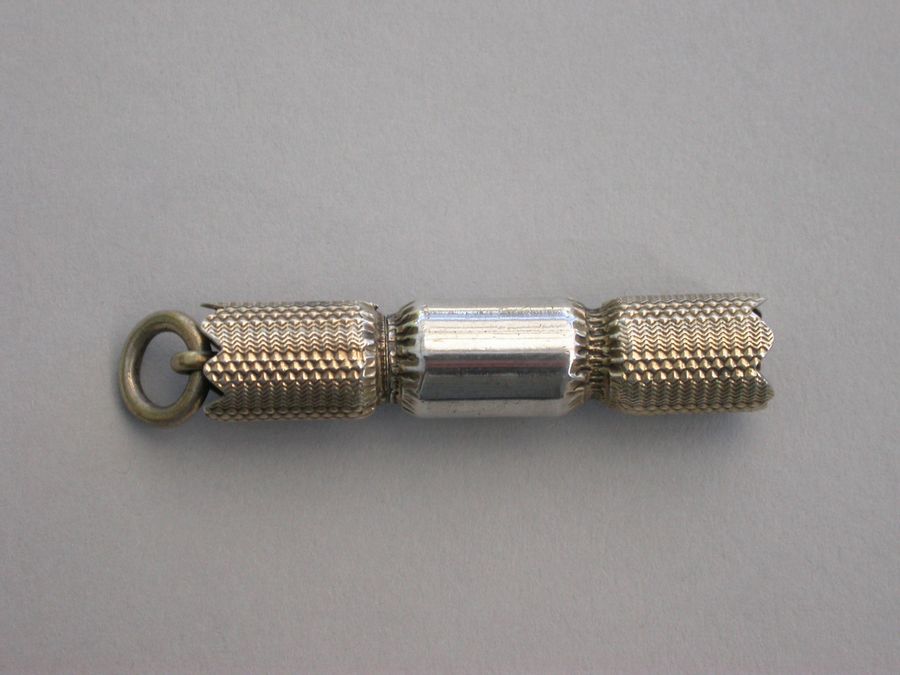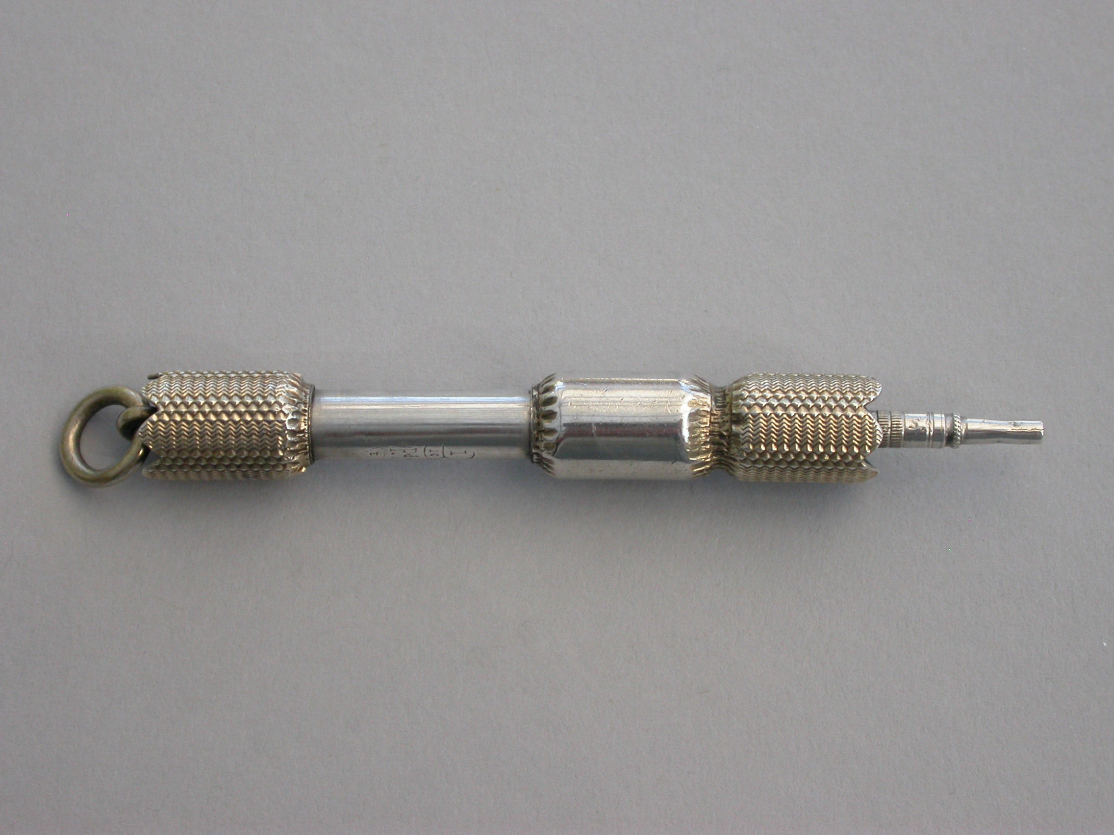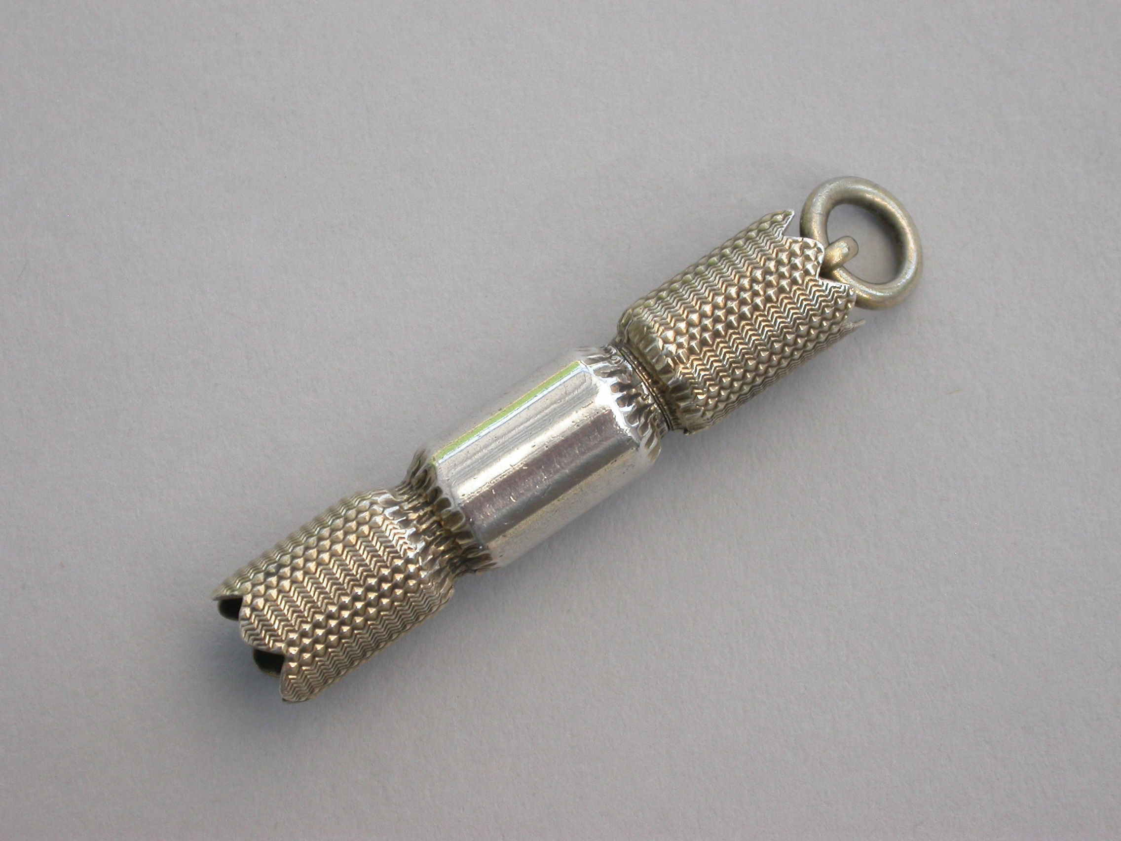 A fine and rare Victorian novelty parcel gilt silver telescopic Propelling Pencil made in the form of a Christmas Cracker with engraved gilded ends and attached suspension ring.