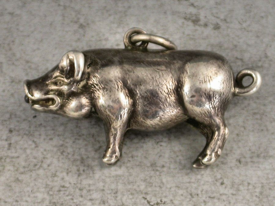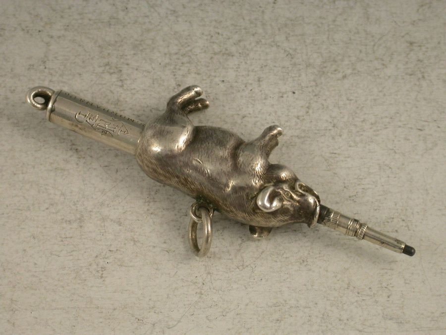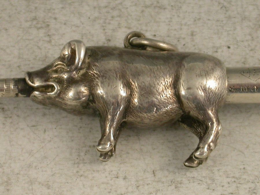 A rare Victorian novelty silver Propelling Pencil in the form of a pig, the pencil extending out from his mouth and tail.