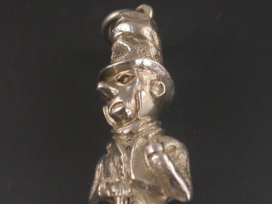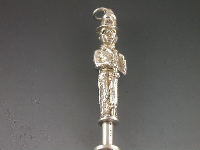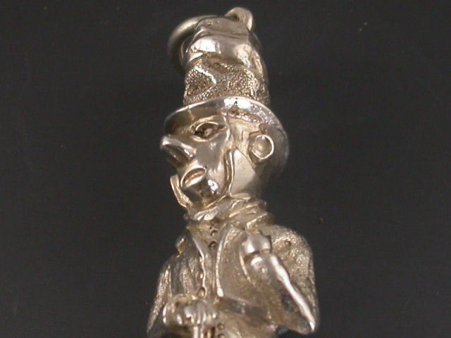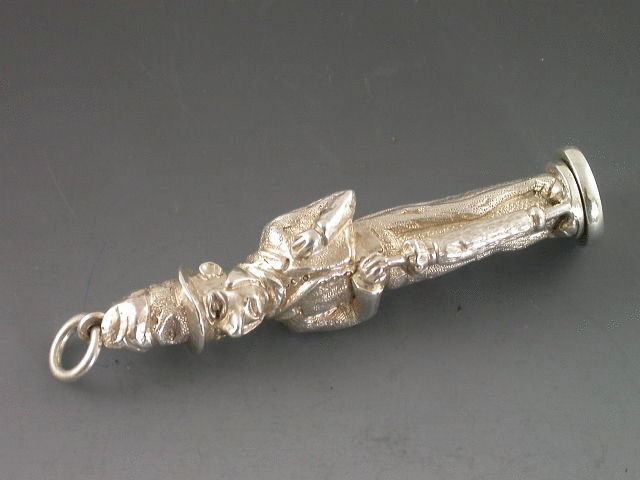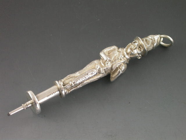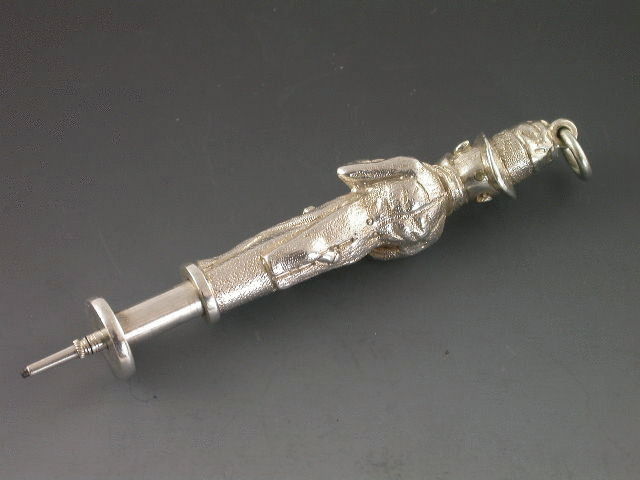 An extremely rare Victorian silver telescopic Propelling Pencil realistically cast as Ally Sloper, the Victorian comic strip hero, holding his battered umbrella and with his concealed bottle in his rear coat pocket. Ally Sloper's Half Holiday was the name of a weekly comic strip which first appeared on 3 May 1884. From 1884 until the 1920s, the red-nosed social climber who poked fun at the English people and their customs was a household name and national favourite. This man became an institution and a national hero. People actually believed that he existed; they even wrote to him and joined his club. There were medals presented in his name. He represented the hopes and aspirations of a whole new class of people, brought about by the industrial revolution.
