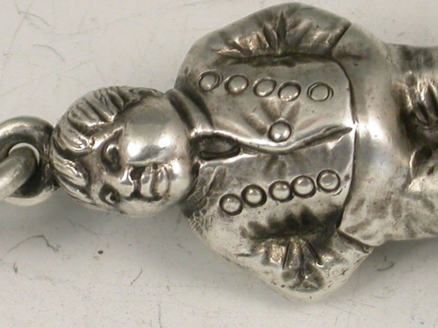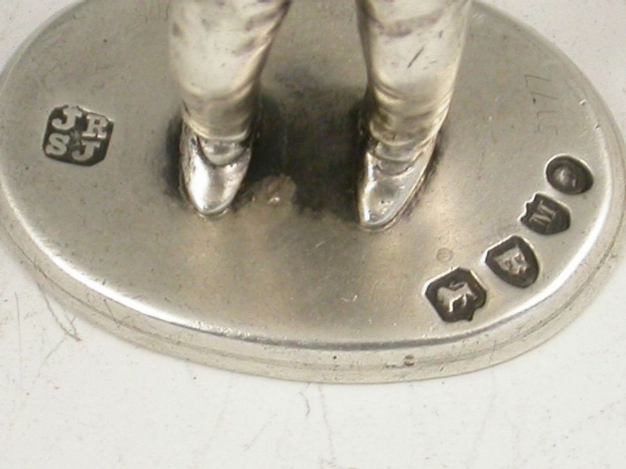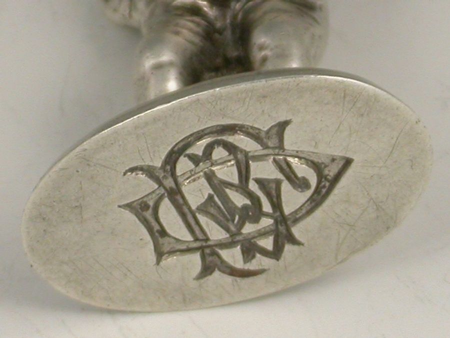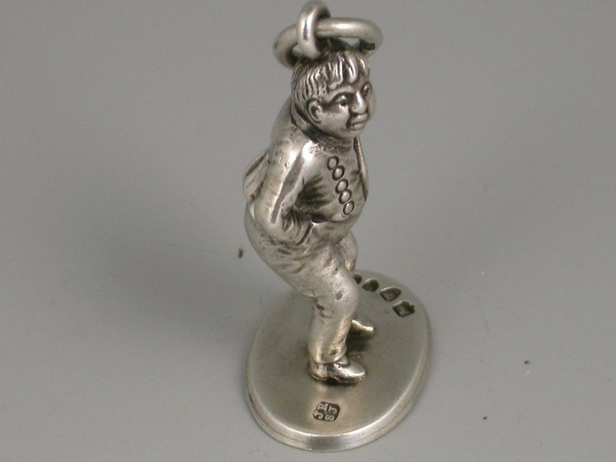 Victorian novelty cast silver Seal formed as the nursery rhyme character Little 'Tommy Tucker’, with attached suspension ring, the oval base engraved with a cipher – L D B A.