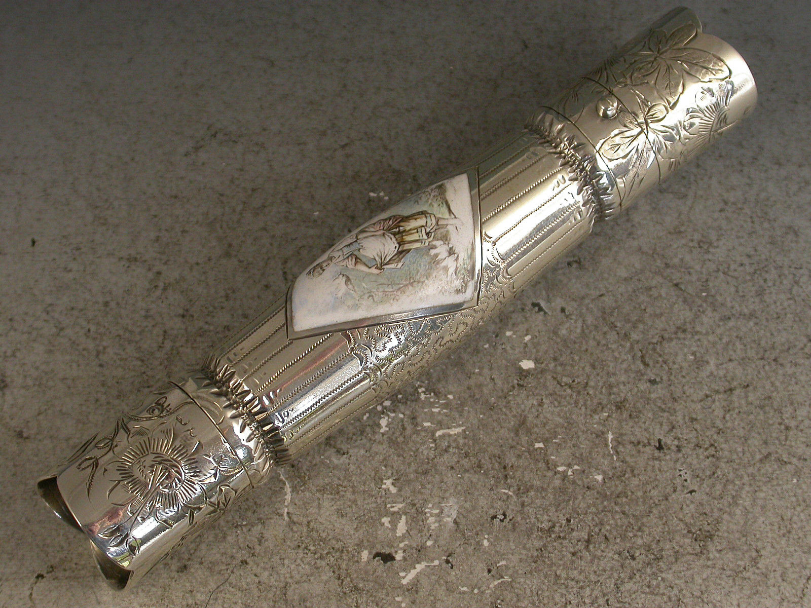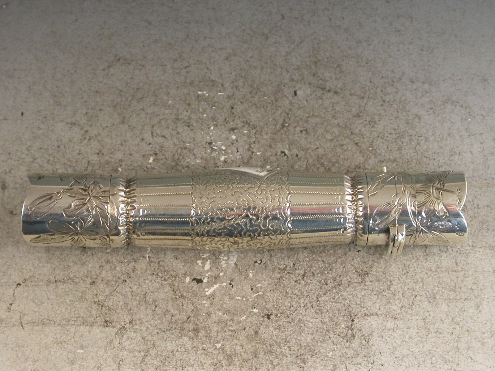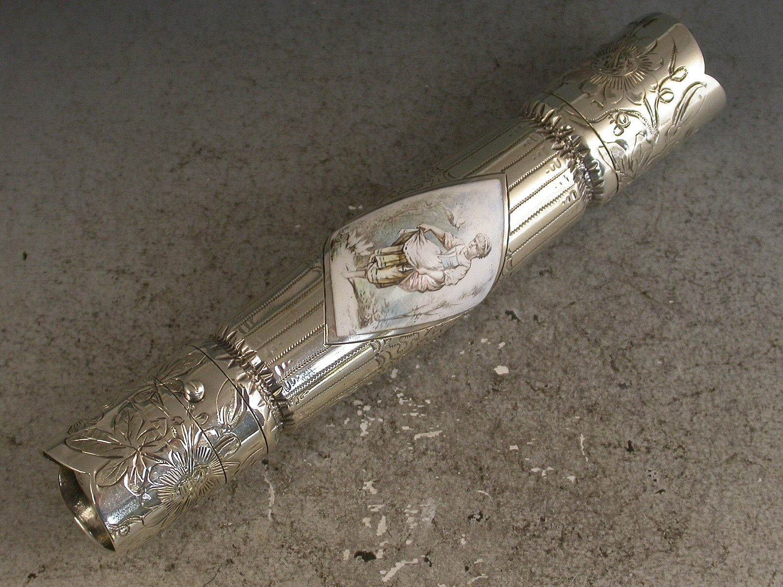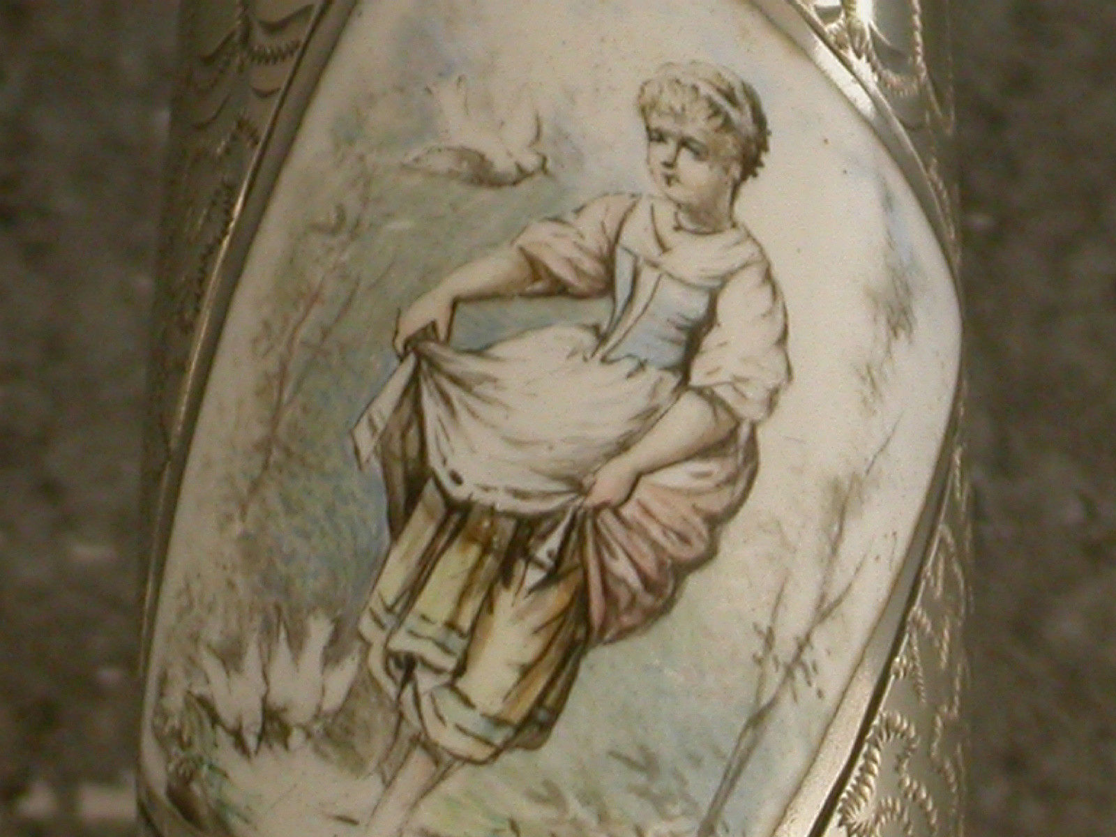 An extremely fine and rare novelty silver double ended Scent Bottle made in the form of a Christmas Cracker, inset with an enamel panel depicting a young girl in a garden scene accompanied by white doves. The body of the cracker with bright cut and wriggle work engraved decoration. One end with screw off cover sealed with cork, the other with sprung hinged flip top cover with glass and metal plate seal.