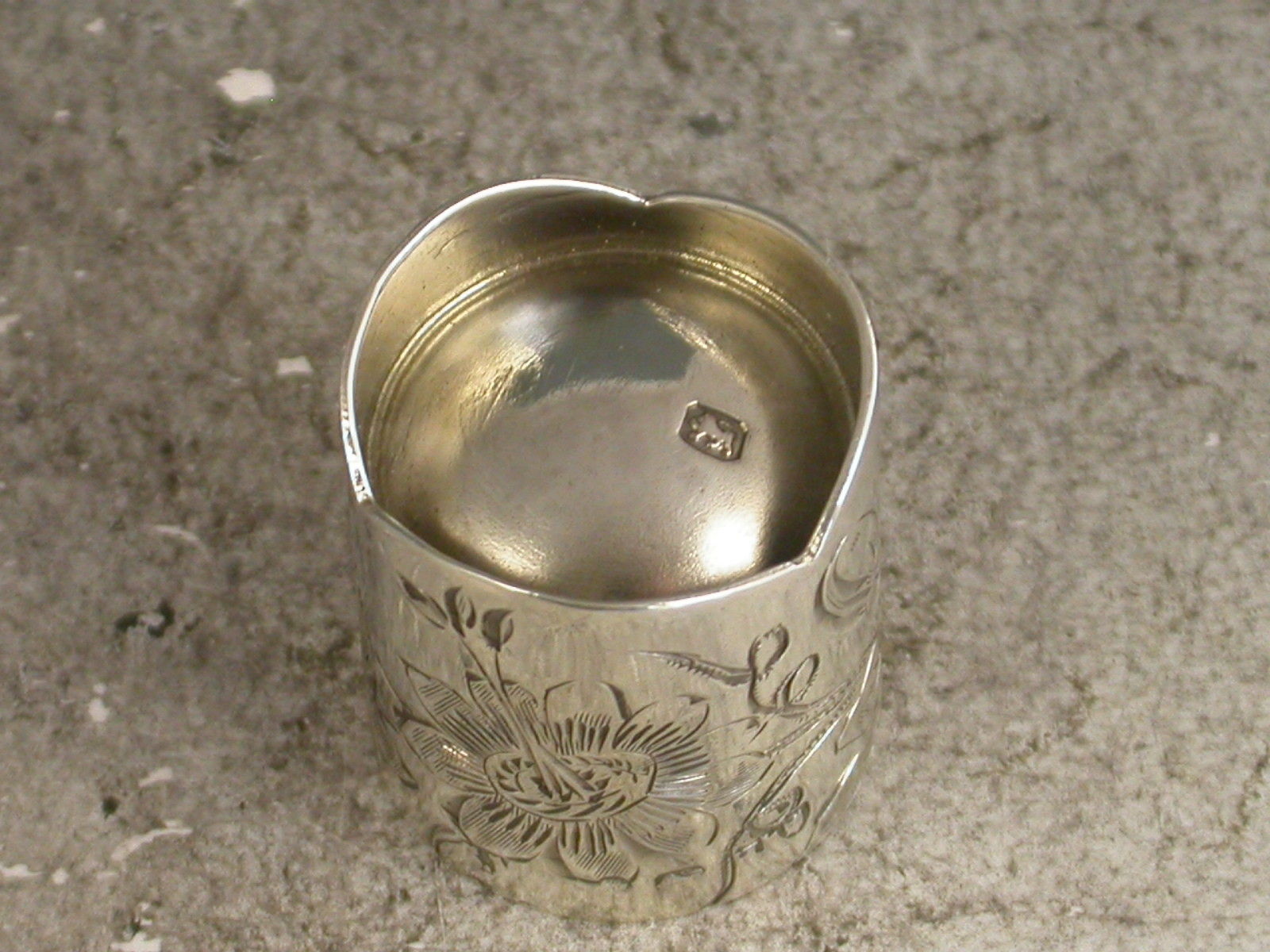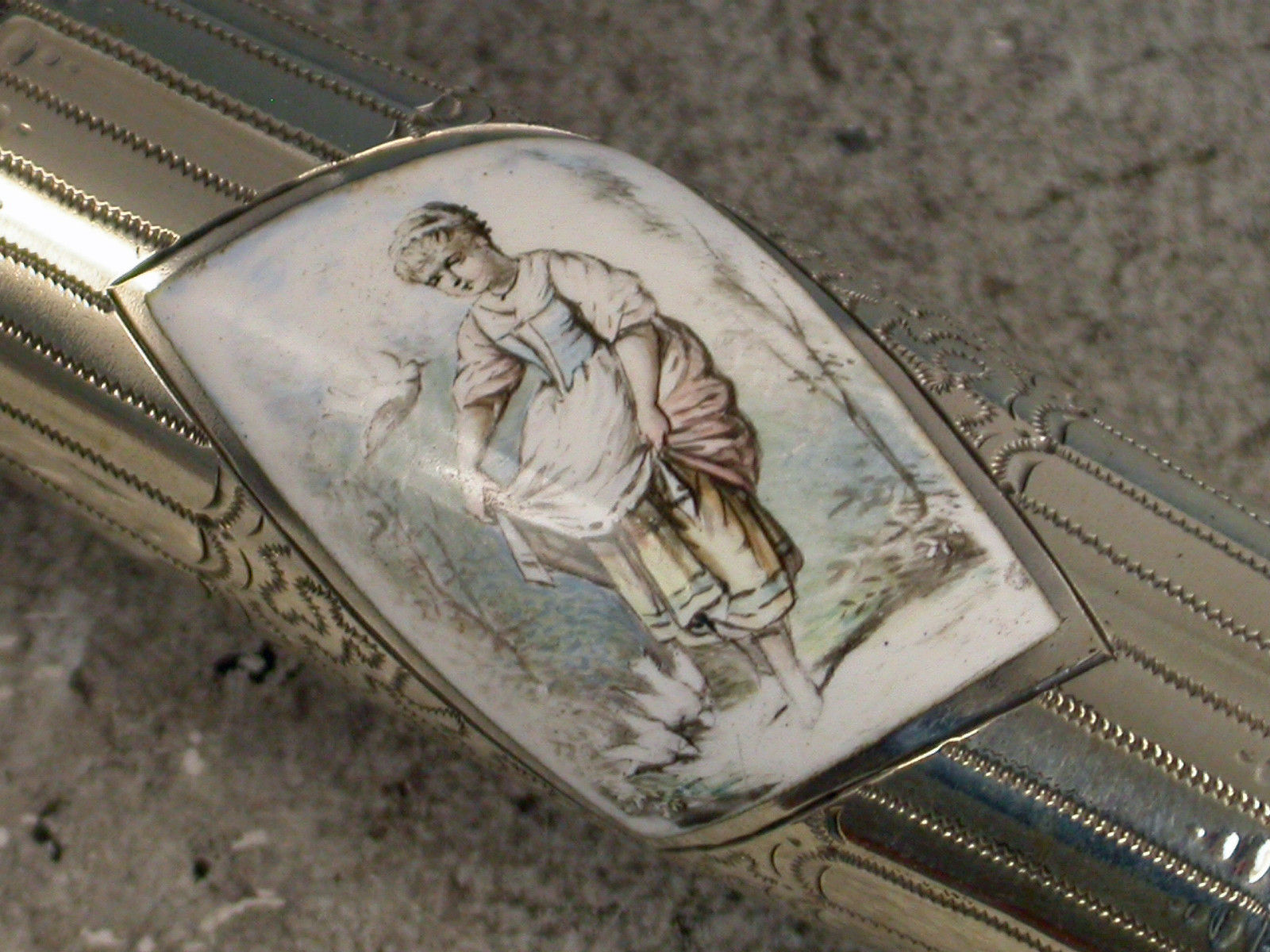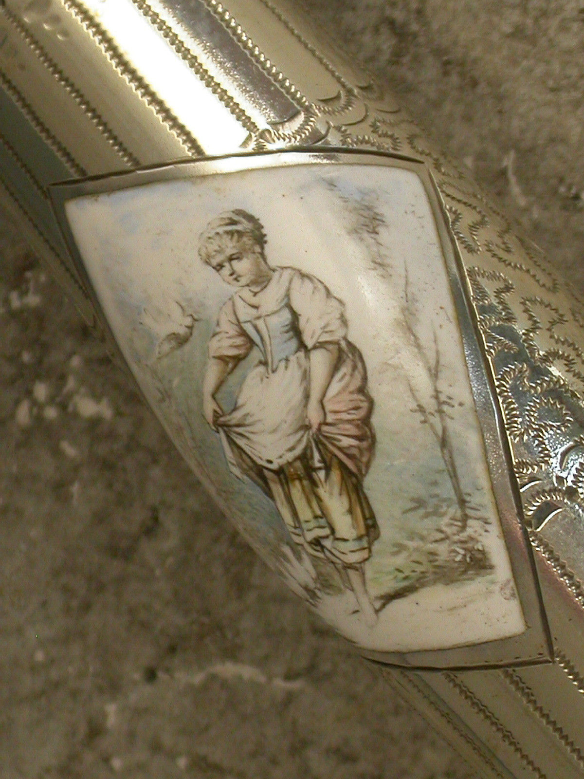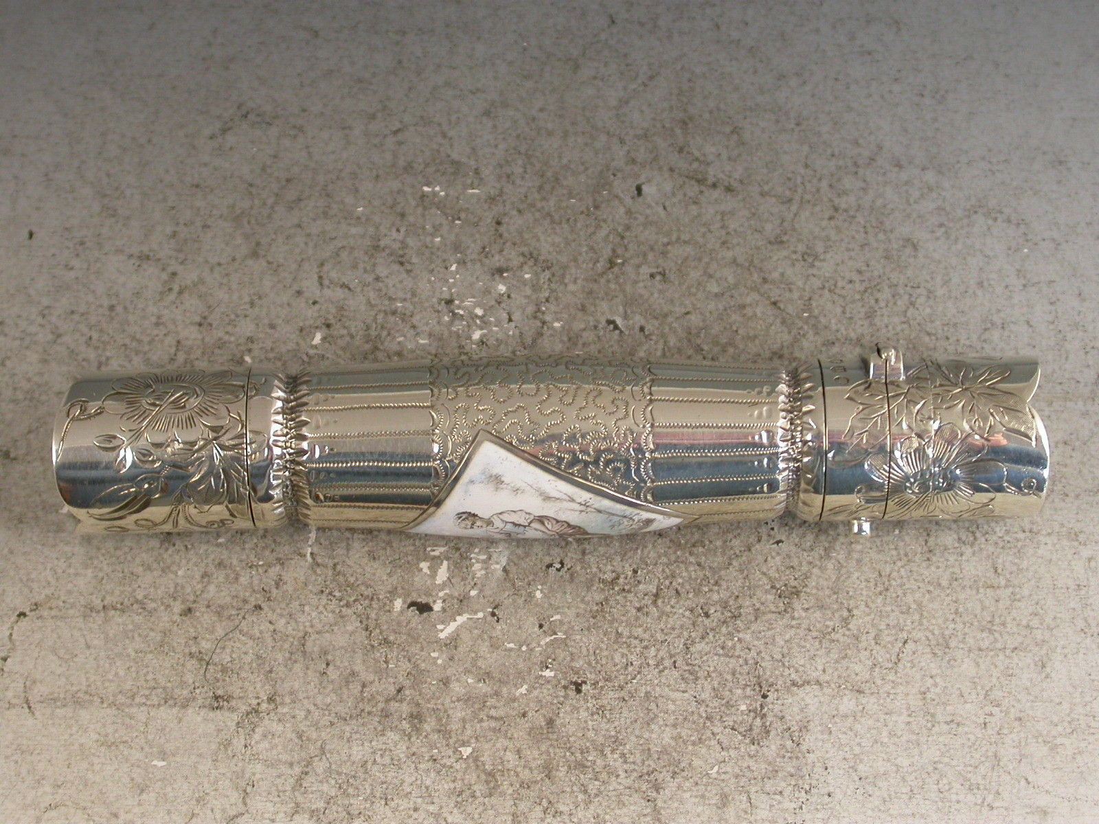 An extremely fine and rare novelty silver double ended Scent Bottle made in the form of a Christmas Cracker, inset with an enamel panel depicting a young girl in a garden scene accompanied by white doves. The body of the cracker with bright cut and wriggle work engraved decoration. One end with screw off cover sealed with cork, the other with sprung hinged flip top cover with glass and metal plate seal.