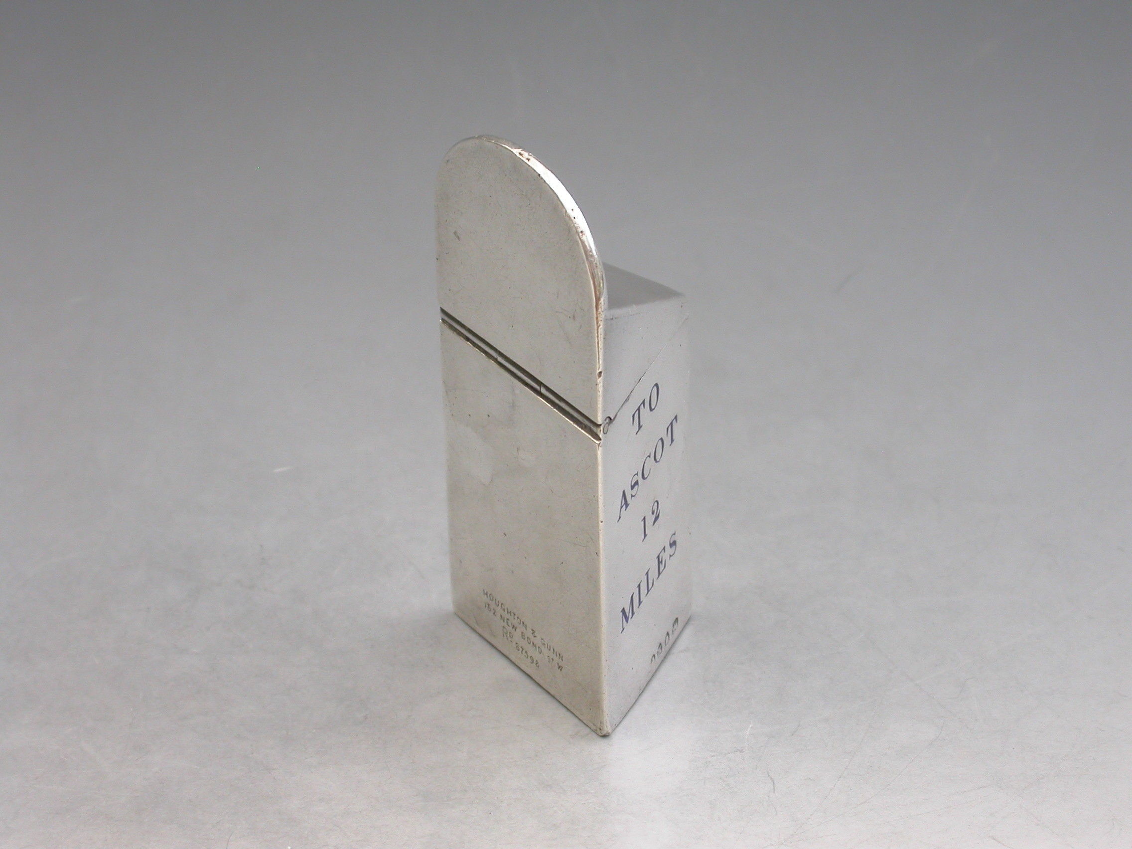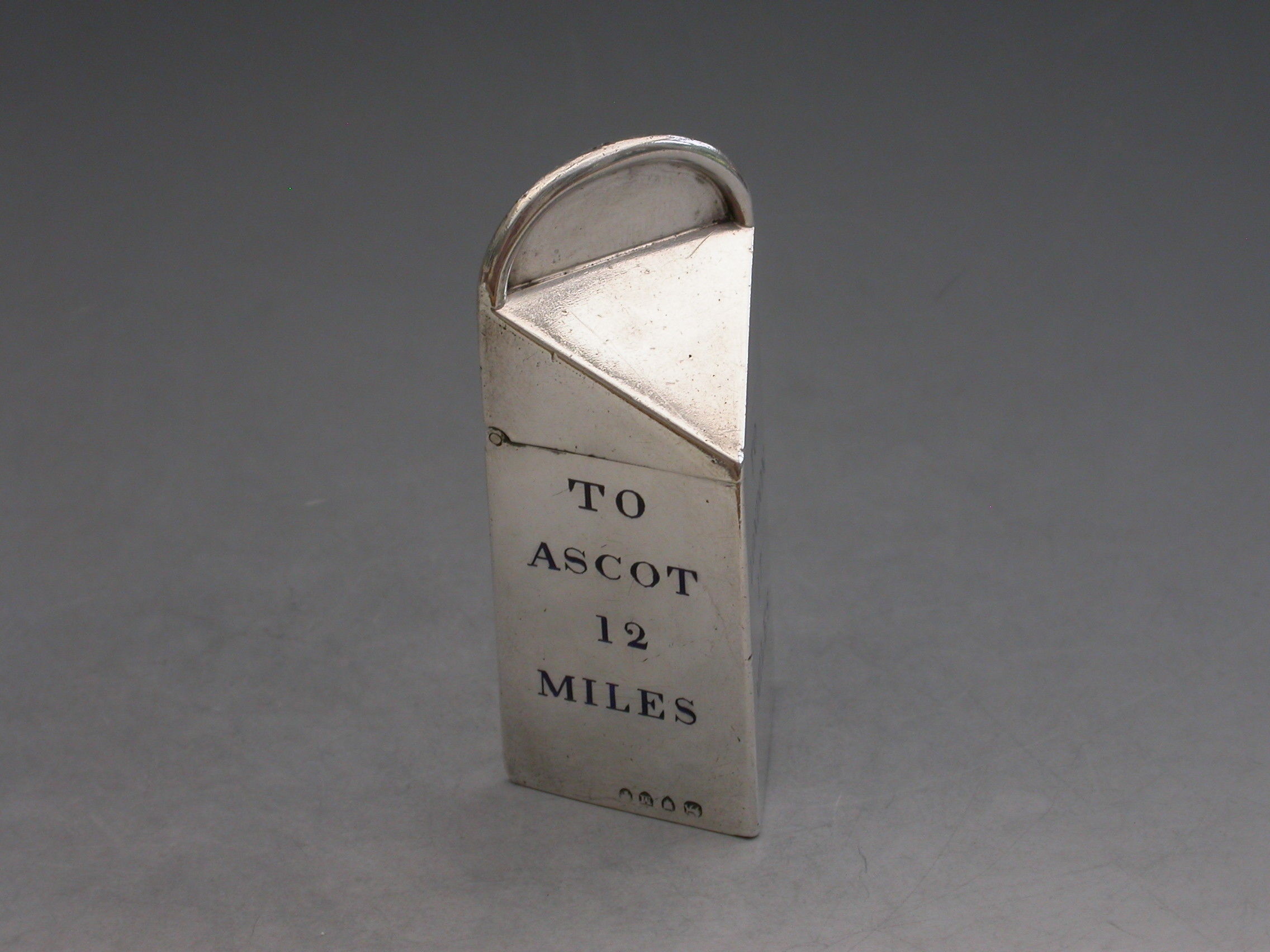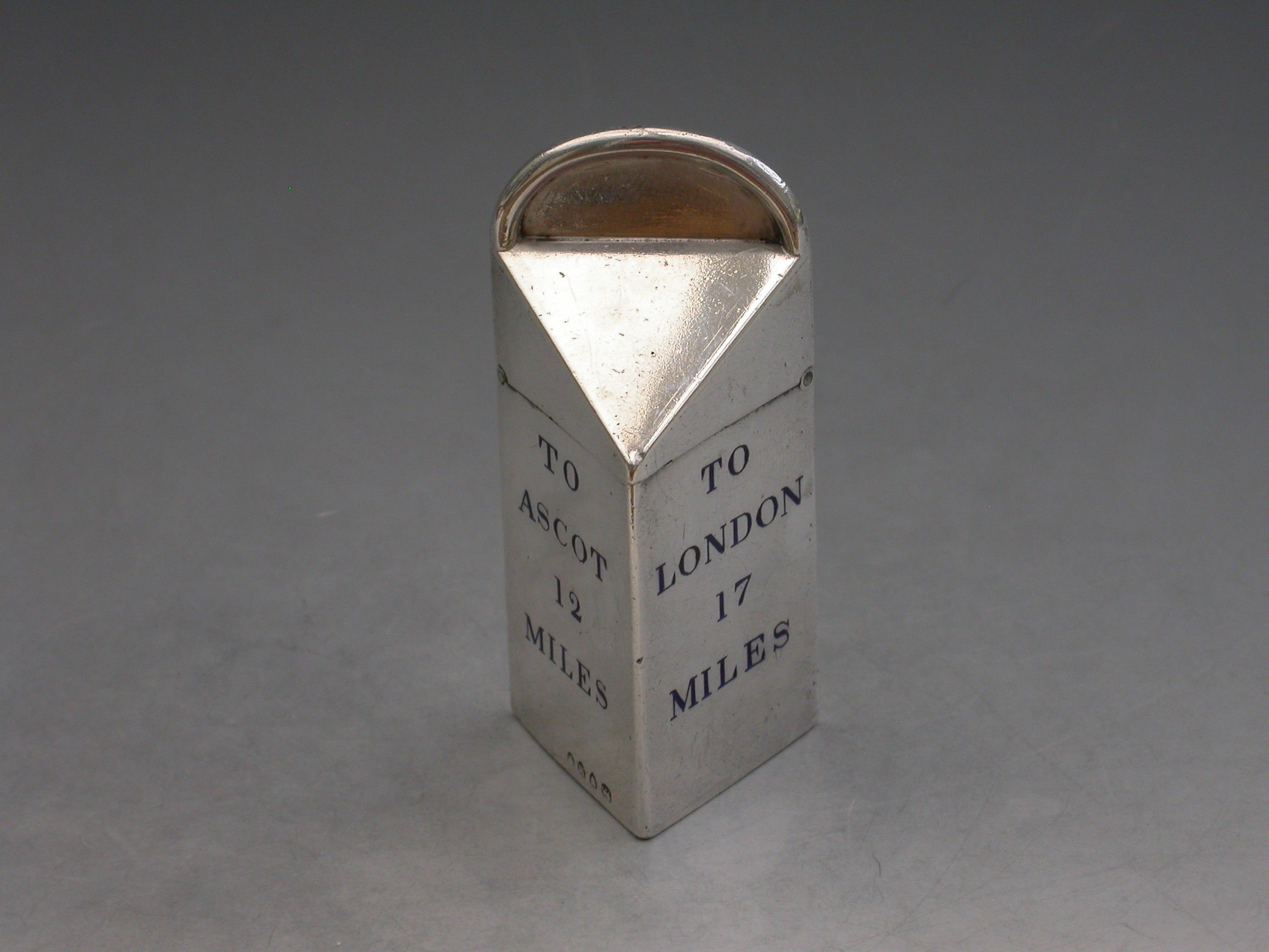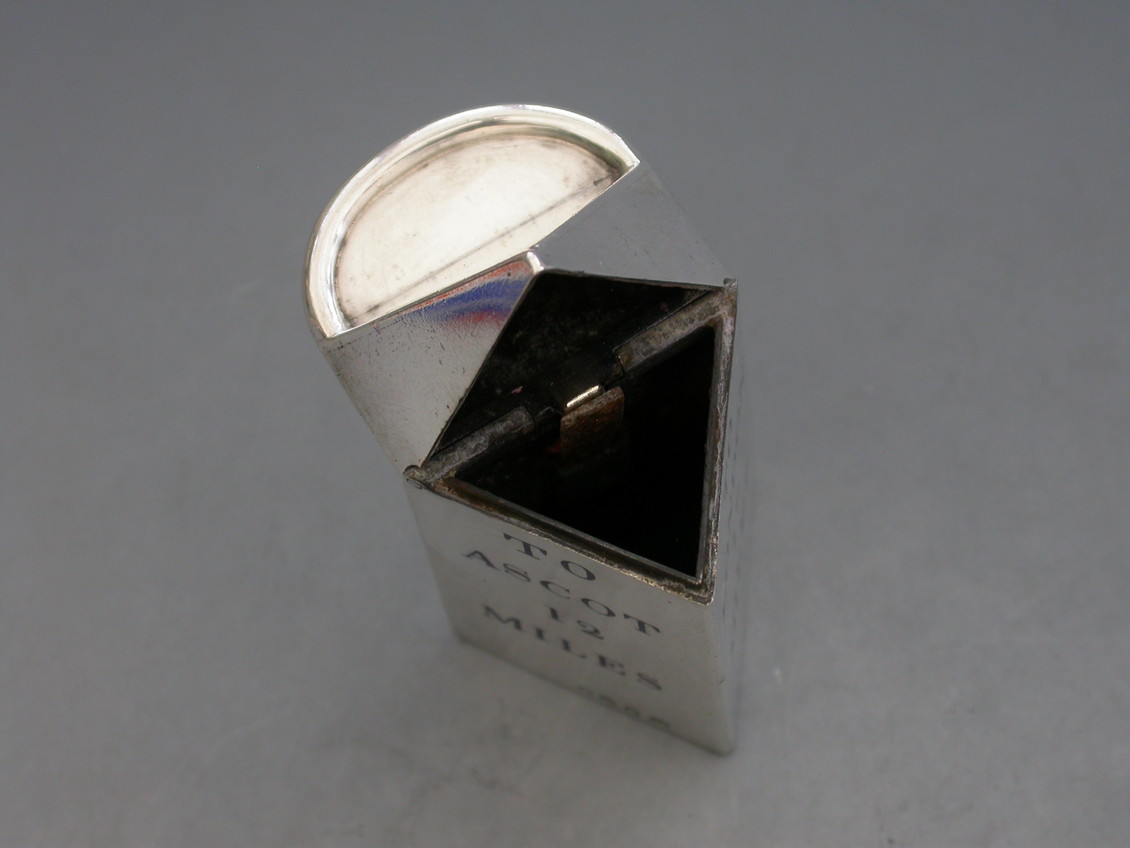 An extremely rare Victorian novelty silver and enamel Vesta Case made in the form of a triangular 'Milestone, with hinged lid and engraved striker to the base. Two sides enamelled with the distances: 'To Ascot 12 Miles' and 'To London 17 miles'.