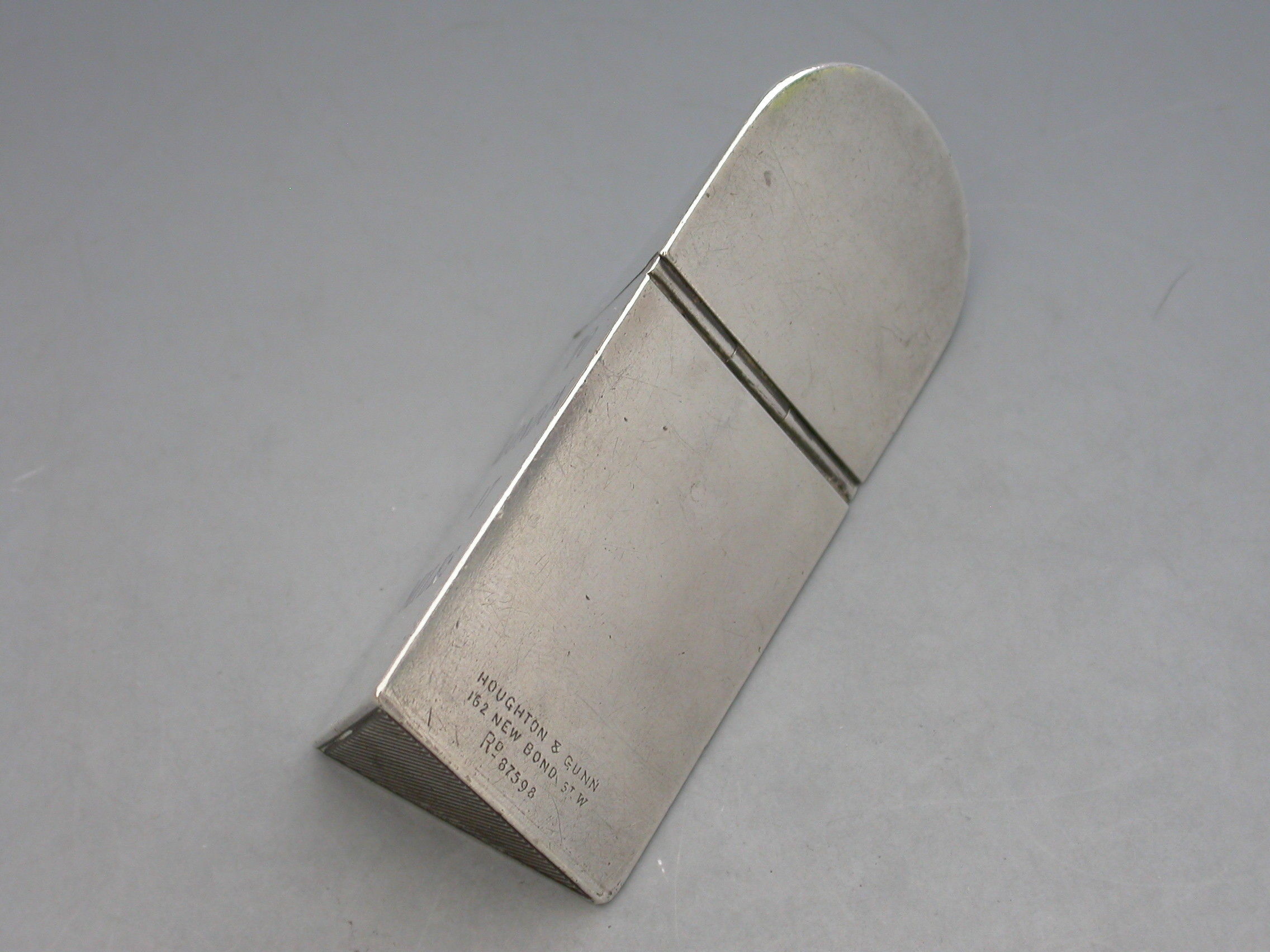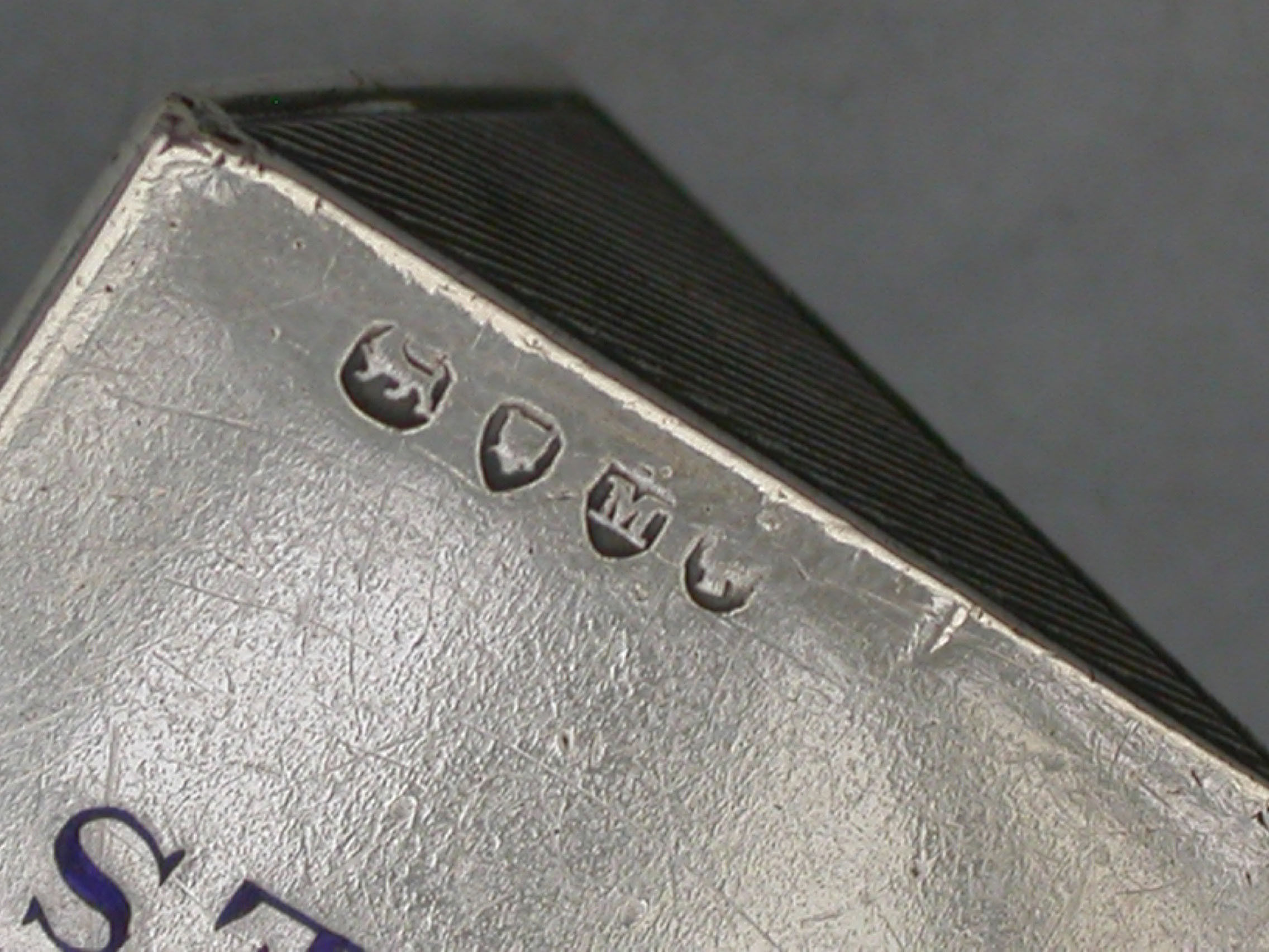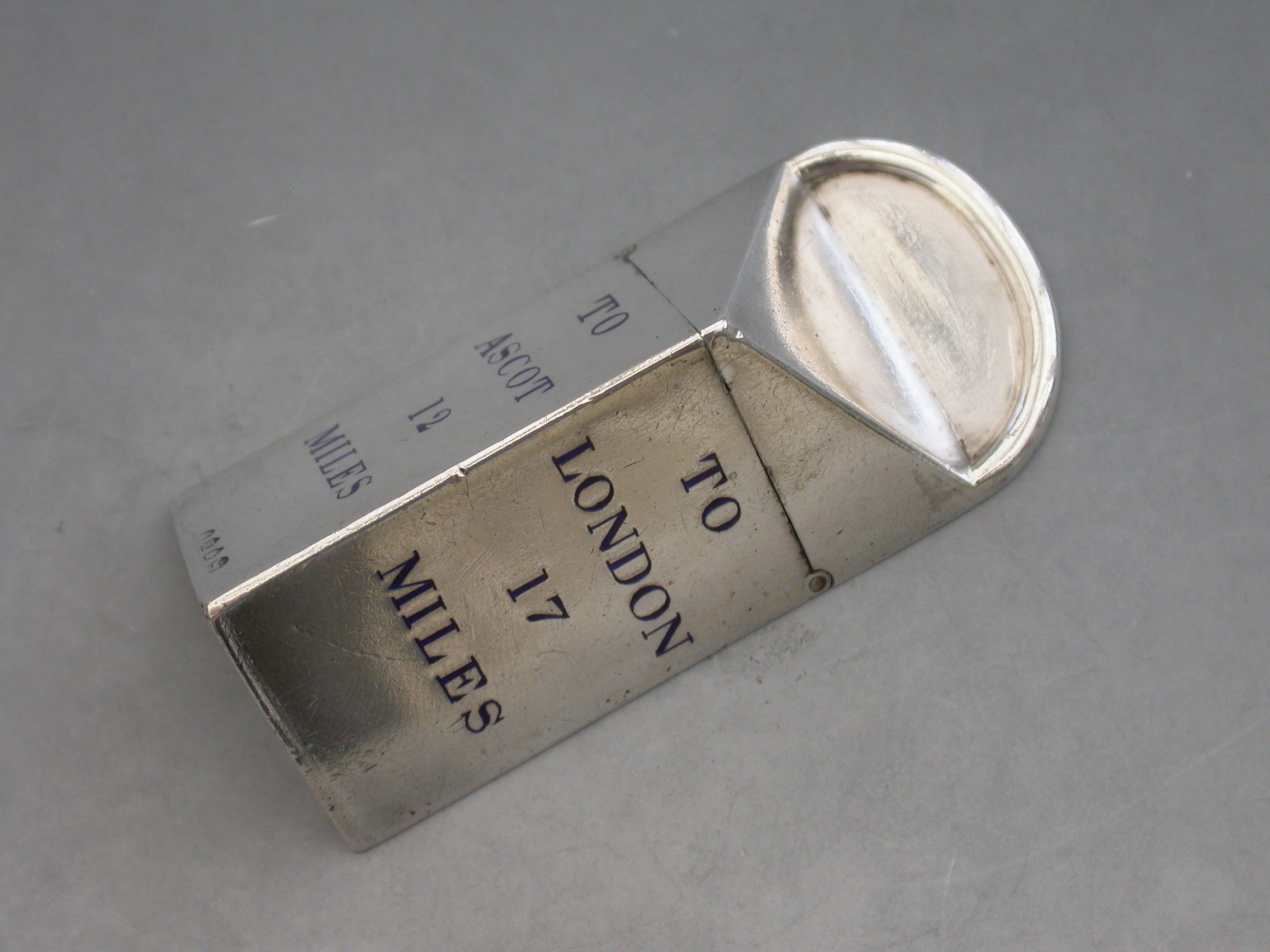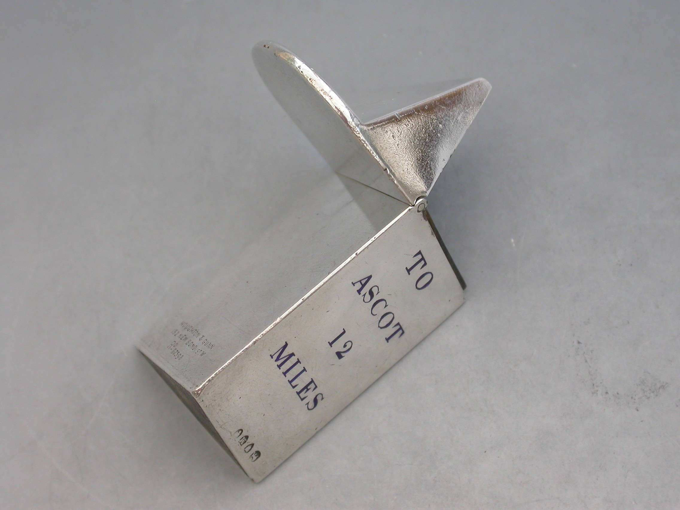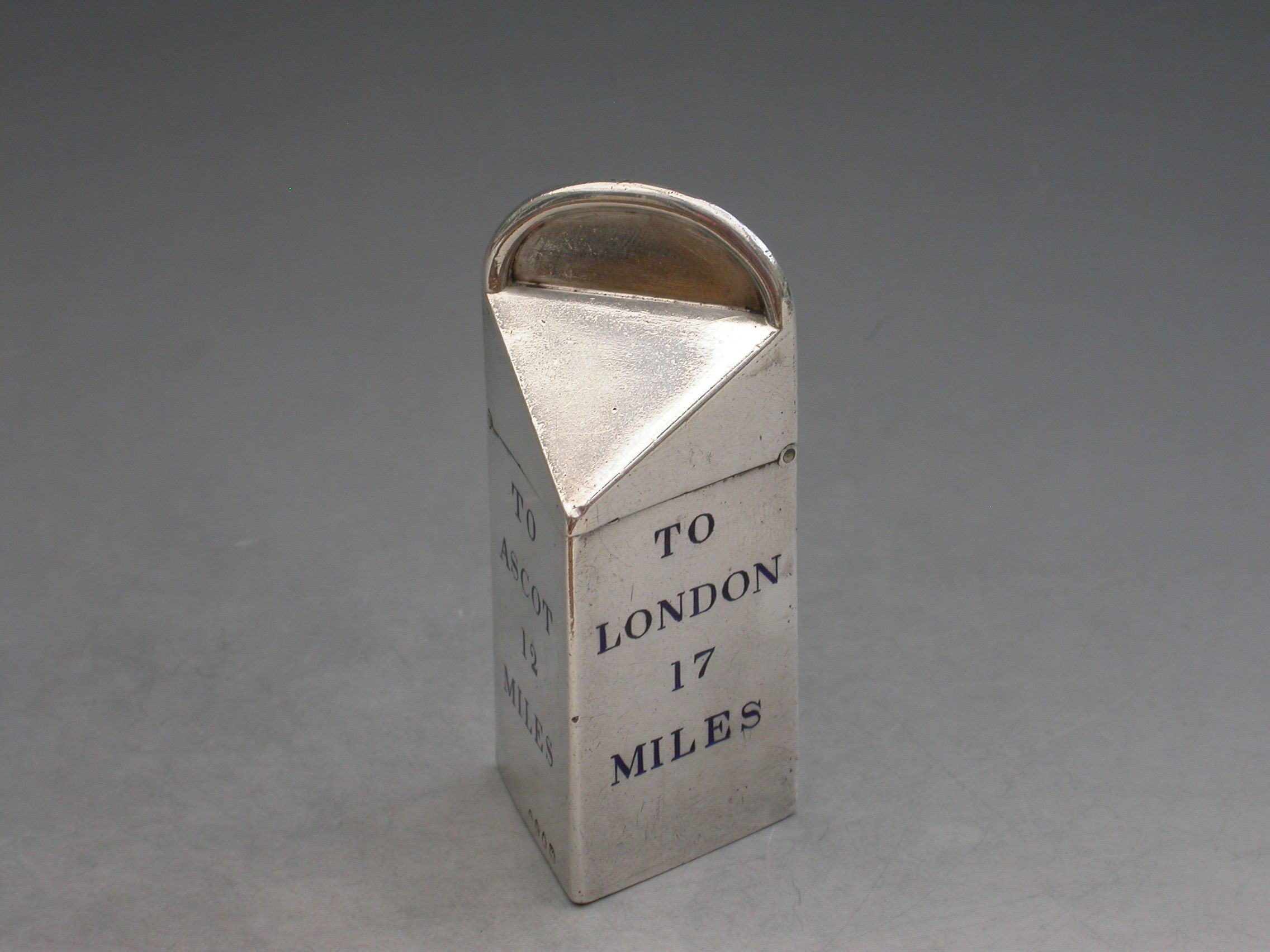 An extremely rare Victorian novelty silver and enamel Vesta Case made in the form of a triangular 'Milestone, with hinged lid and engraved striker to the base. Two sides enamelled with the distances: 'To Ascot 12 Miles' and 'To London 17 miles'.
