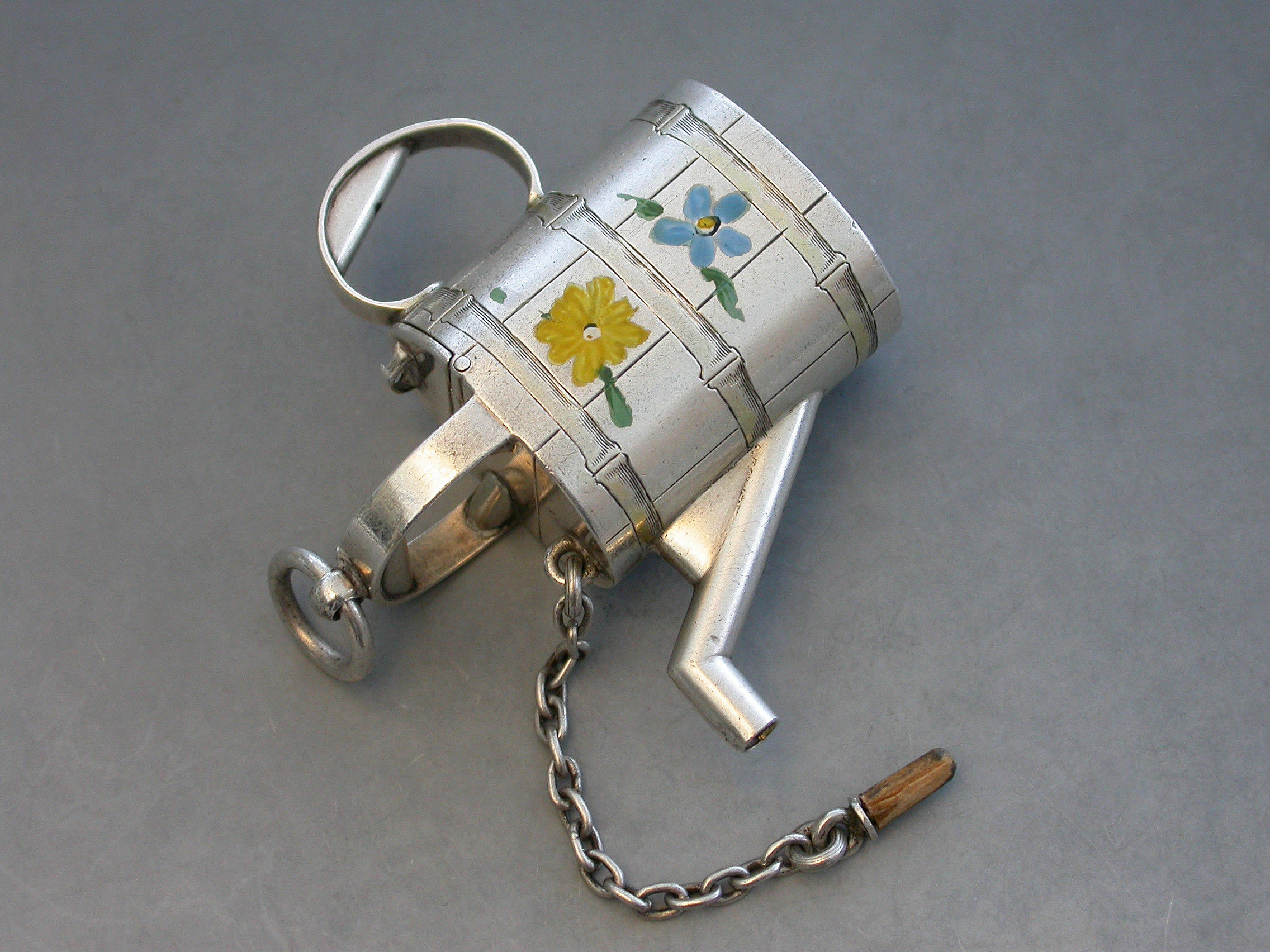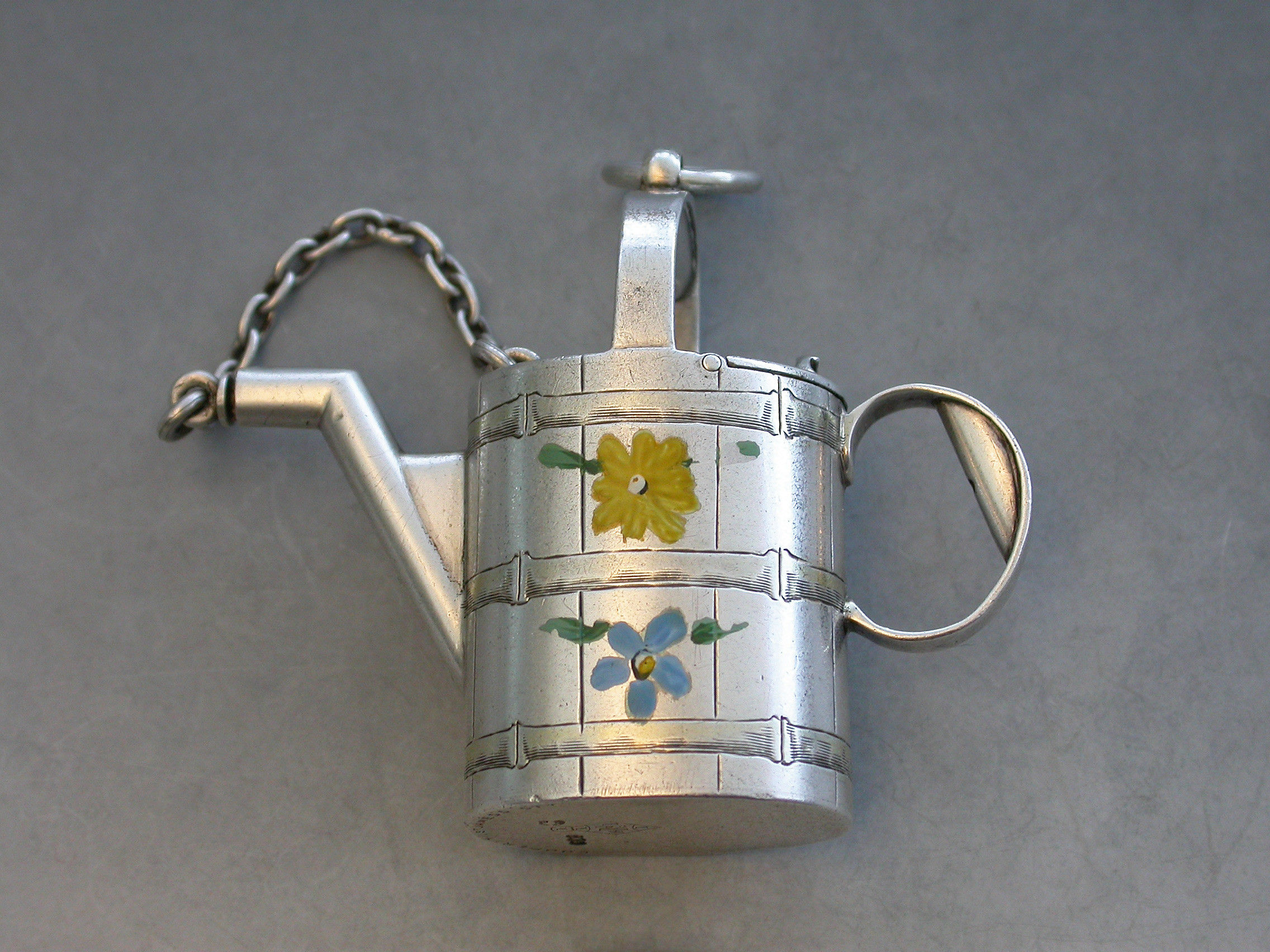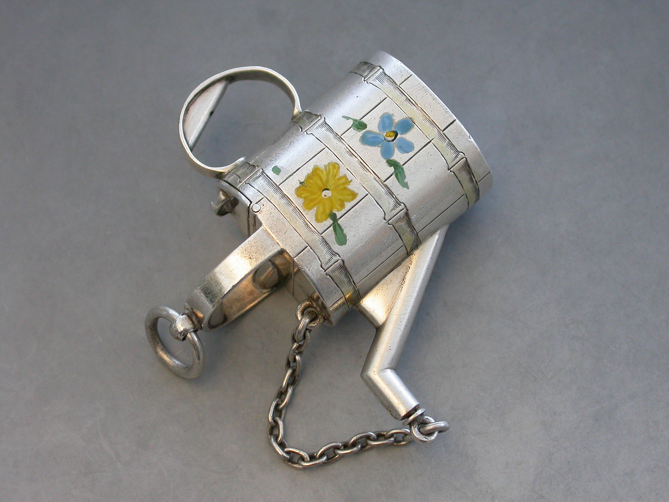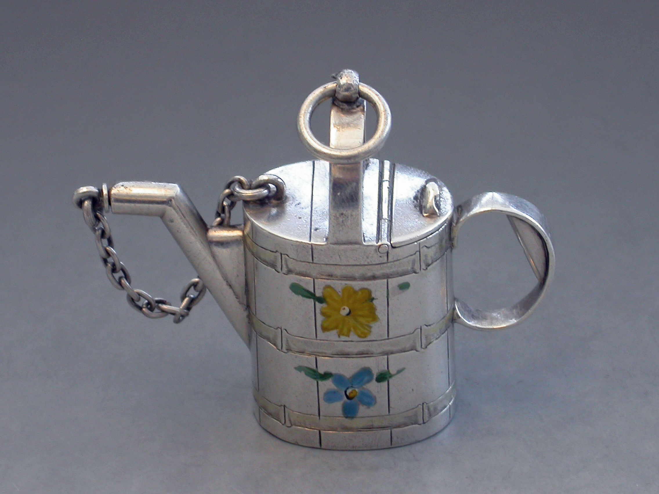 A rare Victorian novelty silver and enamel Watering Can Scent Bottle with hinged lid and cork stopper attached by a chain. The sides possibly later painted with colourful flower heads.