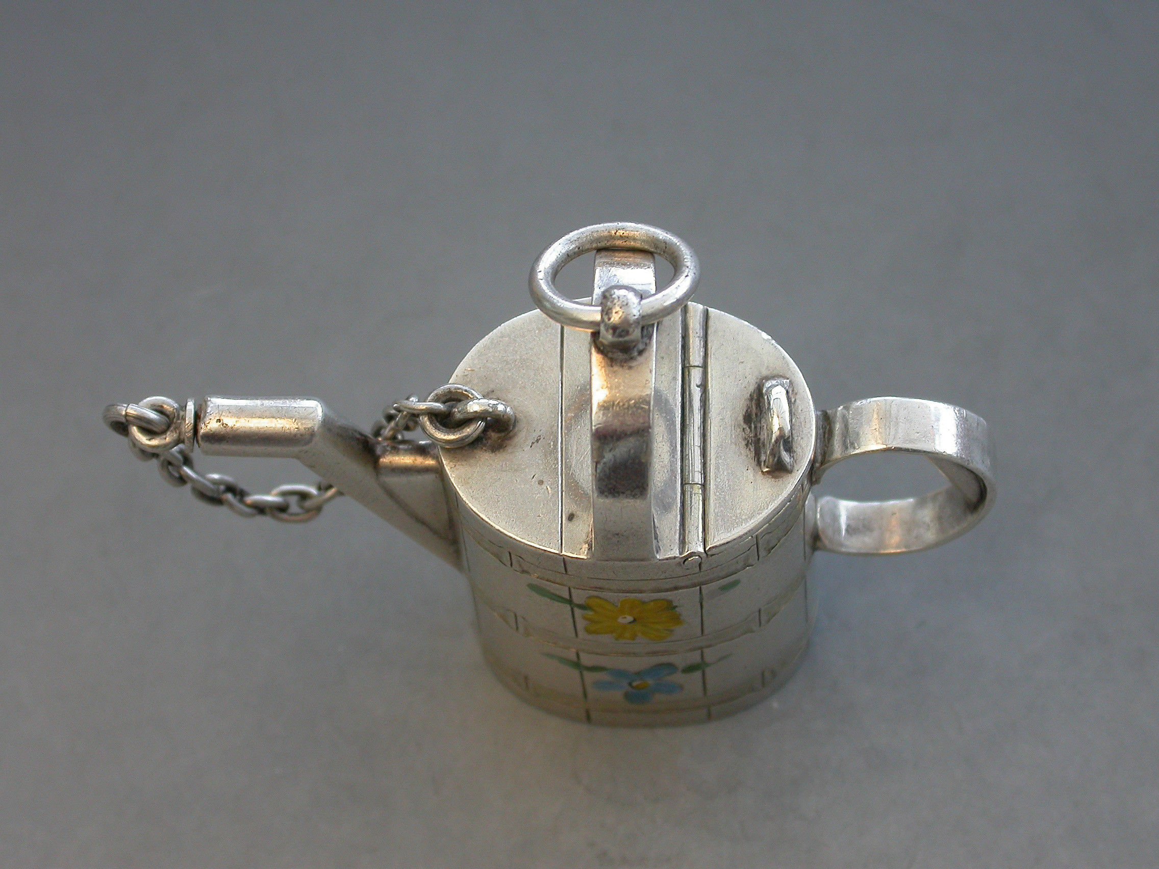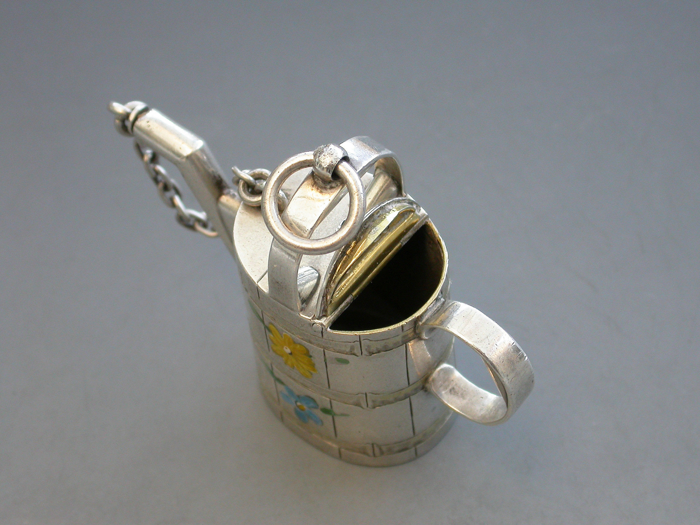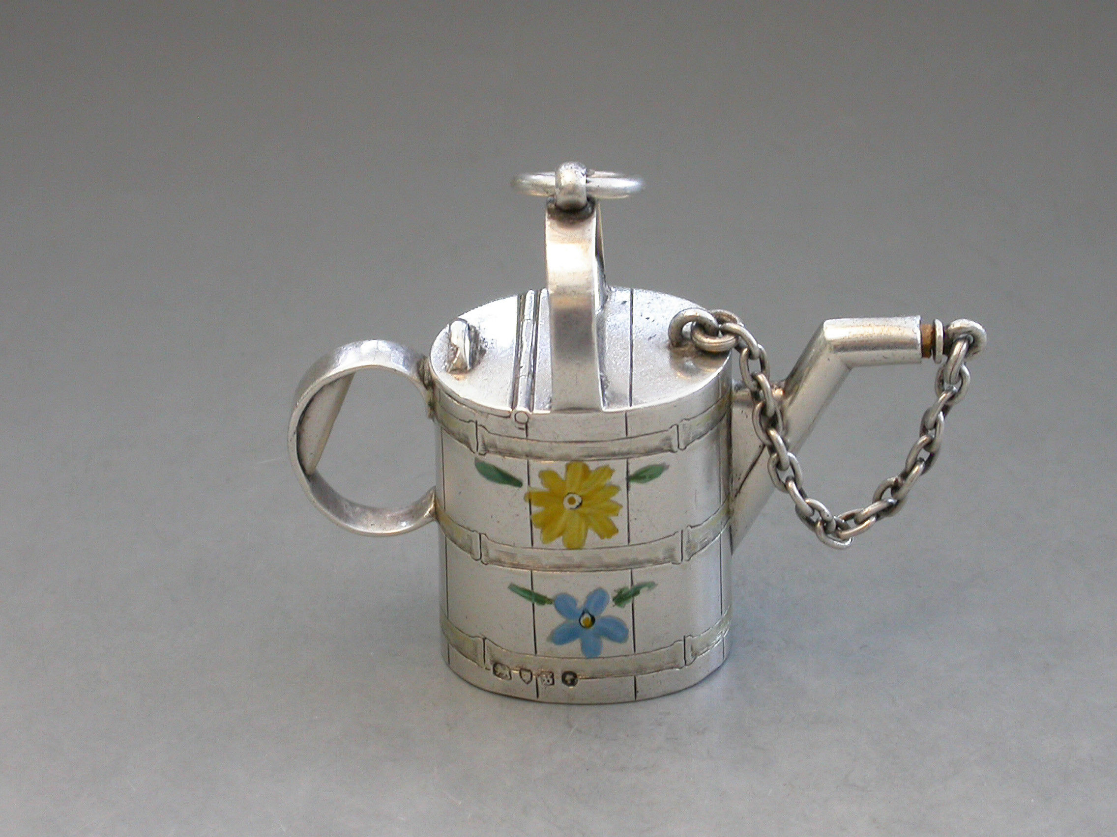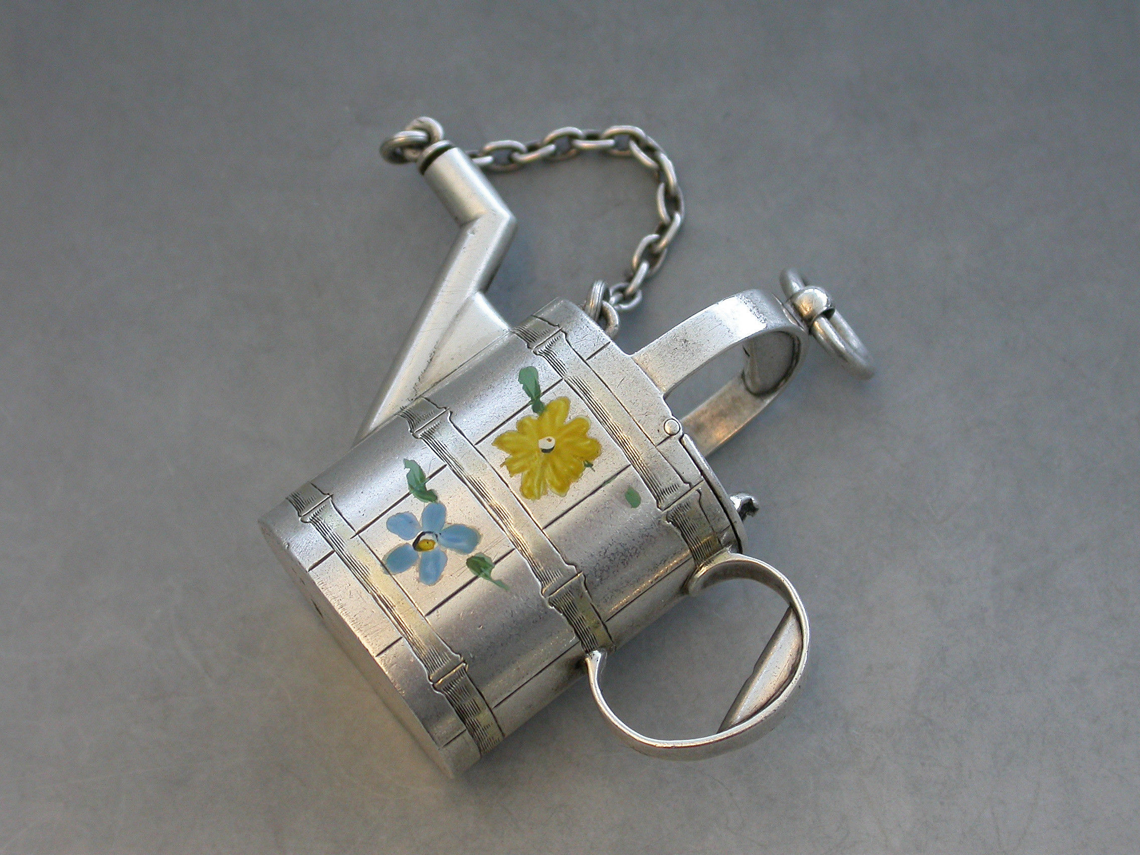 A rare Victorian novelty silver and enamel Watering Can Scent Bottle with hinged lid and cork stopper attached by a chain. The sides possibly later painted with colourful flower heads.