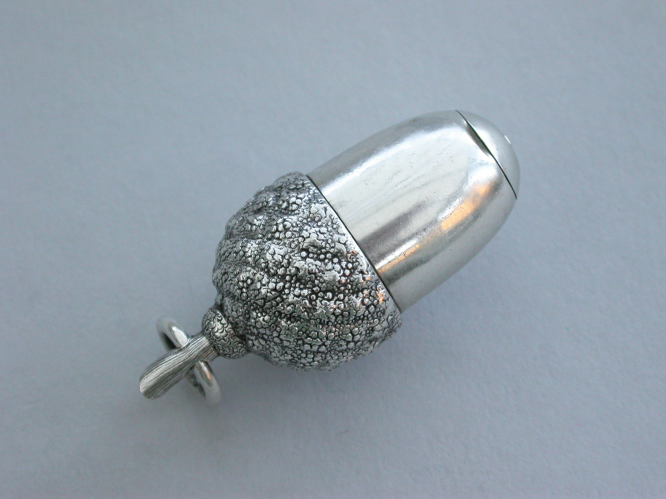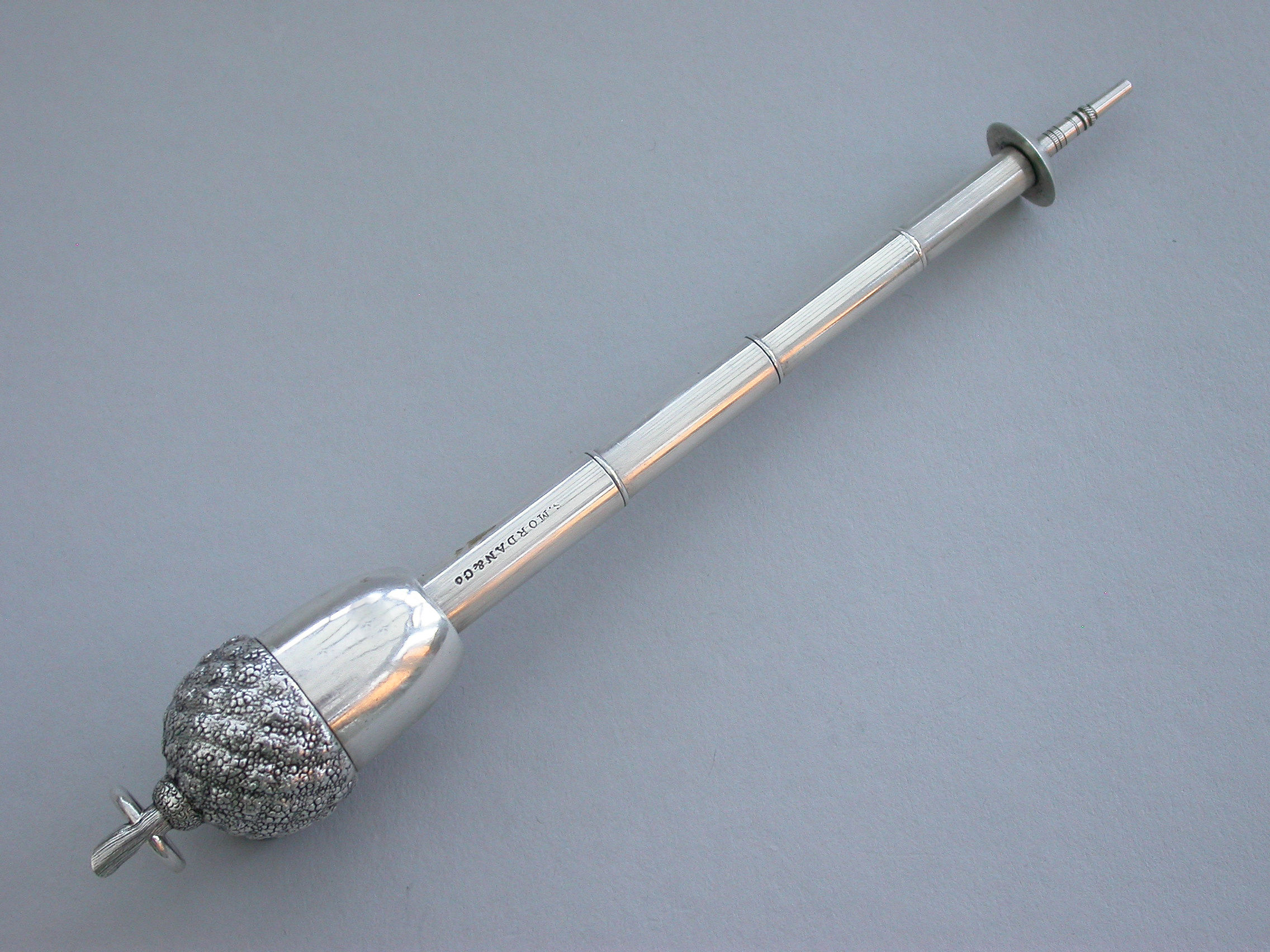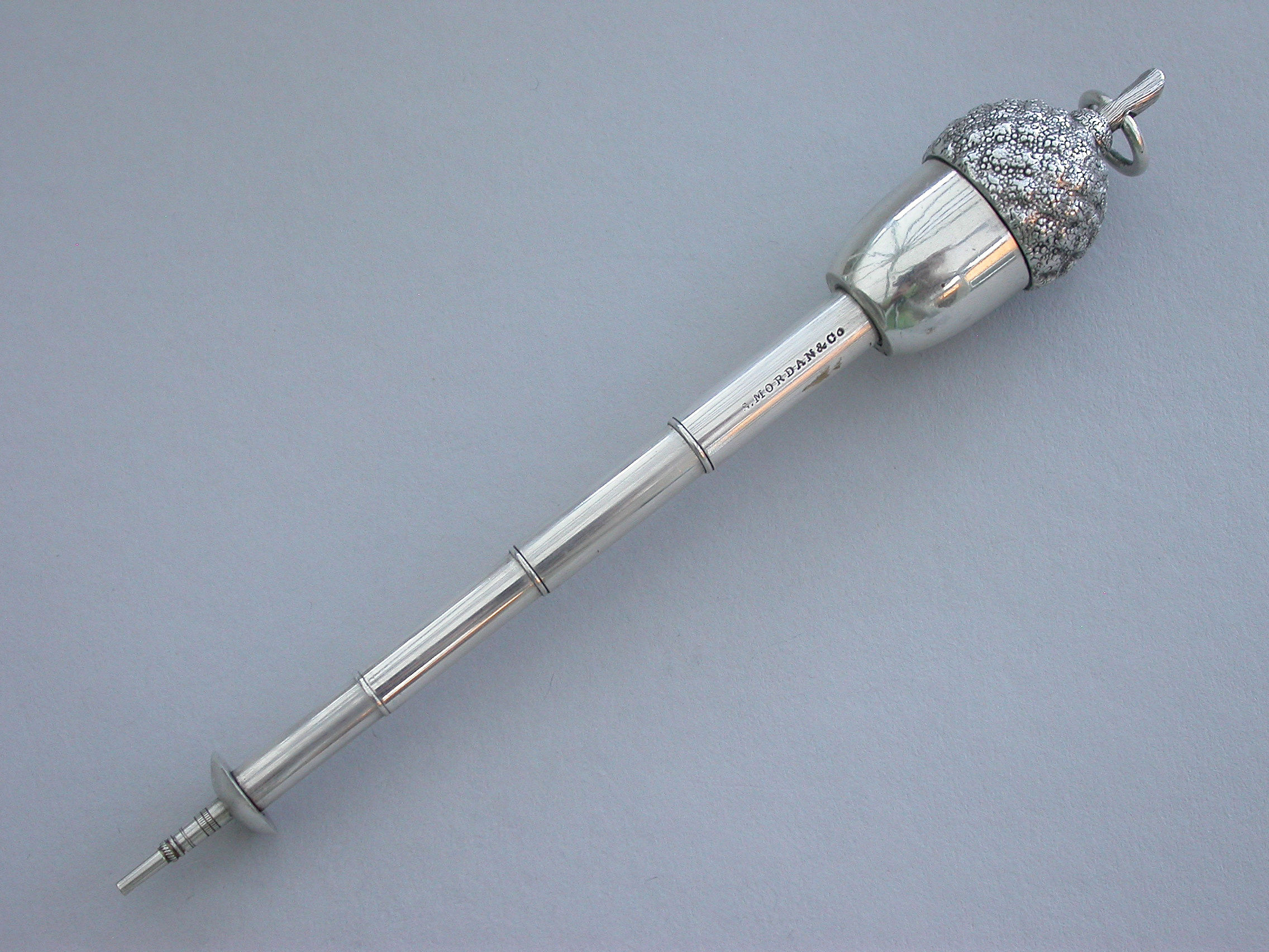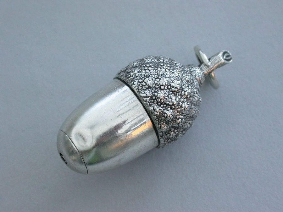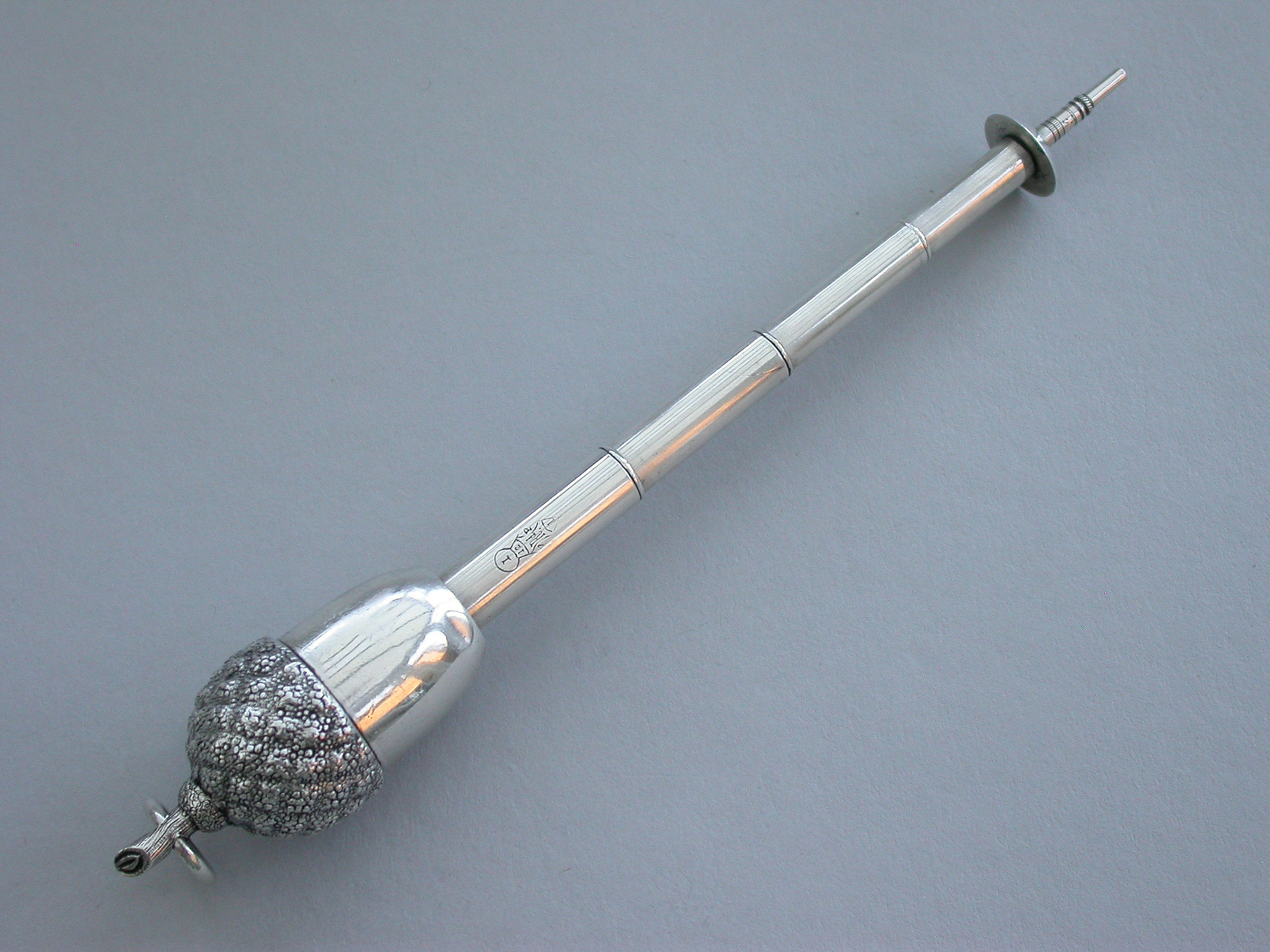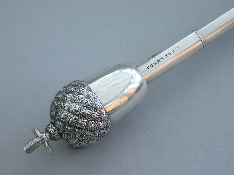 An extremely rare Victorian novelty silver telescopic Propelling Pencil made in the form of an acorn with 4-drawer telescopic mechanism and of a registered design, the twig handle with attached suspension ring.