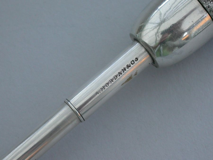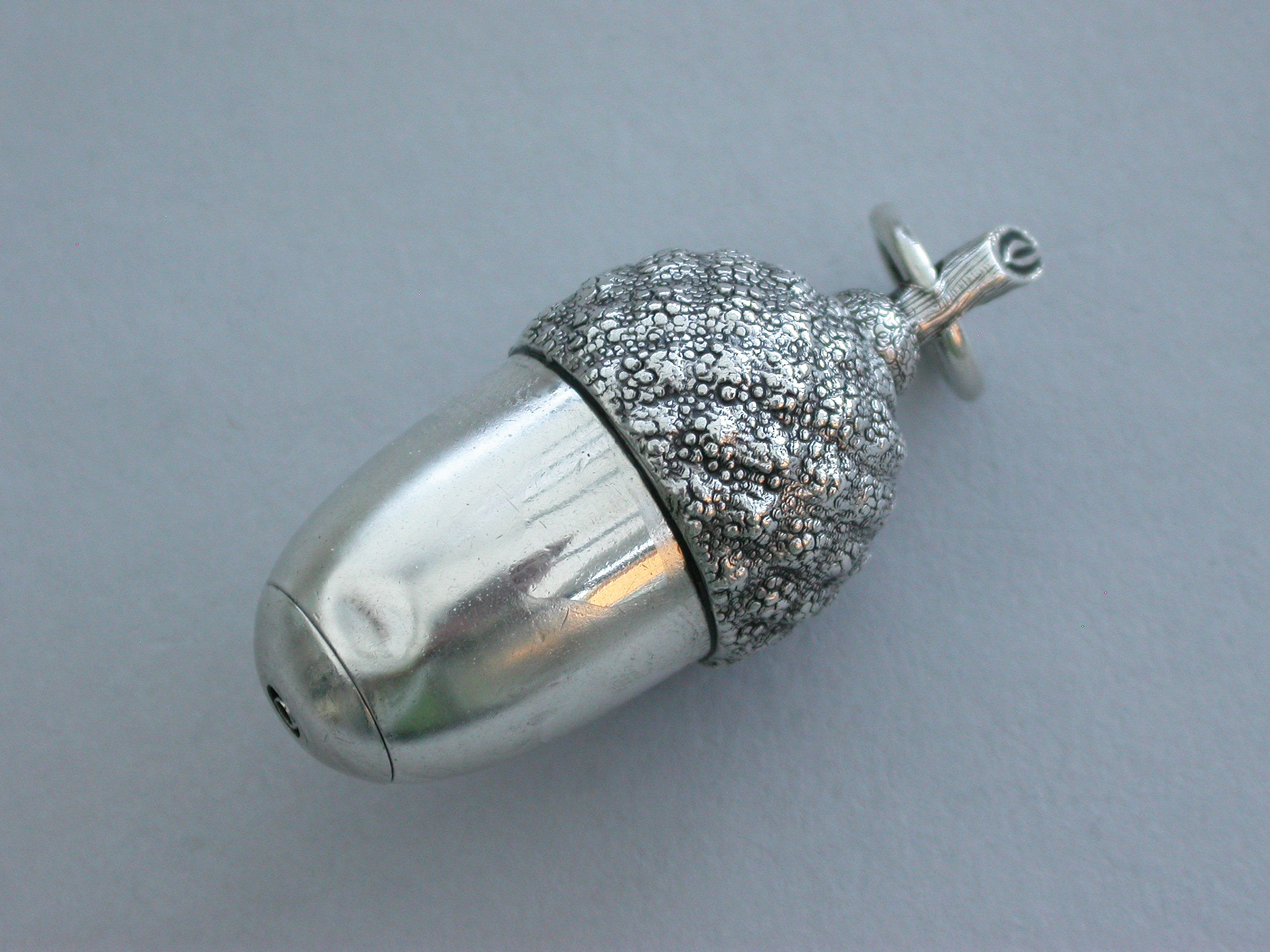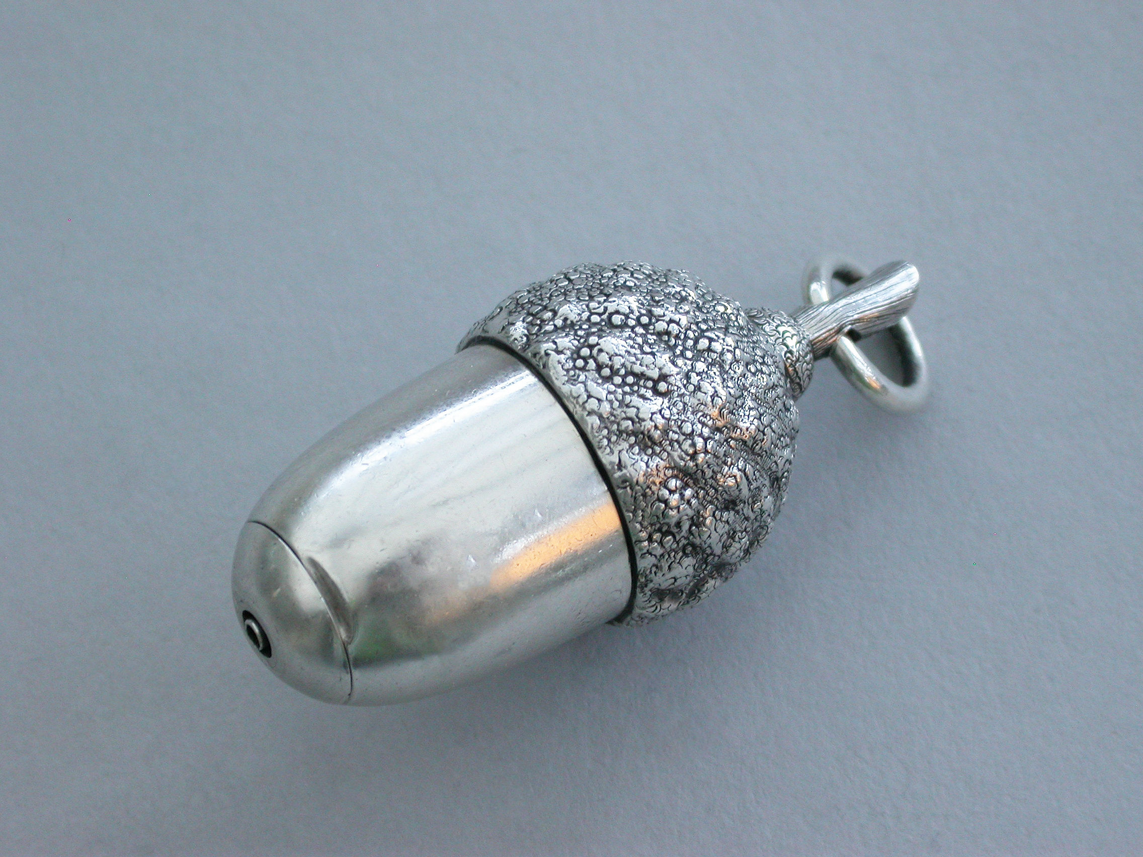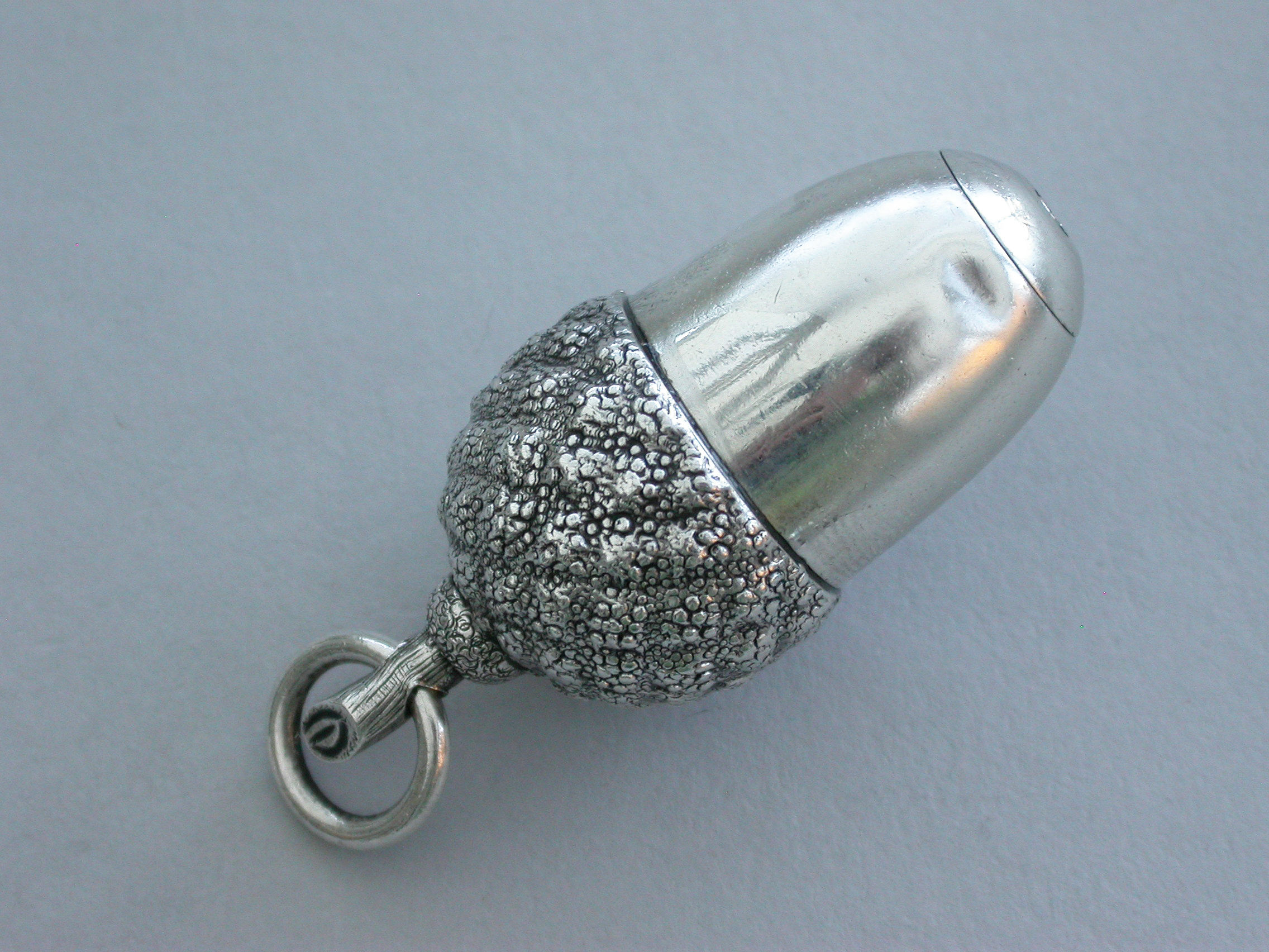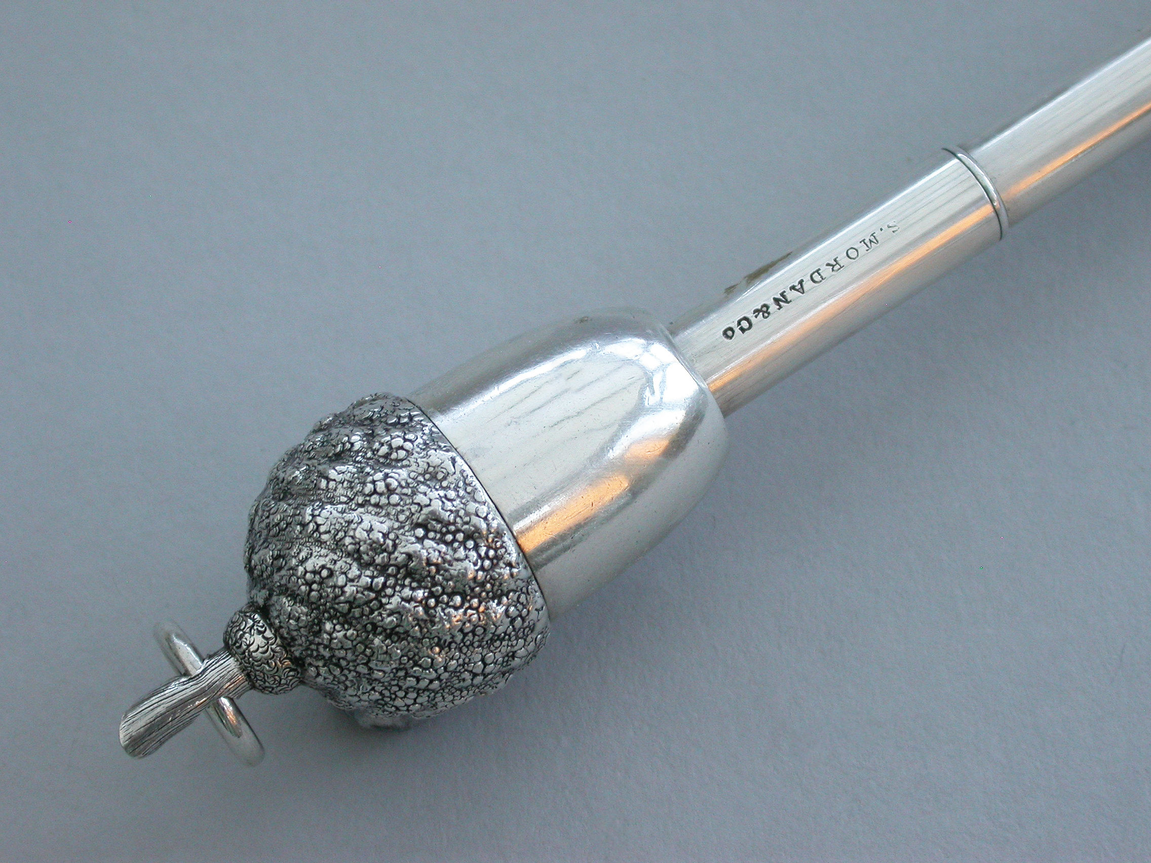 An extremely rare Victorian novelty silver telescopic Propelling Pencil made in the form of an acorn with 4-drawer telescopic mechanism and of a registered design, the twig handle with attached suspension ring.