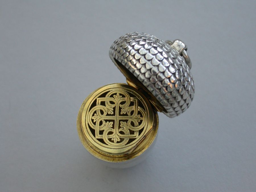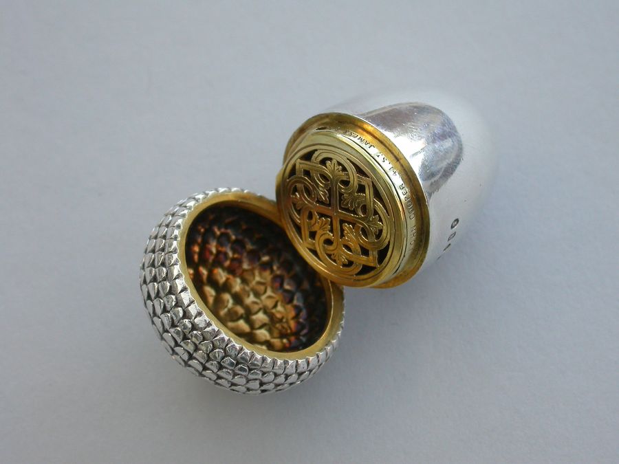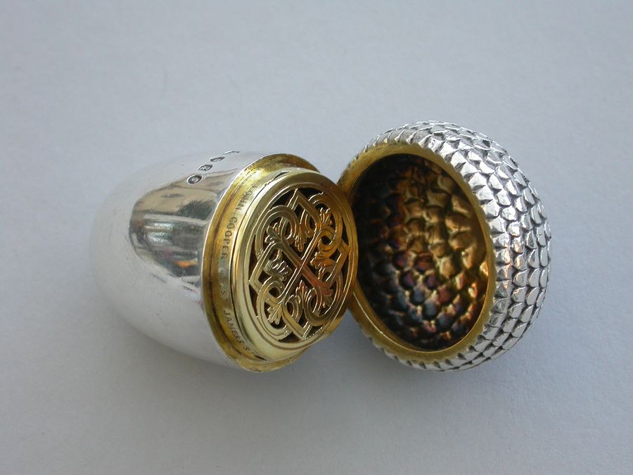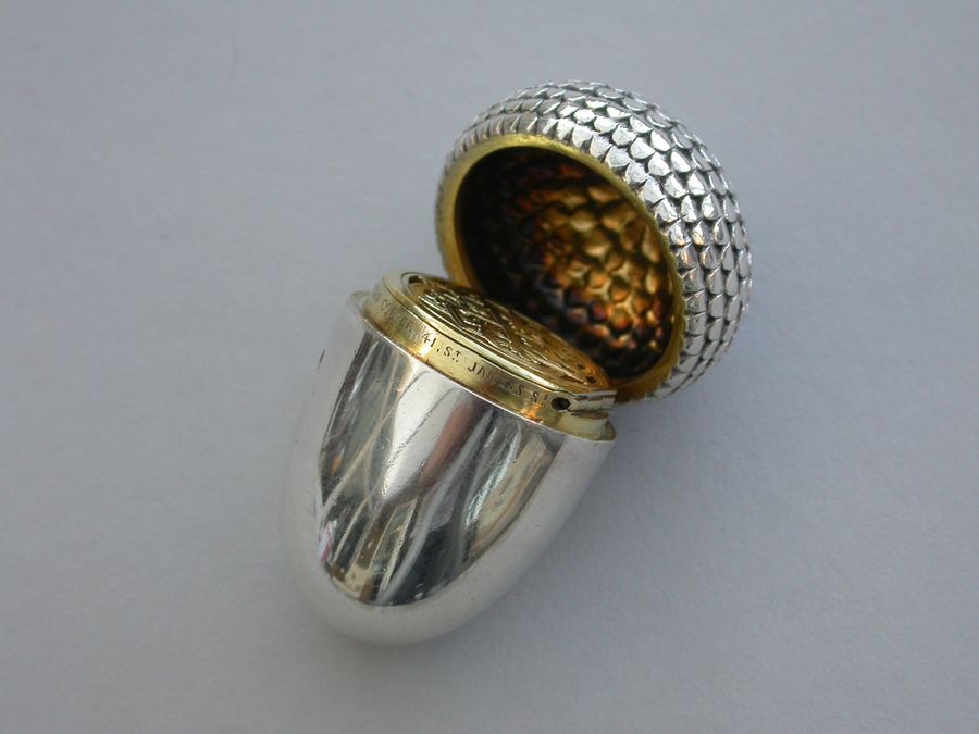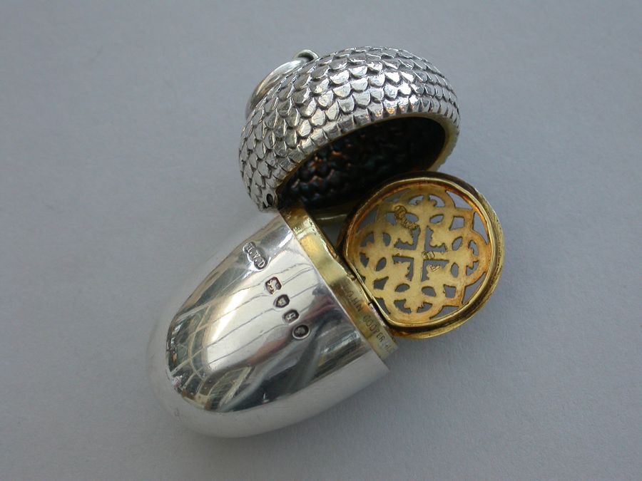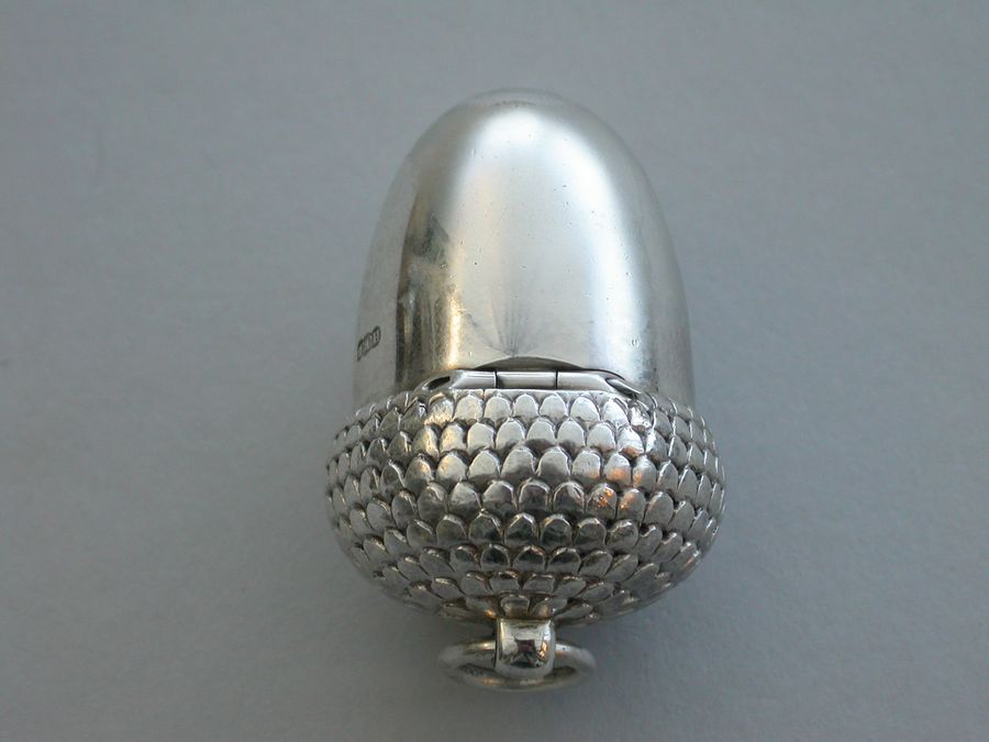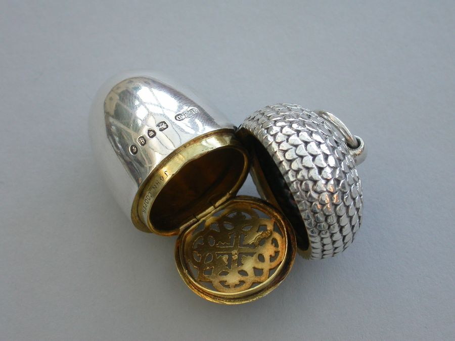 A good Victorian novelty silver Vinaigrette made in the form of an Acorn, the chased cup forming the cover with attached suspension ring, the body perfectly plain and forming the nut. The silver gilt interior with pierced hinged grille with Celtic style decoration.