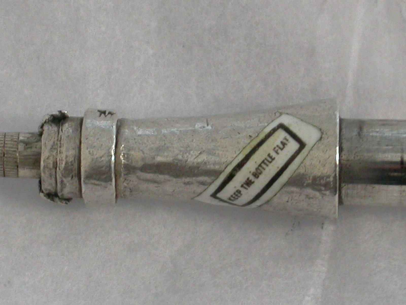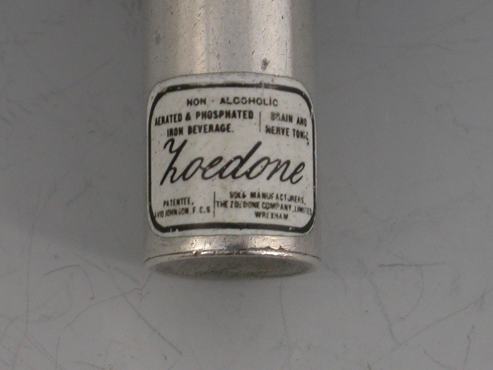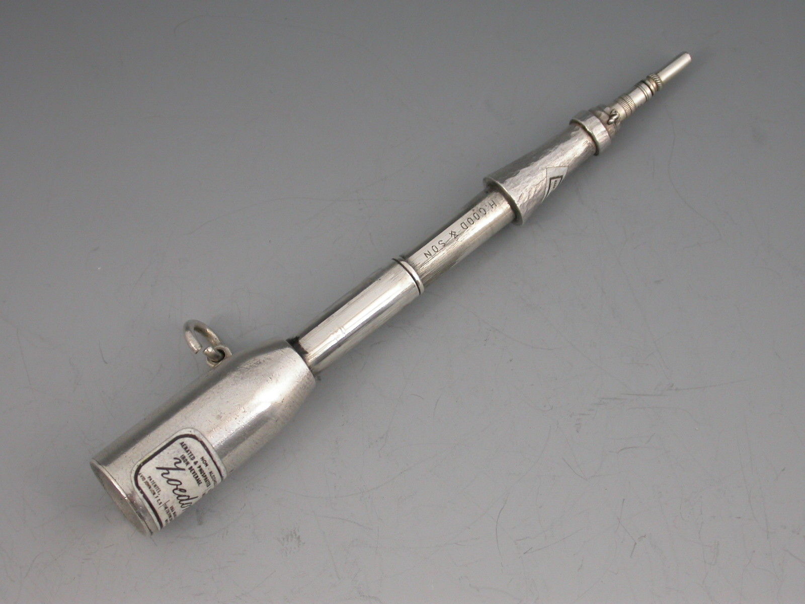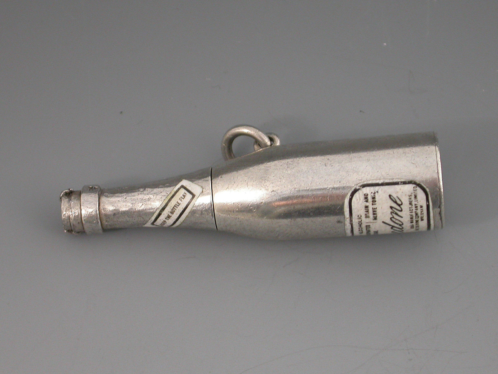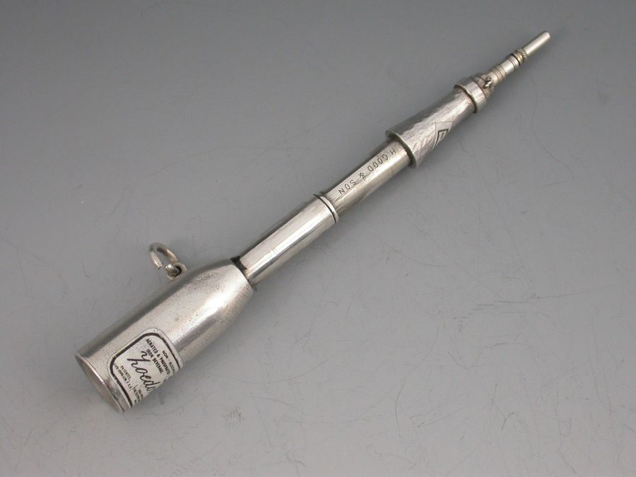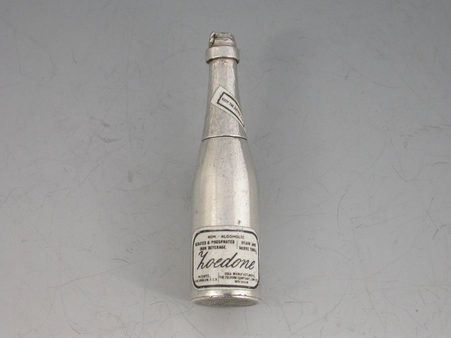 An extremely rare novelty silver and enamel telescopic Propelling Pencil formed as a bottle with attached suspension ring. The inset enamel label reads ""Non Alcoholic Aerated Phosphated Iron Beverage - Brain and Nerve Tonic - LOEDONE - Patentee, David Johnson FCS - Sole Manufacturers, The Loedone Company Ltd, Wrexham"". An additional enamel label to the neck which reads ""Keep The Bottle Flat"". Two drawer telescopic opening mechanism.