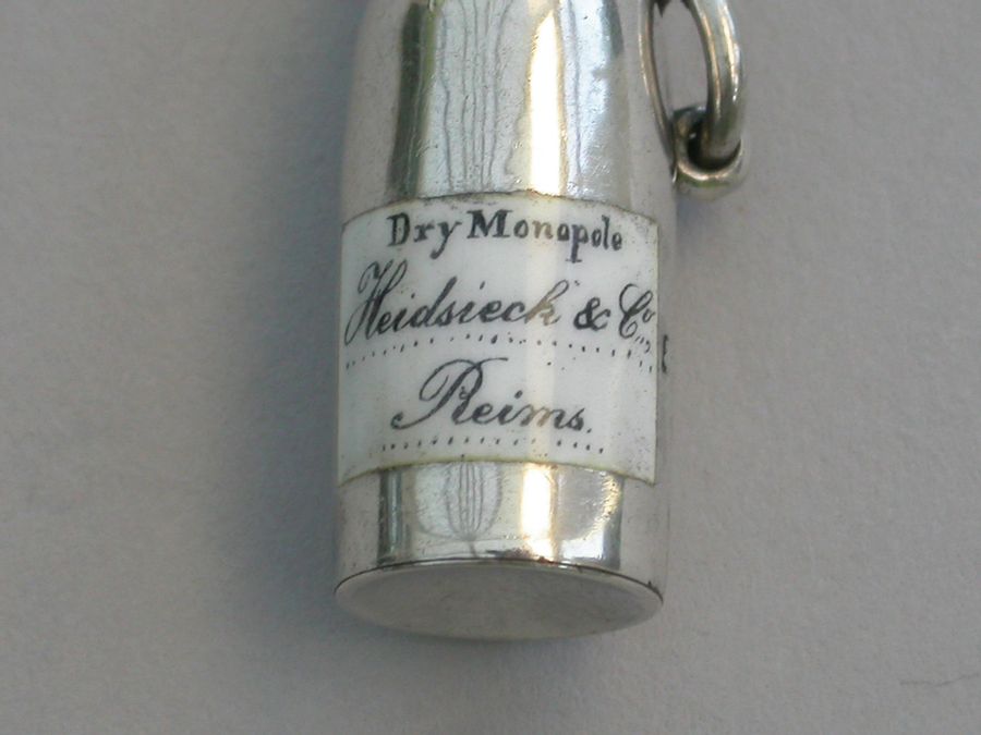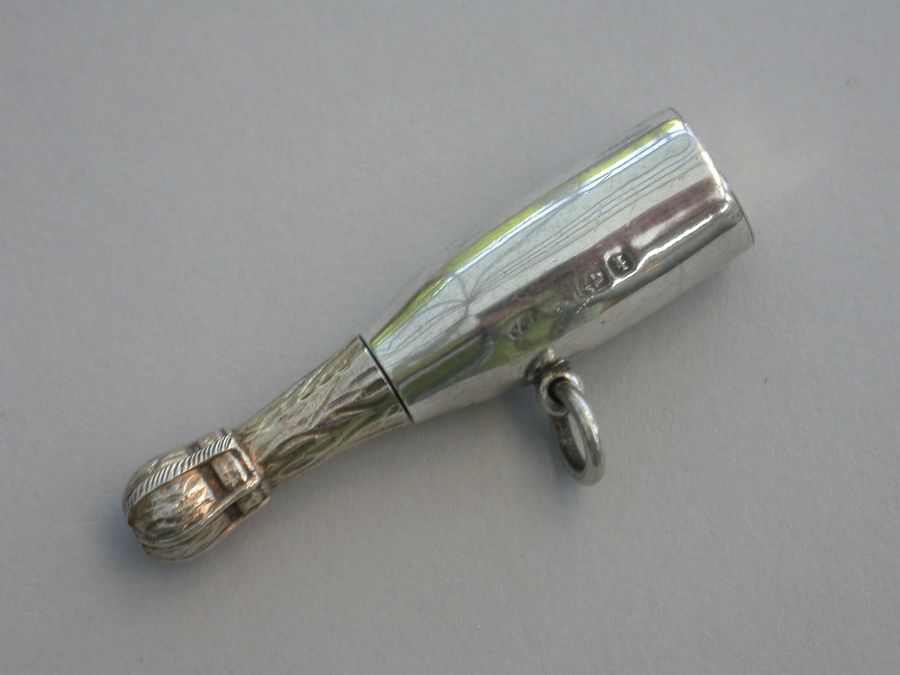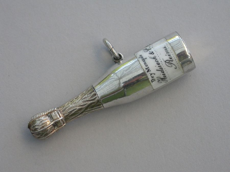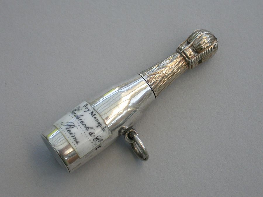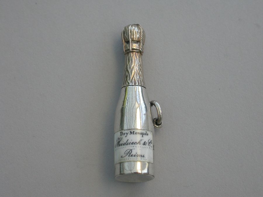 A rare Victorian novelty silver and enamel telescopic Propelling Pencil made in the form of a Champagne Bottle with attached suspension ring, gilded neck and cork, the enamel label for Heidsieck & Co Dry Monopole Reims.