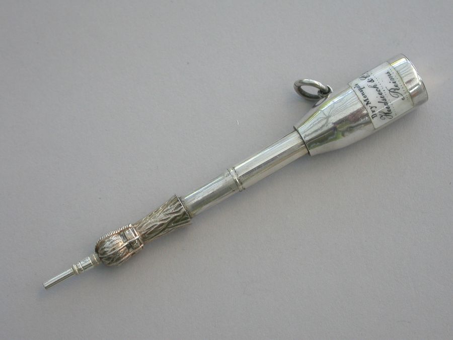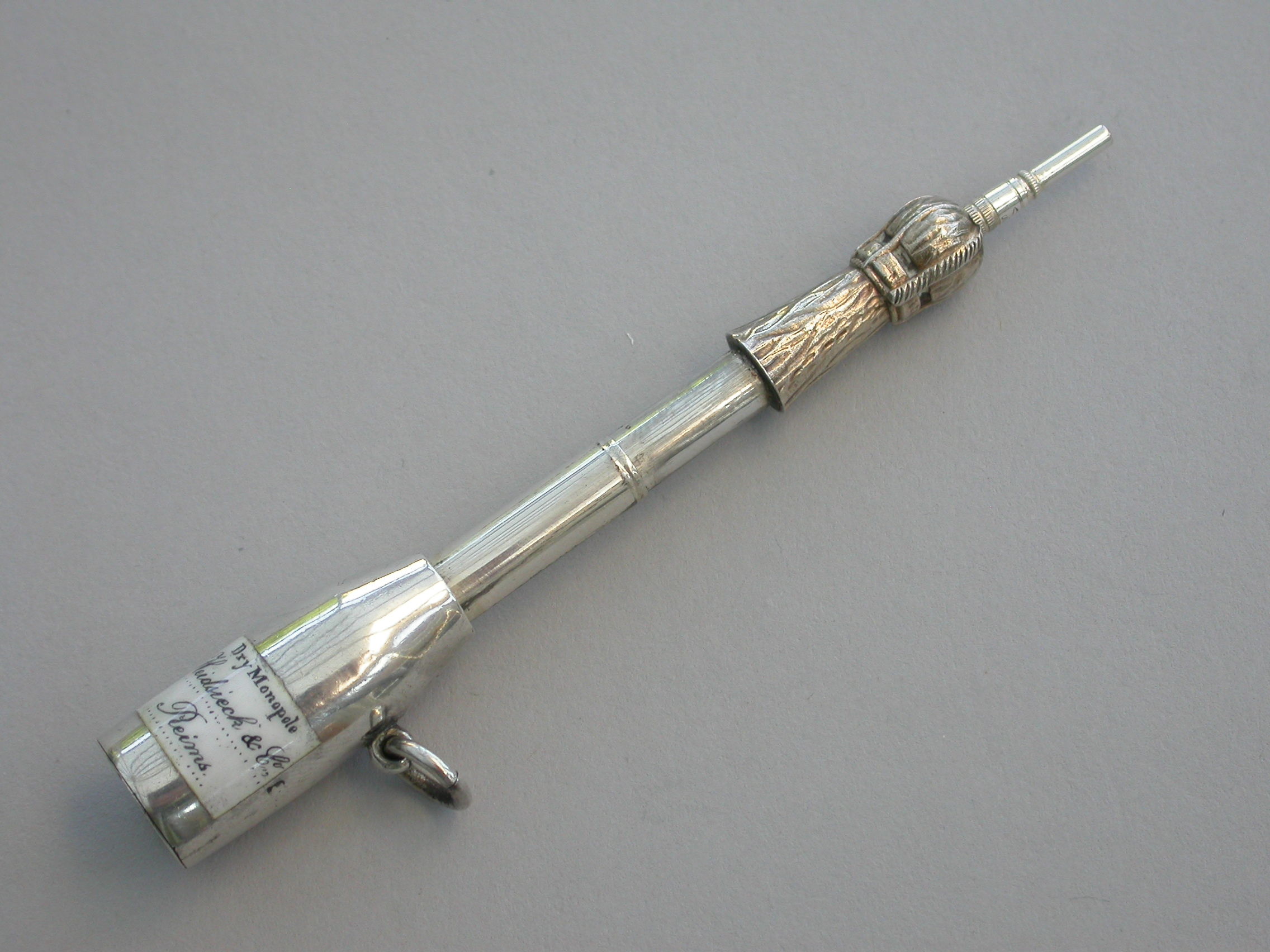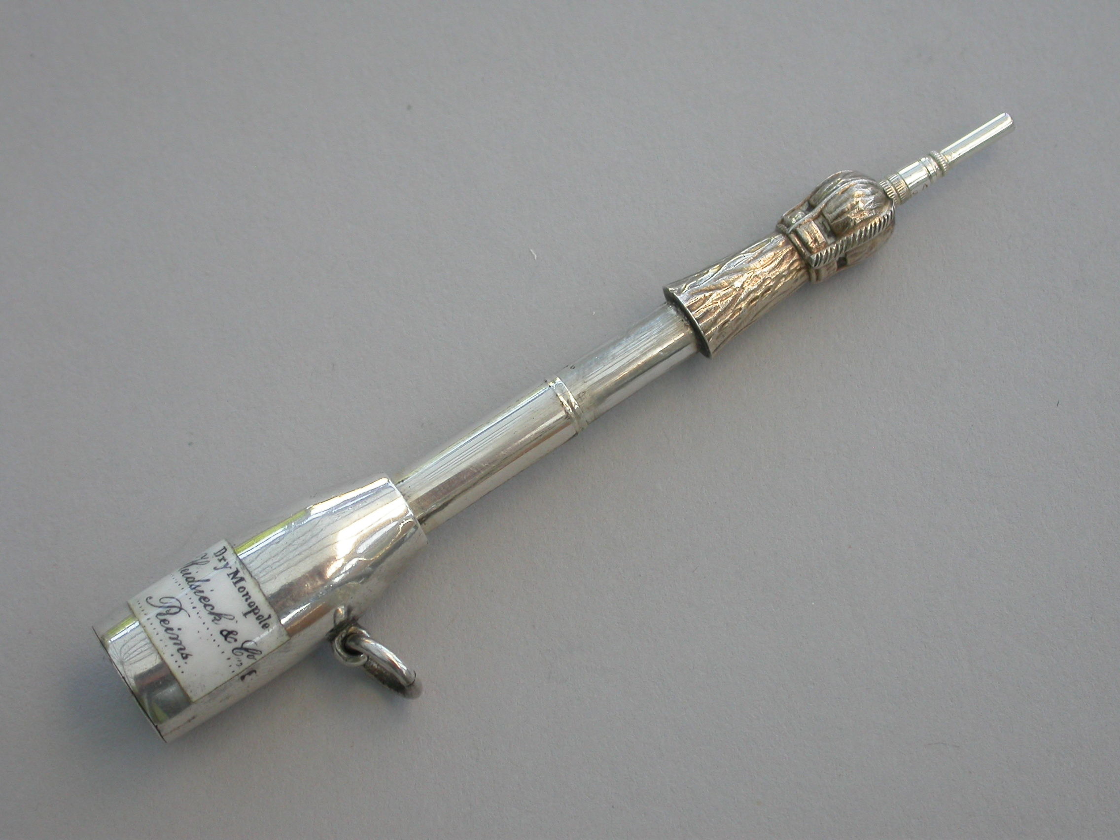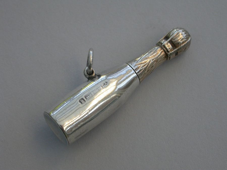 A rare Victorian novelty silver and enamel telescopic Propelling Pencil made in the form of a Champagne Bottle with attached suspension ring, gilded neck and cork, the enamel label for Heidsieck & Co Dry Monopole Reims.