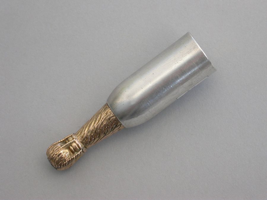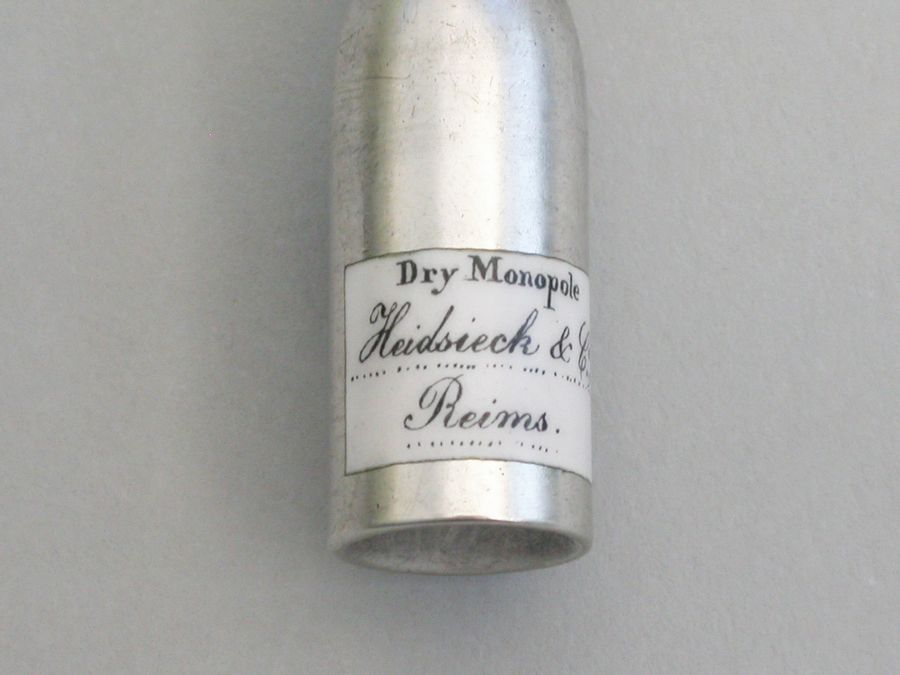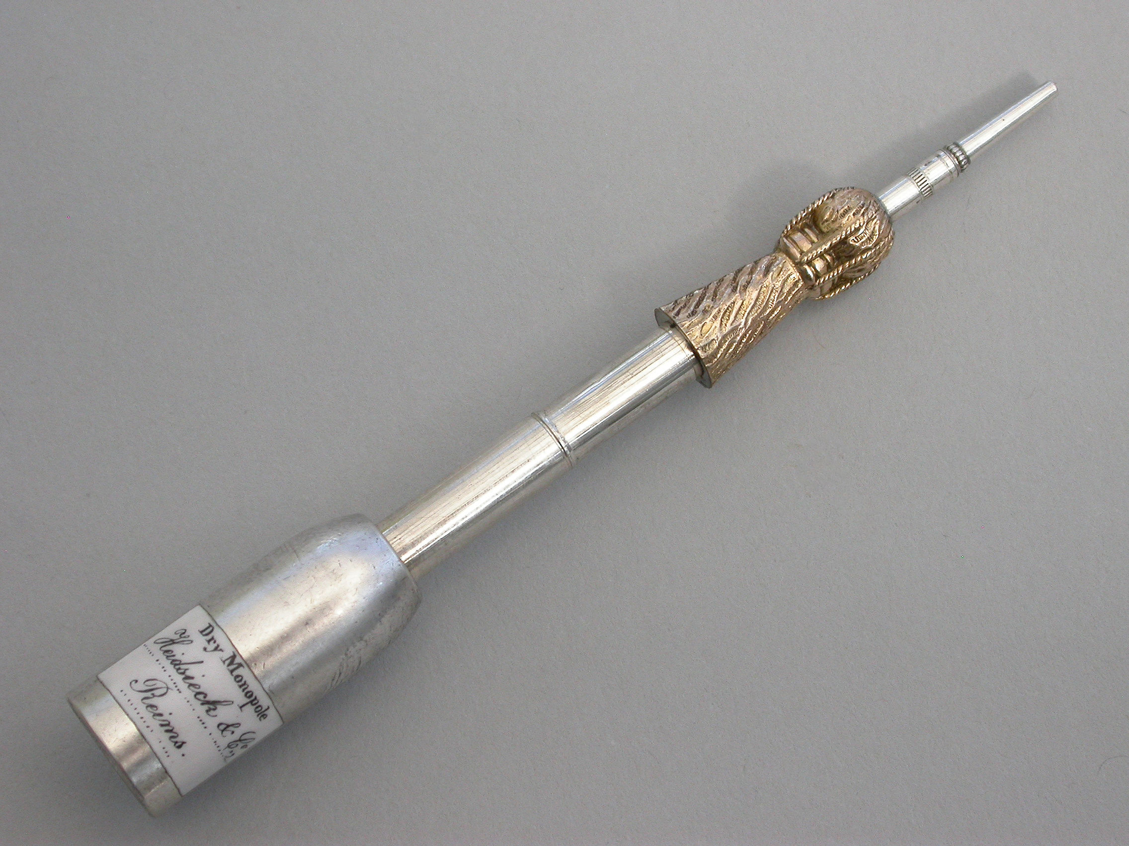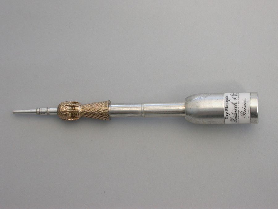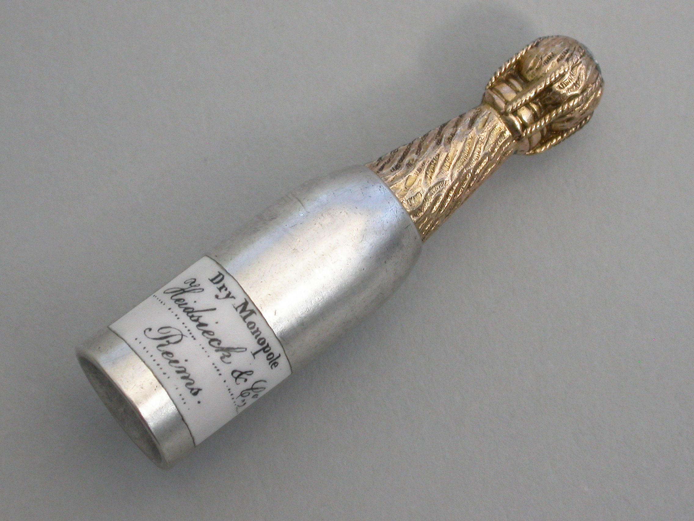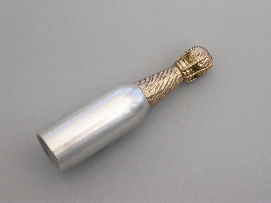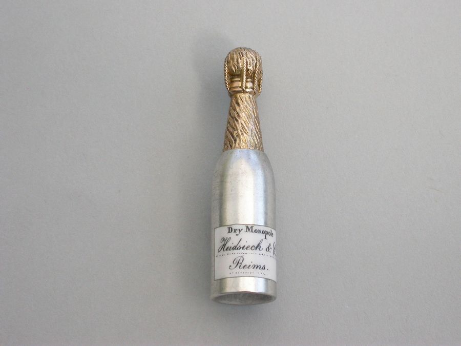 A rare Victorian Novelty silver Propelling Pencil modeled as a champagne bottle, with gilded top to imitate the foil and applied black and white enameled label for 'Heidssieck & Co, Reims'.
