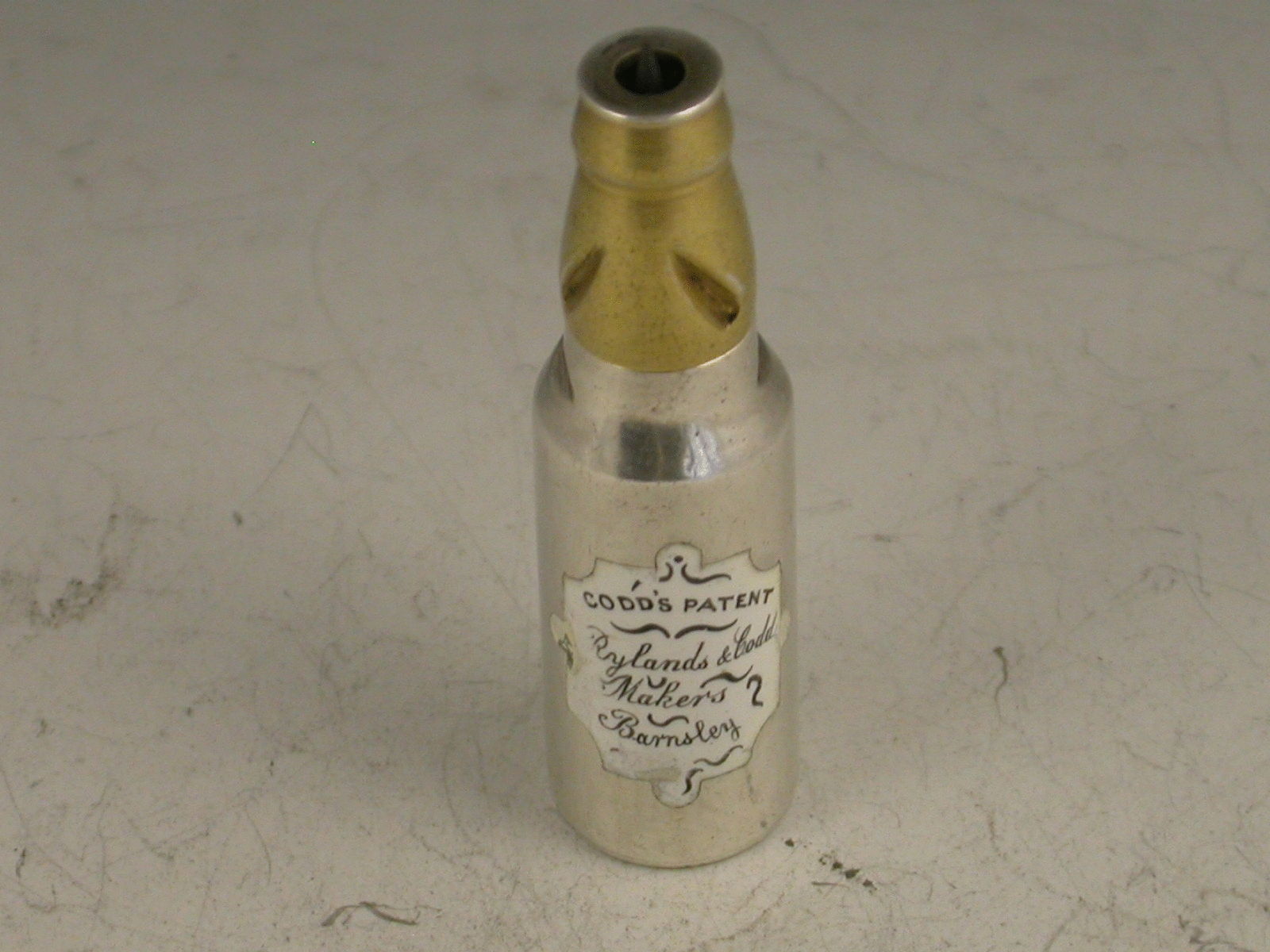 Codd style bottles are readily identified by their marble stopper. The Codd bottle was filled upside down so that as soon the filling stopped, the stopper was forced down to seal the bottle against the rubber ring. Pressure inside the bottle would keep the marble pressed against the top of the bottle. To open the bottle, the marble was pressed down where it would fall into the neck chamber below. If the bottle is held the right way, the marble stays inside the chamber when the bottle is tilted up for drinking. Many of these bottles were destroyed when children would routinely break open the bottle to get the marble inside.